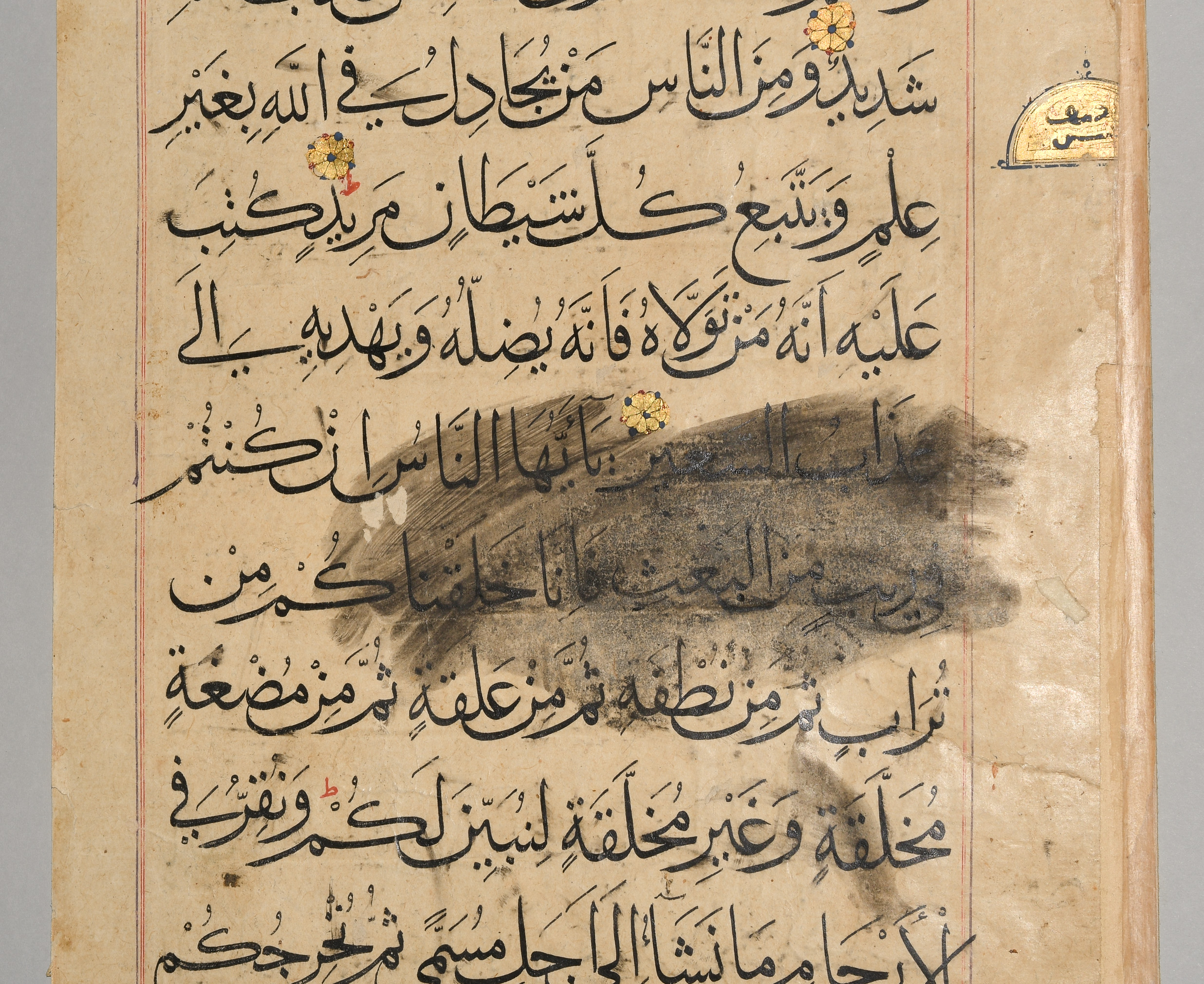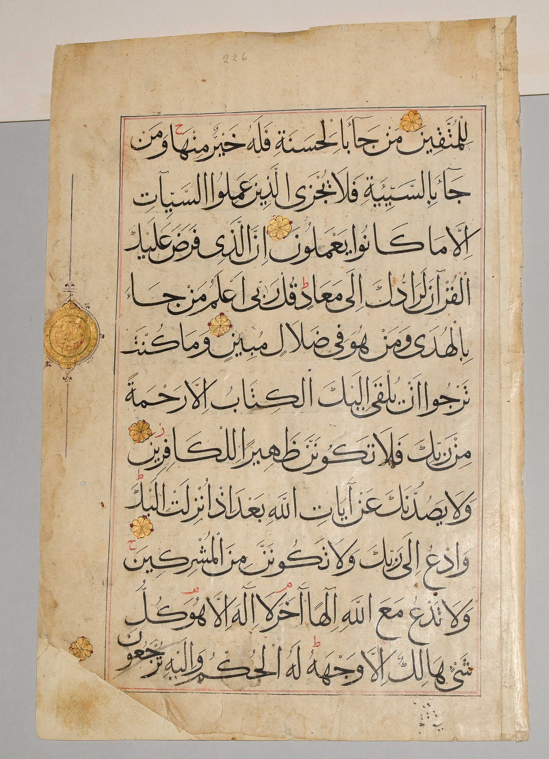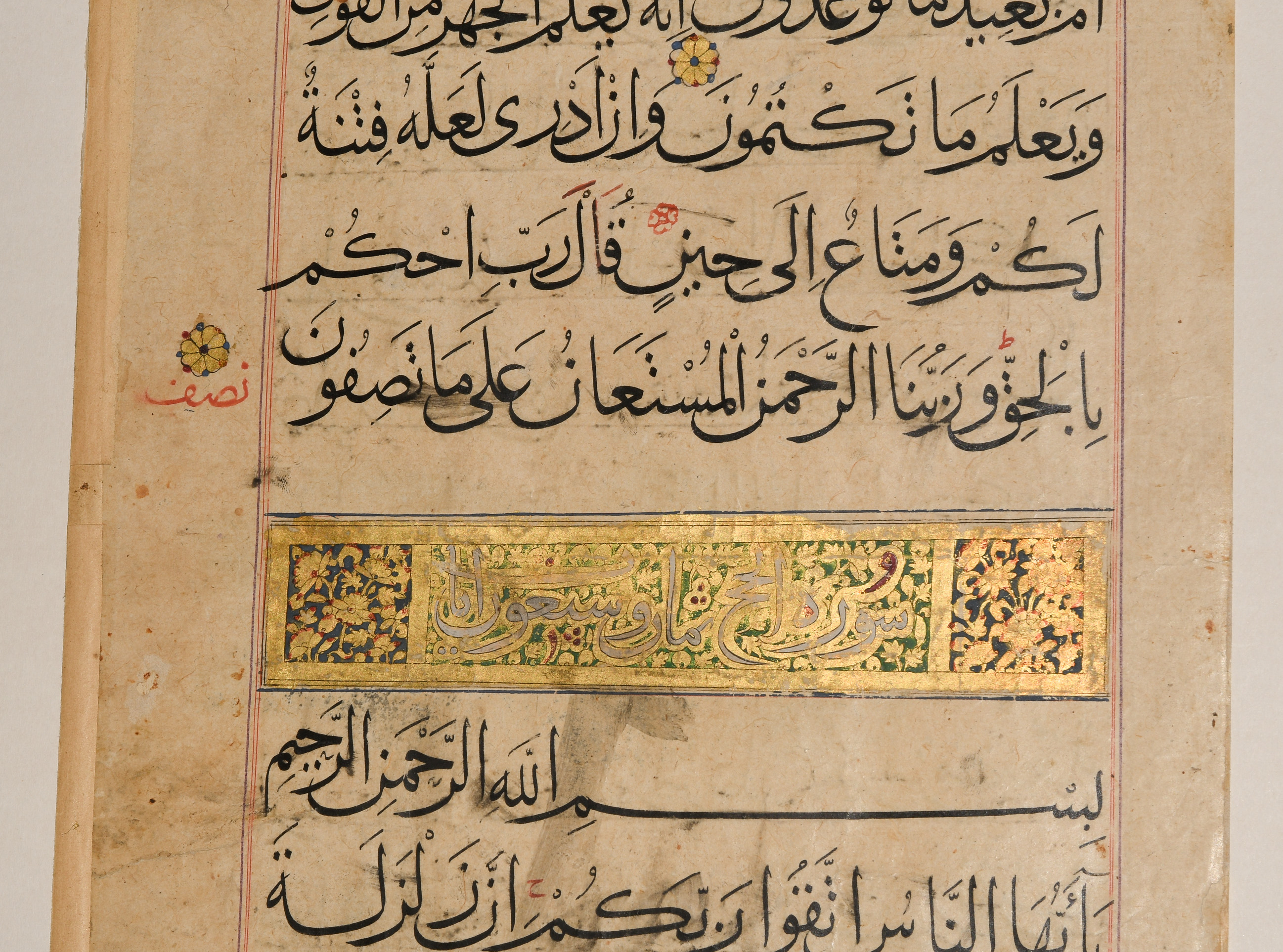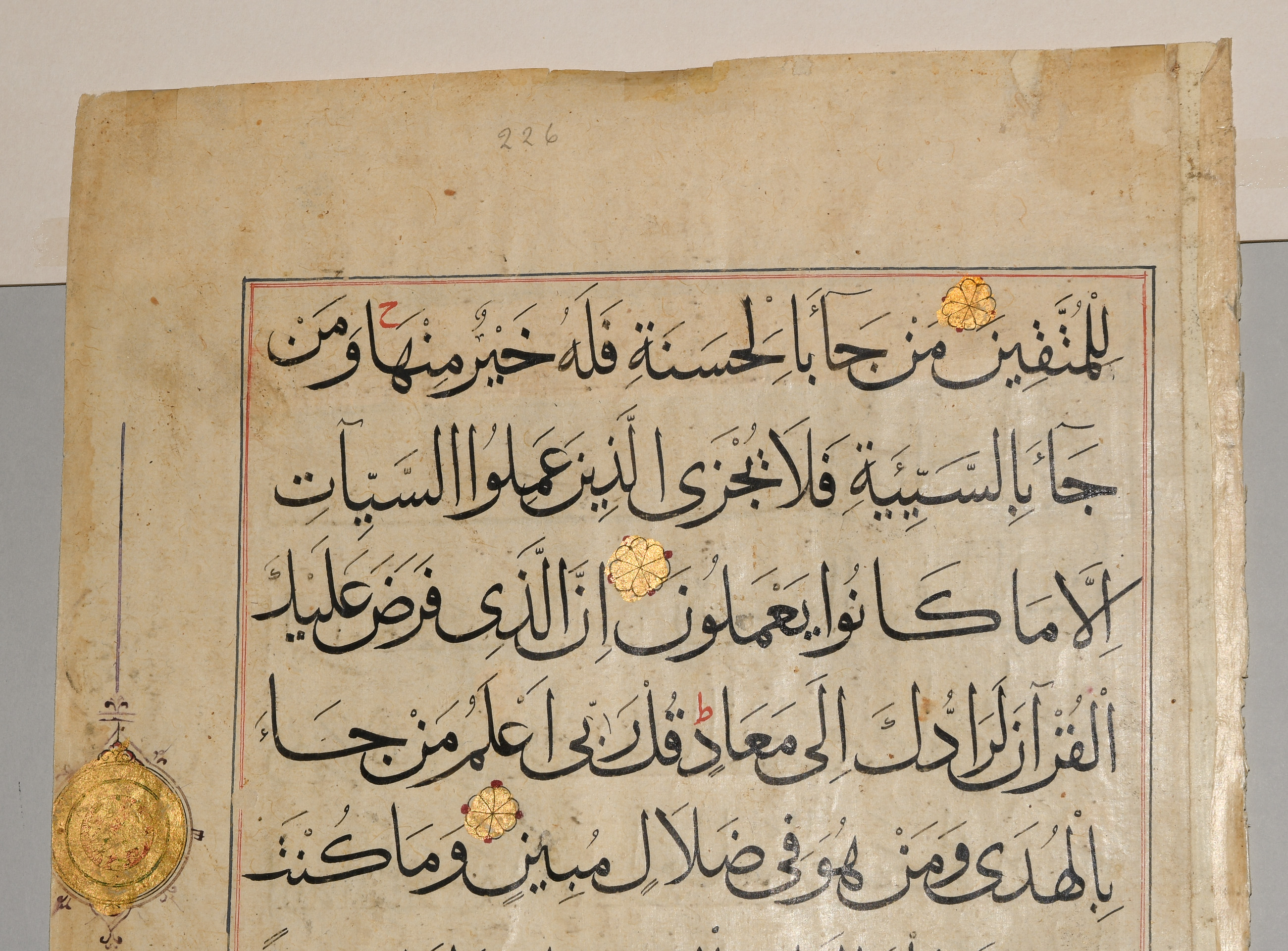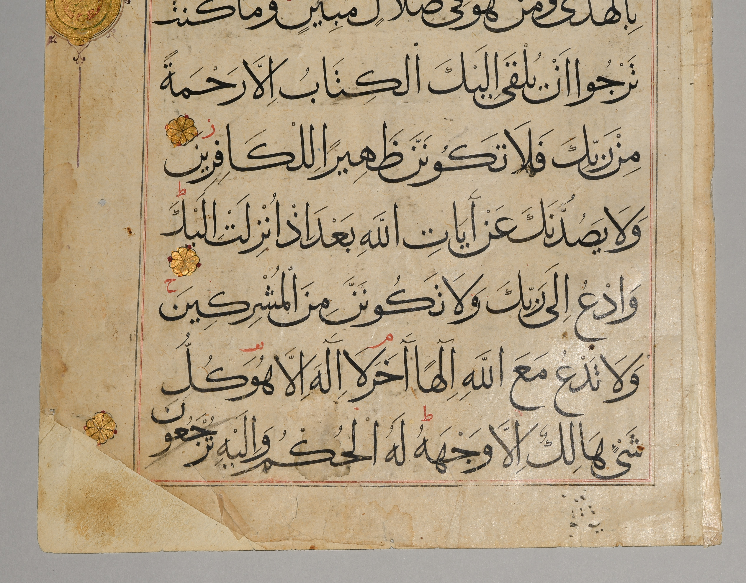 Arabische Koranverse. Tusche, Gold und Deckfarben auf Papier. Ca. 40x27 (Lichtmass), gerahmt 57,5x42,5 cm. - Papier ergänzt. Alters- und Gebrauchspuren.