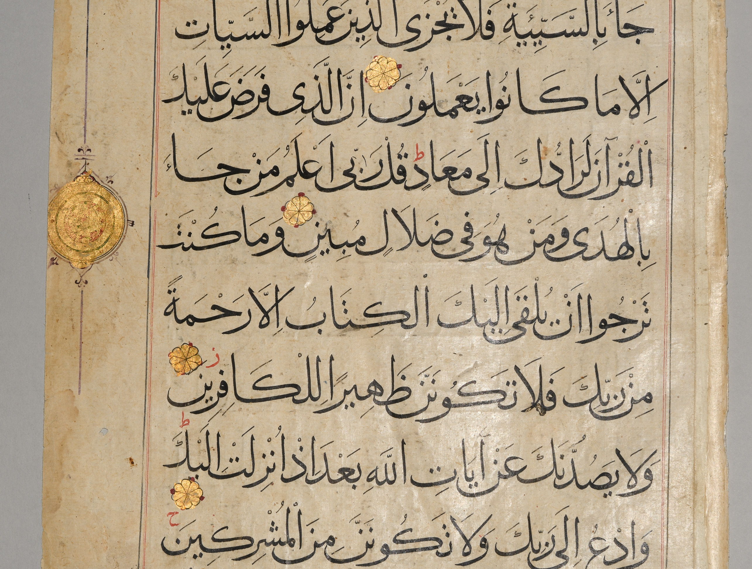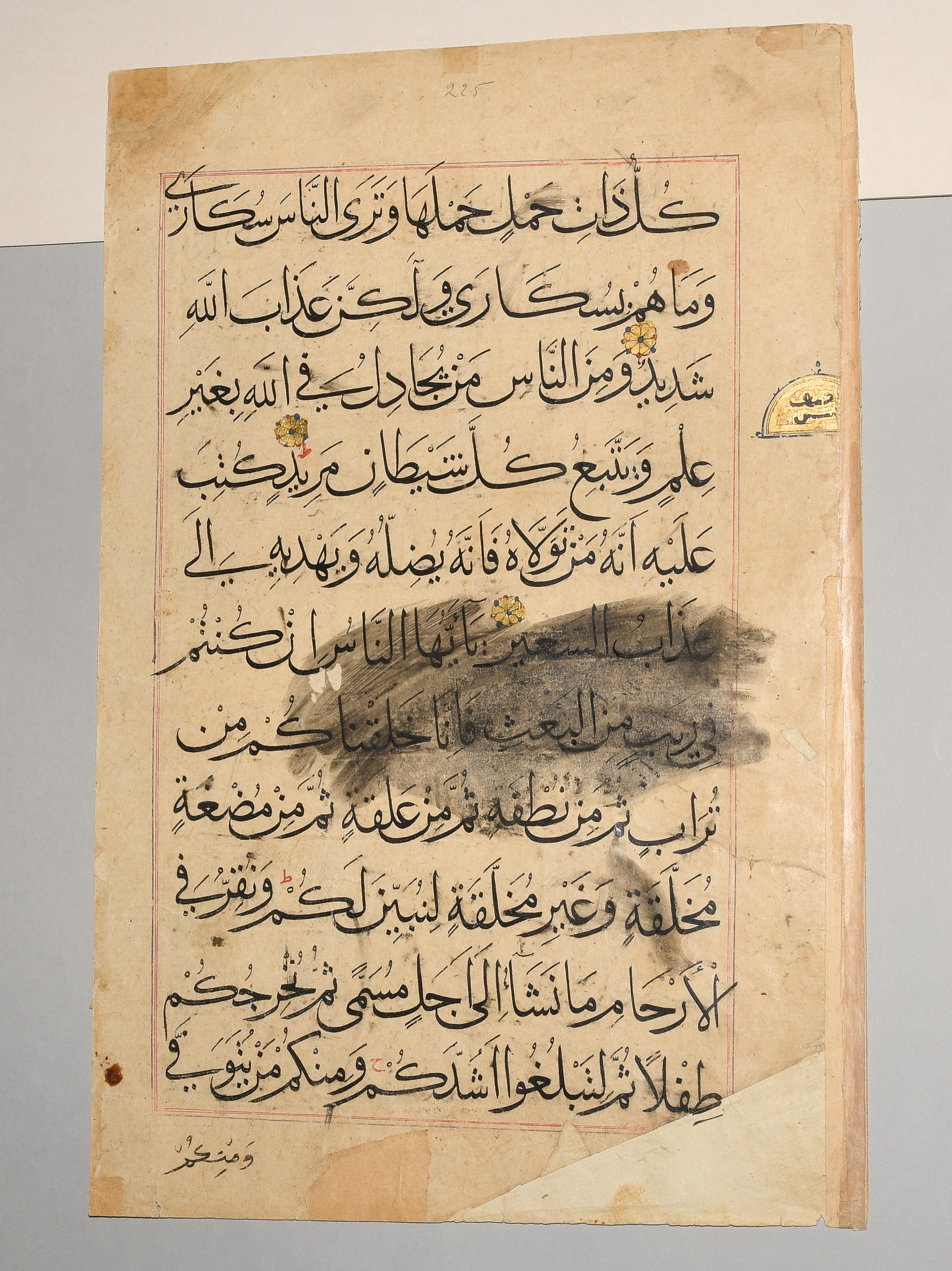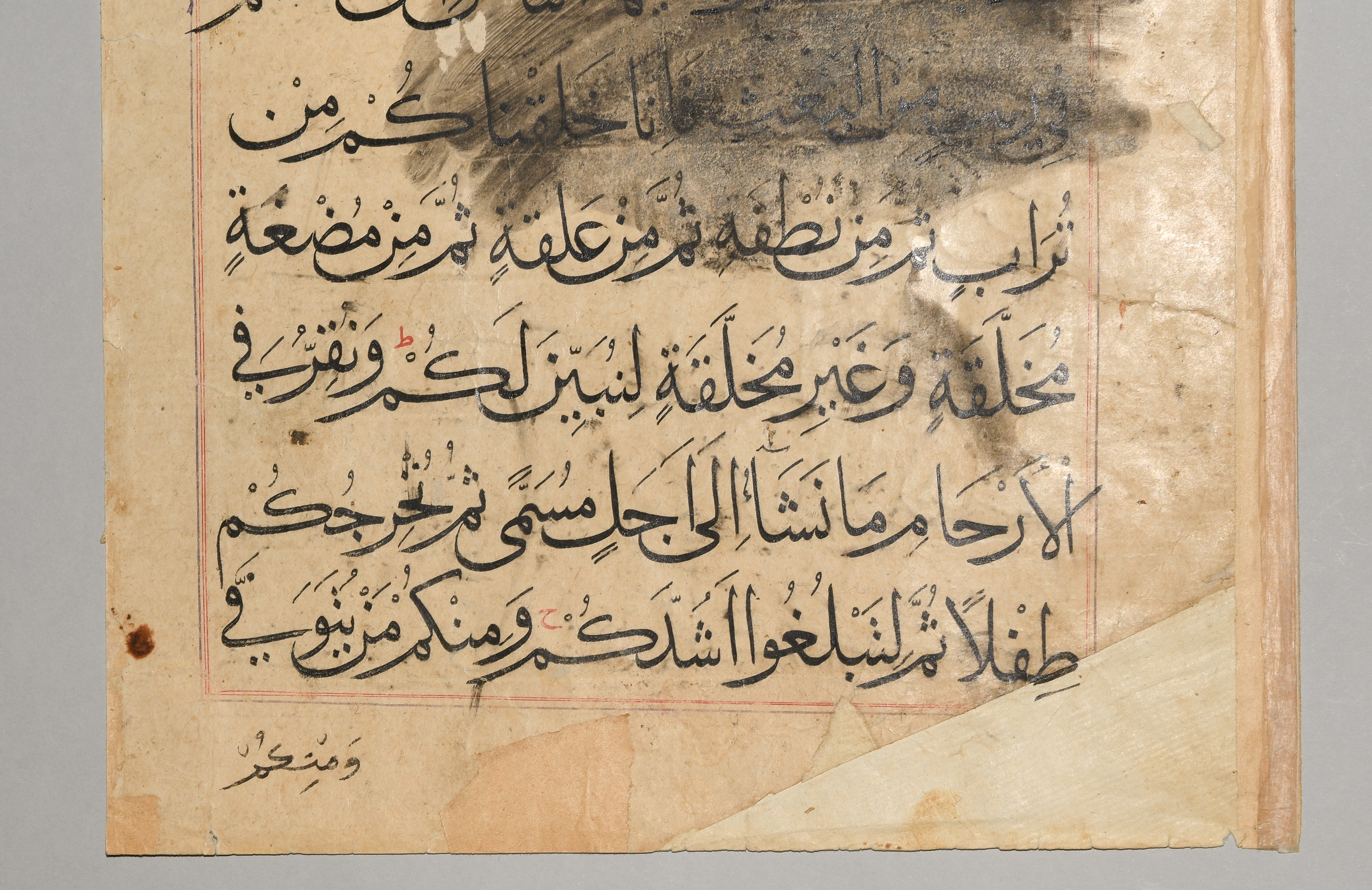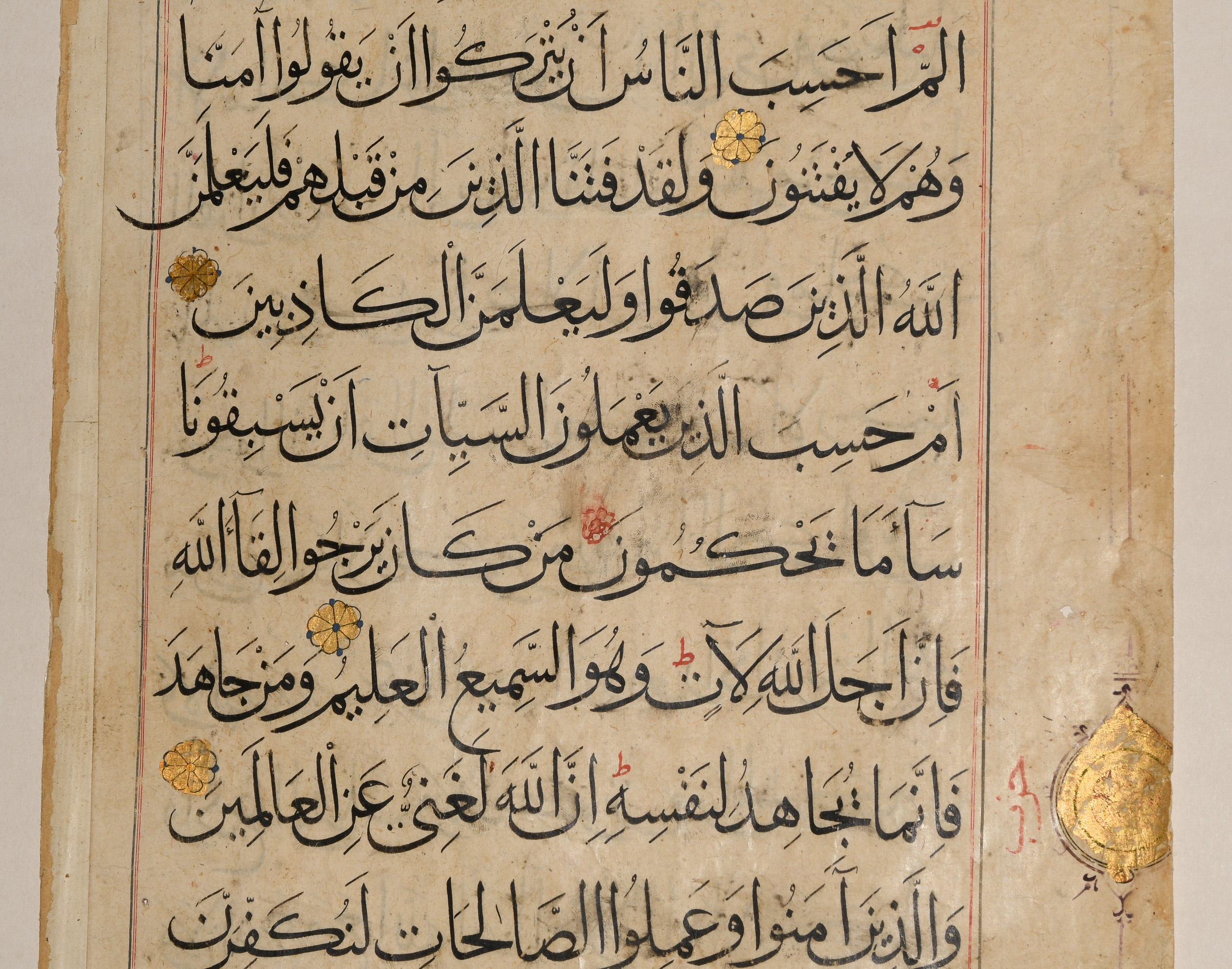Arabische Koranverse. Tusche, Gold und Deckfarben auf Papier. Ca. 40x27 (Lichtmass), gerahmt 57,5x42,5 cm. - Papier ergänzt. Alters- und Gebrauchspuren.