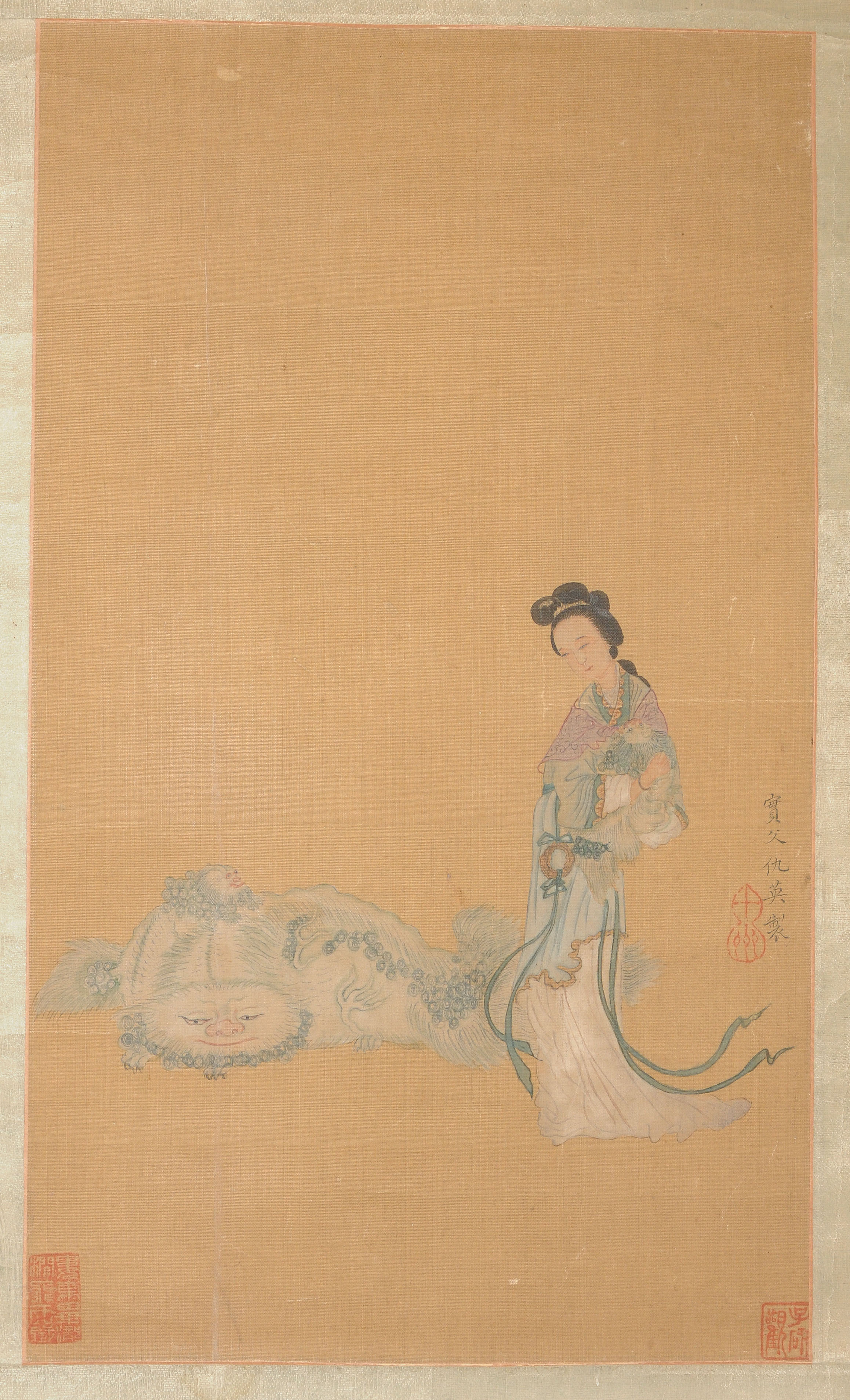 China. Farbe auf Seide. Stehende Schönheit mit Fabeltieren. Bild 45x26, Montur 84x40 cm. - Fleckig, Knicke.