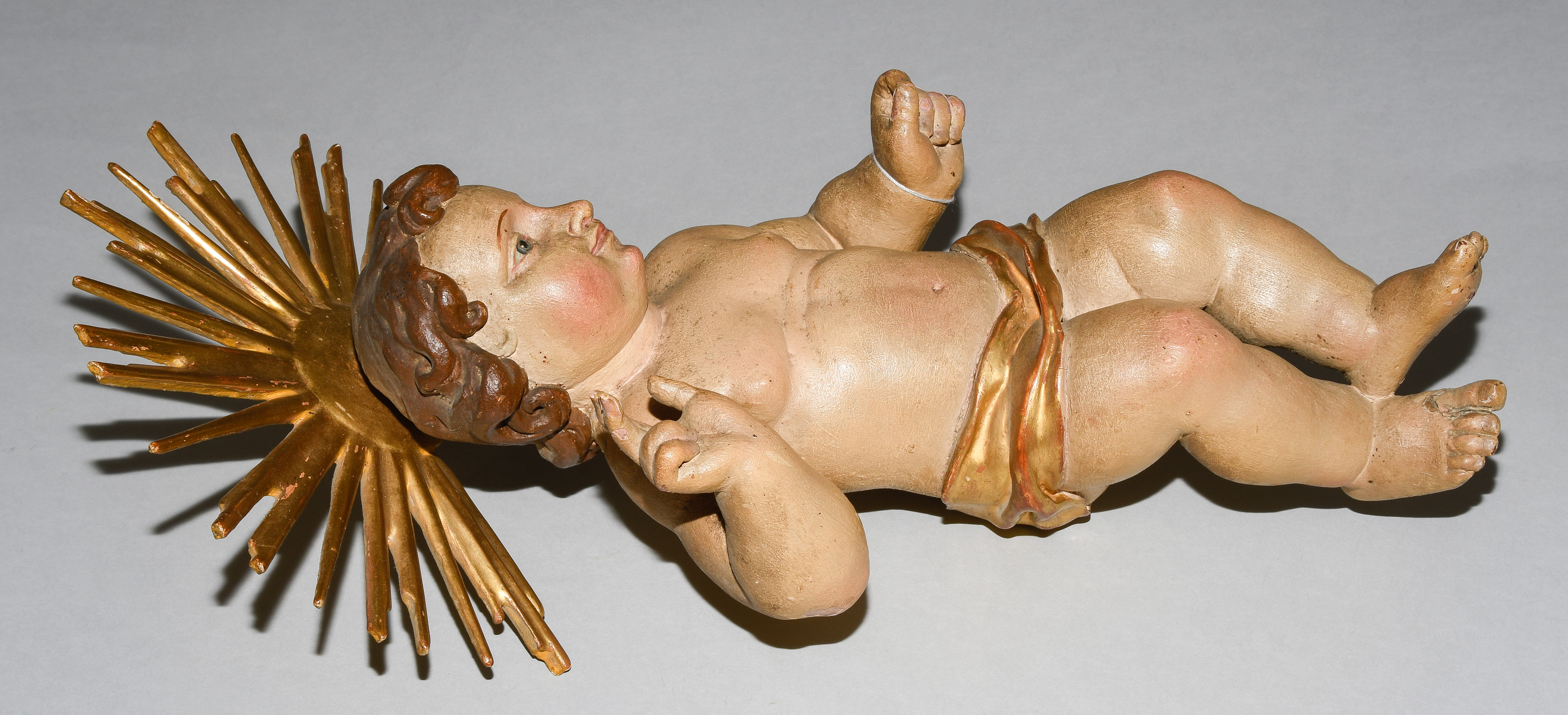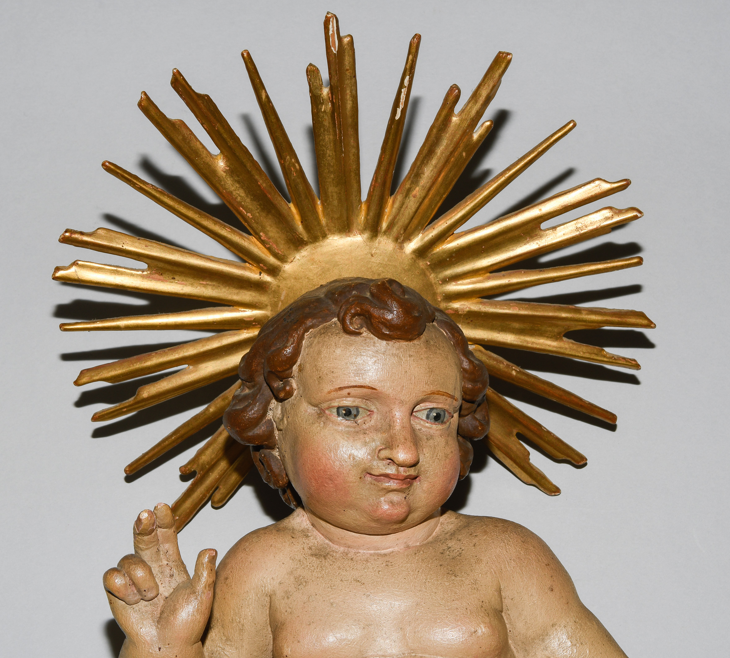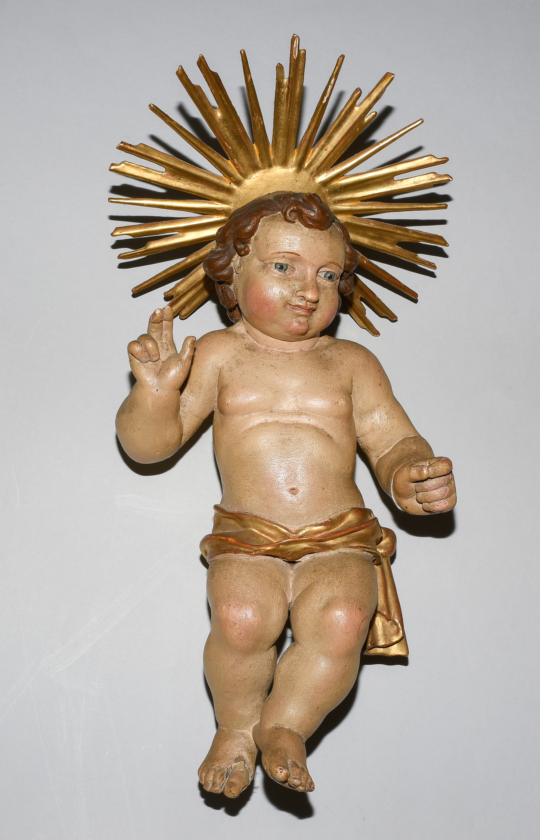 Barock. Holz geschnitzt und polychrom gefasst, tlw. vergoldet. Jesuskind mit Lendentuch, die rechte Hand im Segensgestus erhoben. Am Hinterkopf montierter Strahlennimbus. H 41 cm.