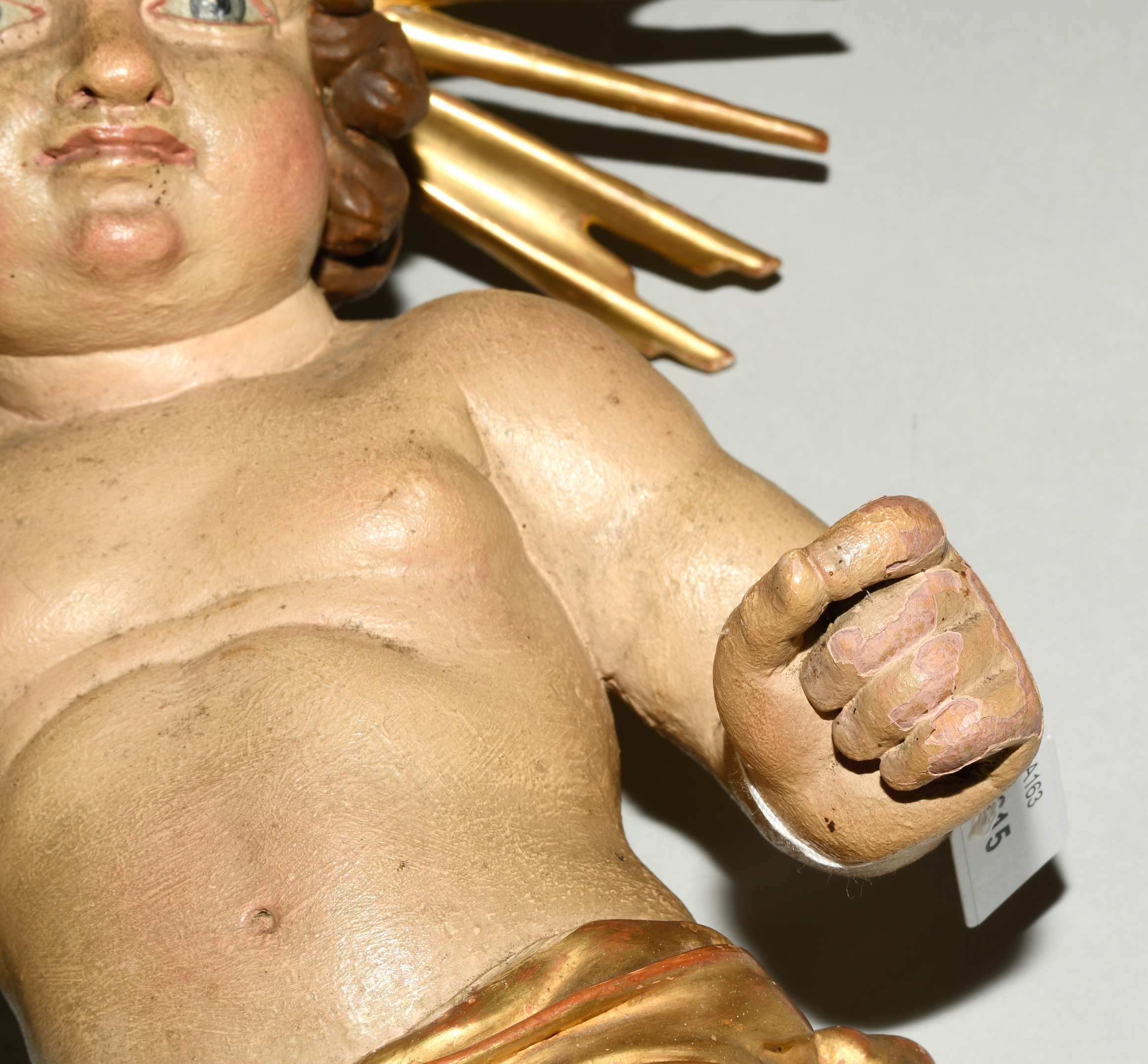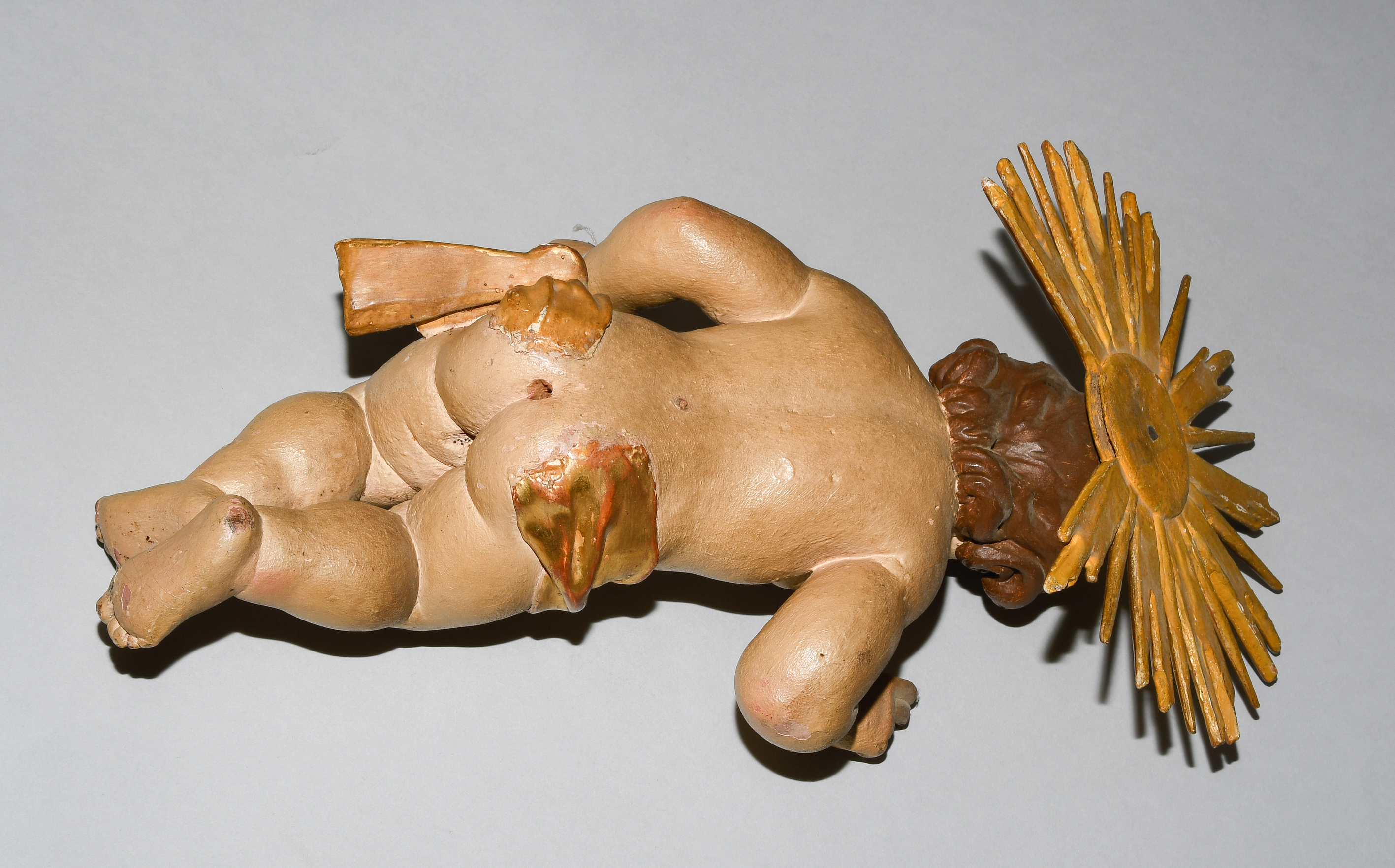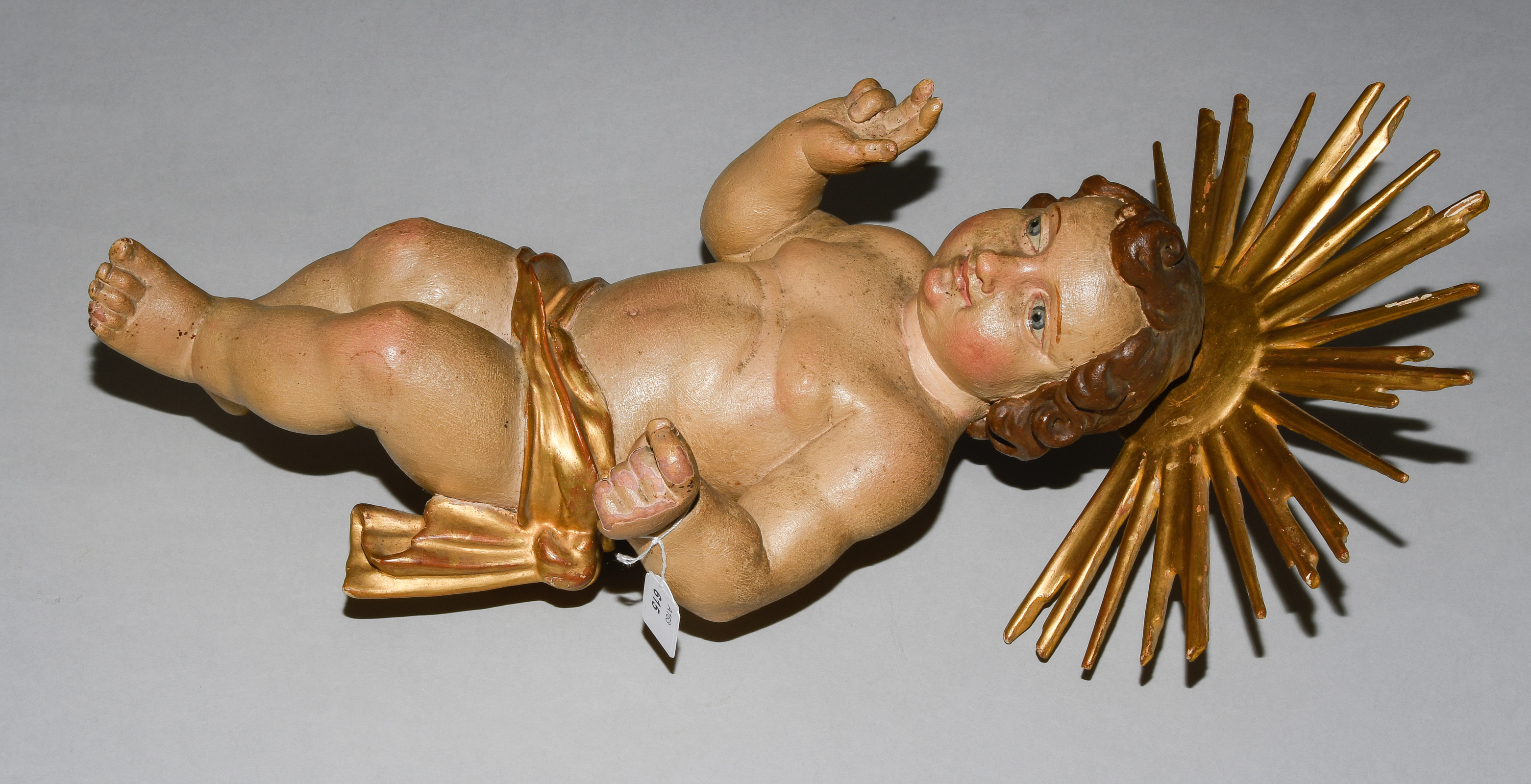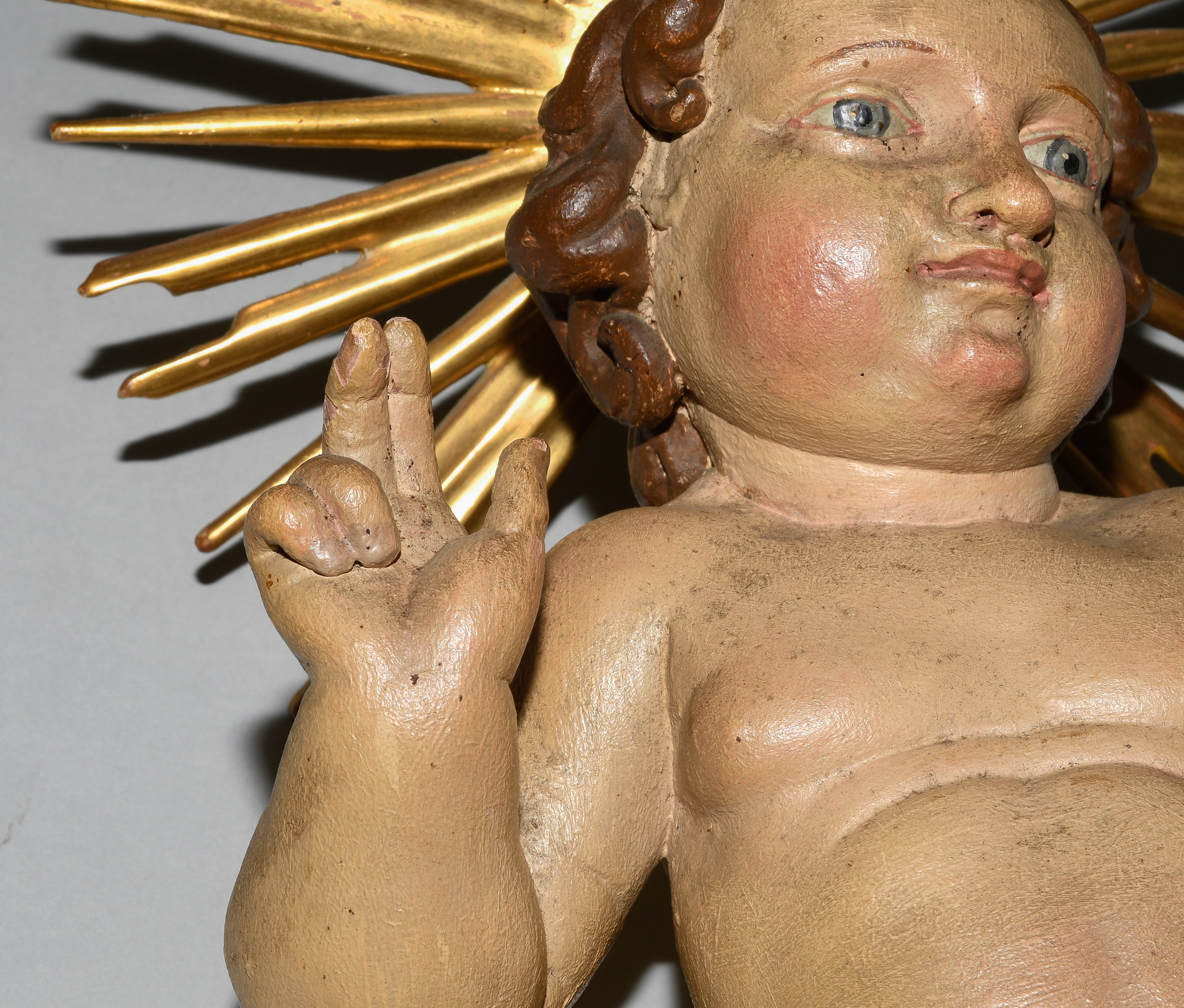 Barock. Holz geschnitzt und polychrom gefasst, tlw. vergoldet. Jesuskind mit Lendentuch, die rechte Hand im Segensgestus erhoben. Am Hinterkopf montierter Strahlennimbus. H 41 cm.