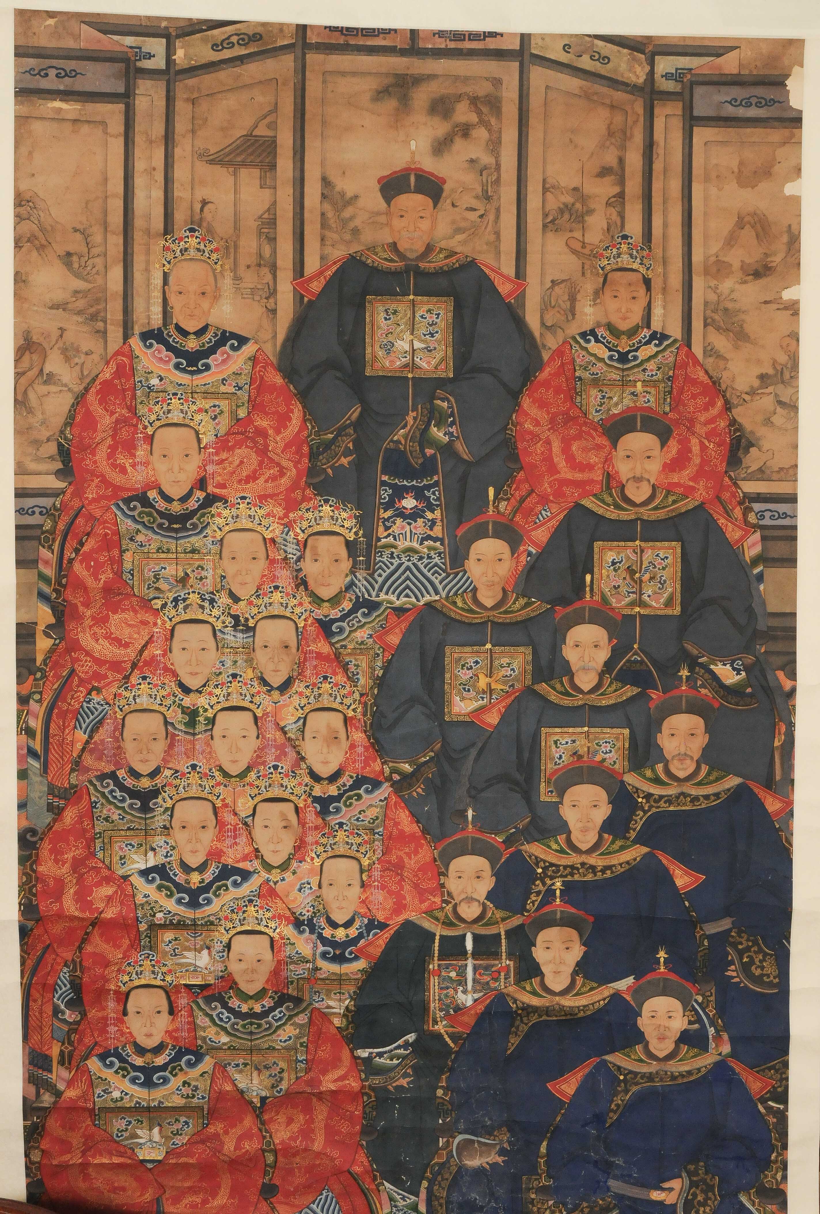 China, 19./20.Jh. Tusche und Farben auf Papier. Grosses Mehrgenerationen-Portrait mit 24 sitzenden Familienangehörigen gekleidet in Wintergewändern. Ca. 220x119 cm. Als Rollbild aufgezogen. Ca. 270x129 cm. - Alters- und Gebrauchspuren. Fehlstellen. Wasserflecken.