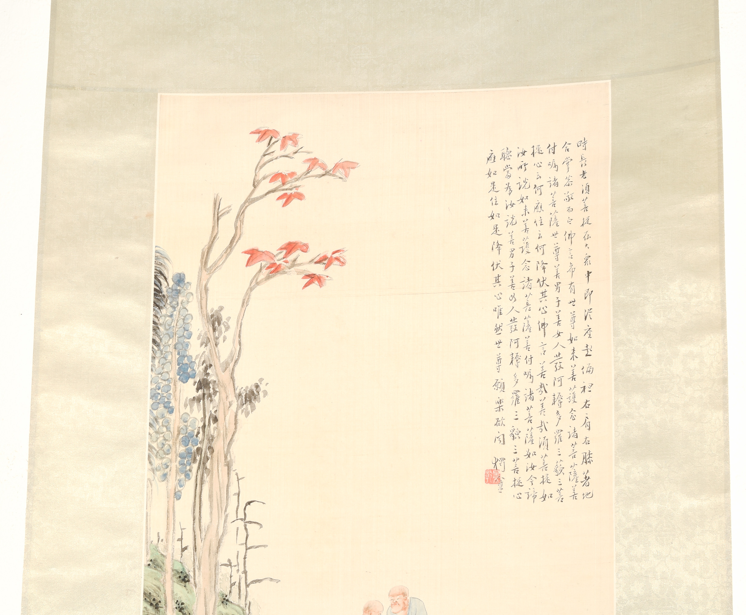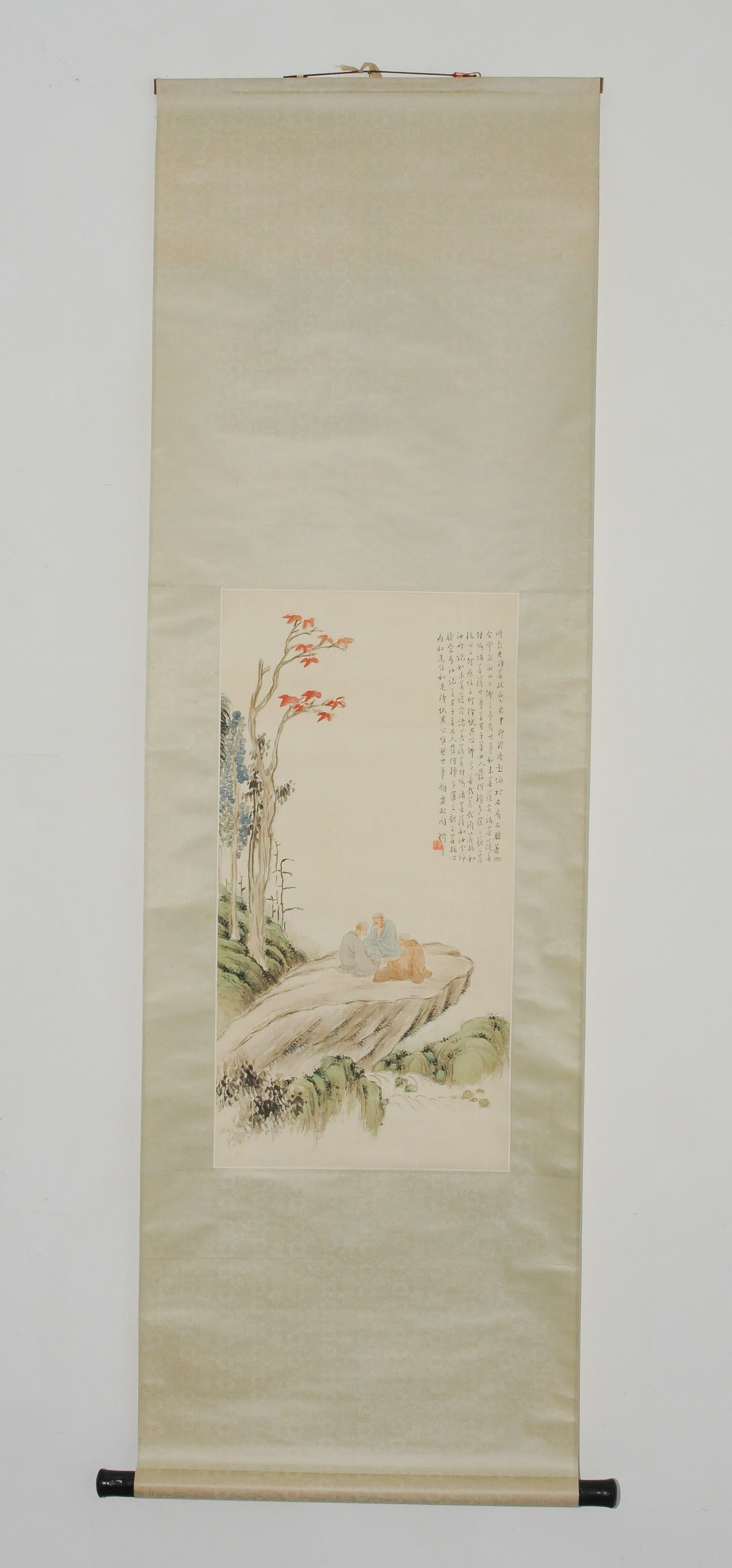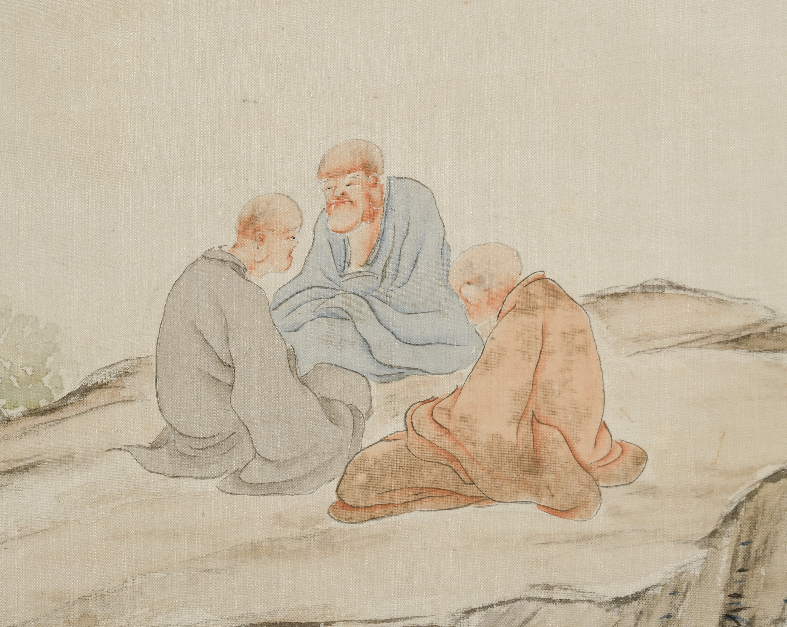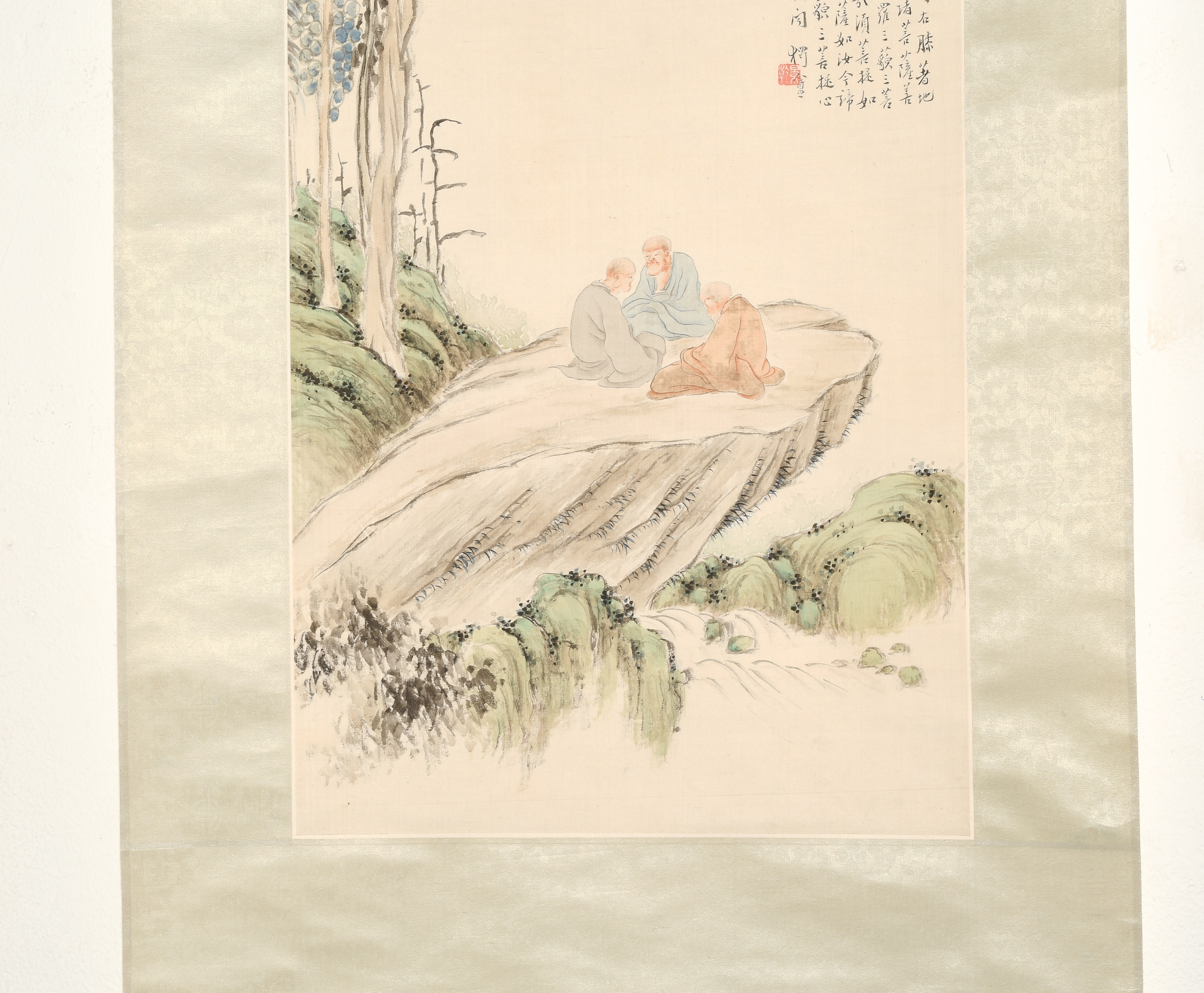 China, 20.Jh. Tusche und Farbe auf Papier. Signiert Duhui mit rotem Siegel Qianjin. Drei sitzende Weise am Fluss. 61x31,5, auf Rollbild aufgezogen 152x47,5 cm.
