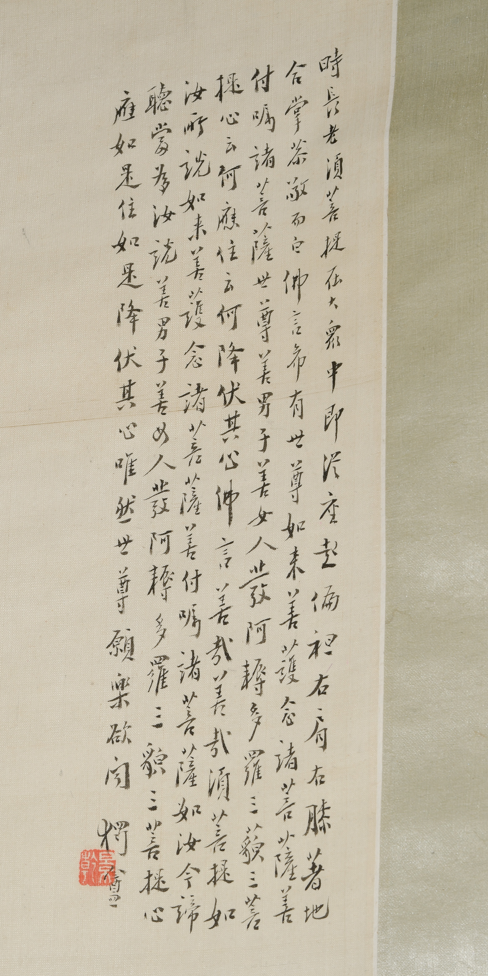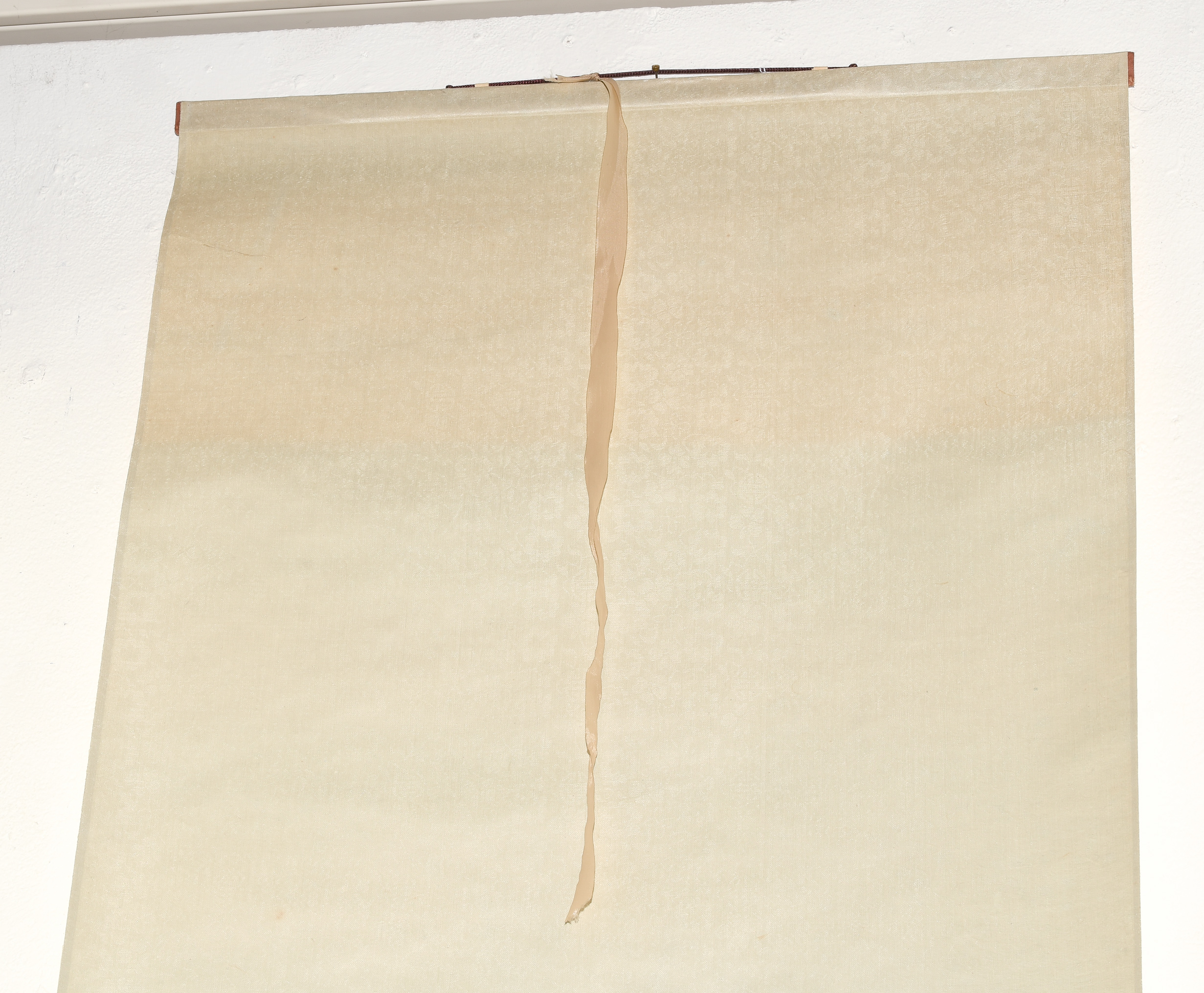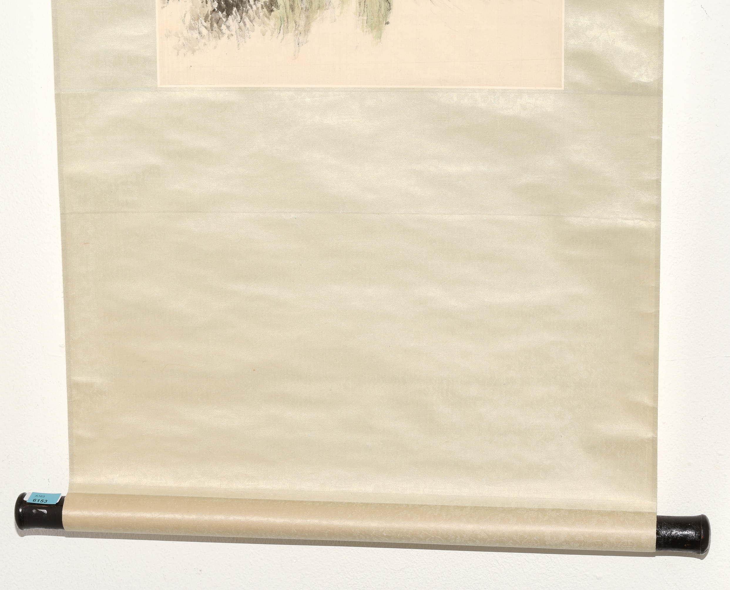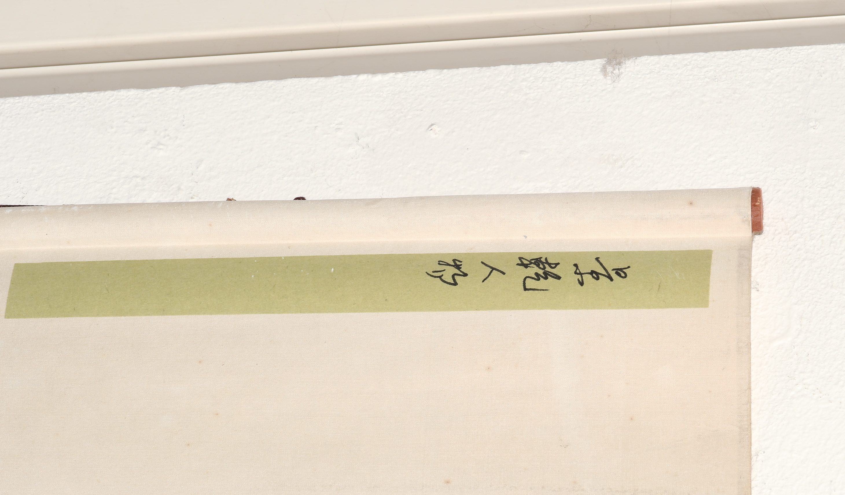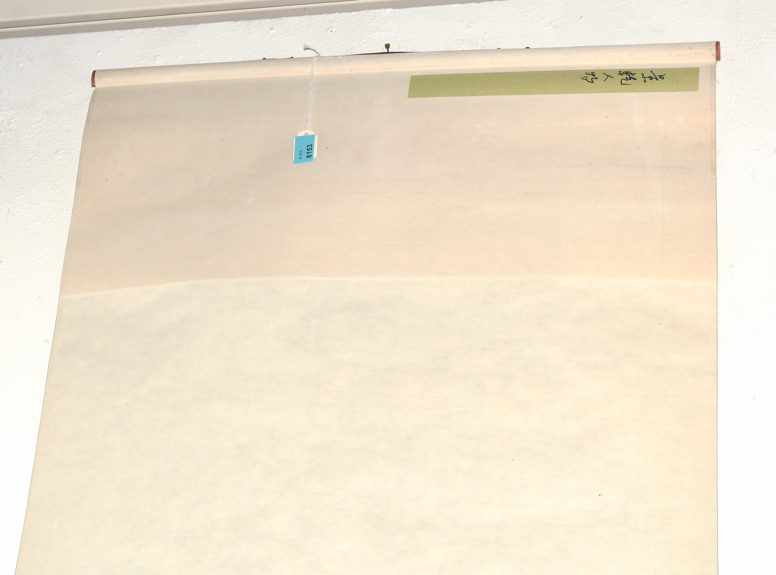 China, 20.Jh. Tusche und Farbe auf Papier. Signiert Duhui mit rotem Siegel Qianjin. Drei sitzende Weise am Fluss. 61x31,5, auf Rollbild aufgezogen 152x47,5 cm.