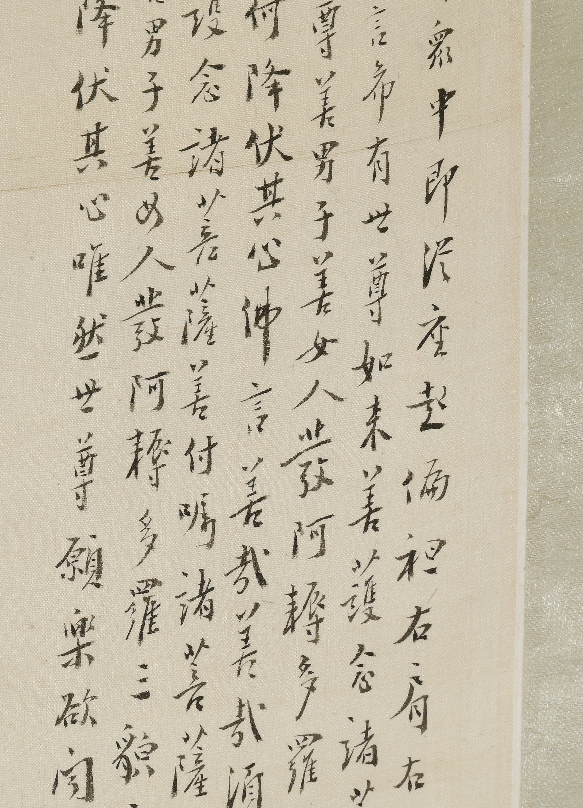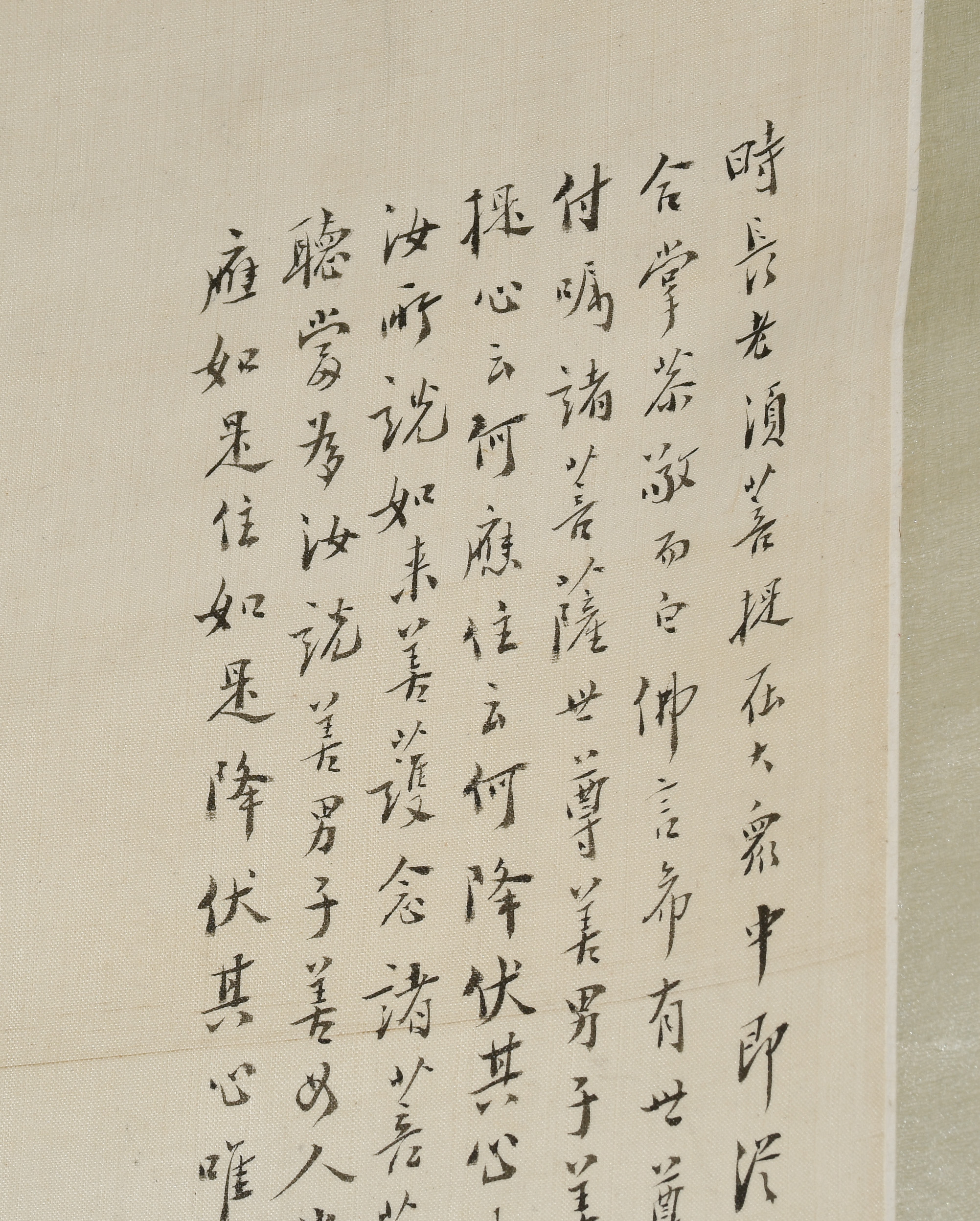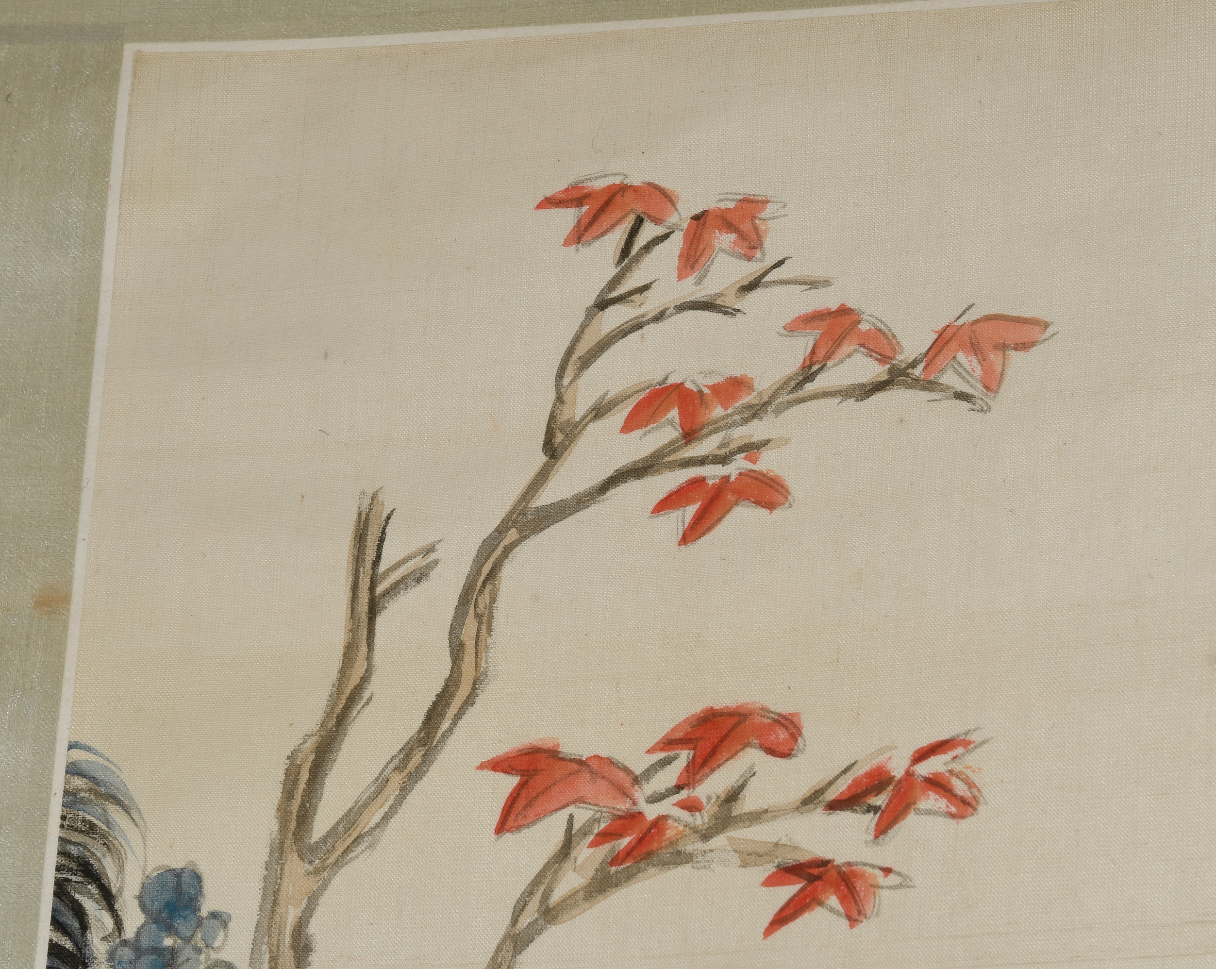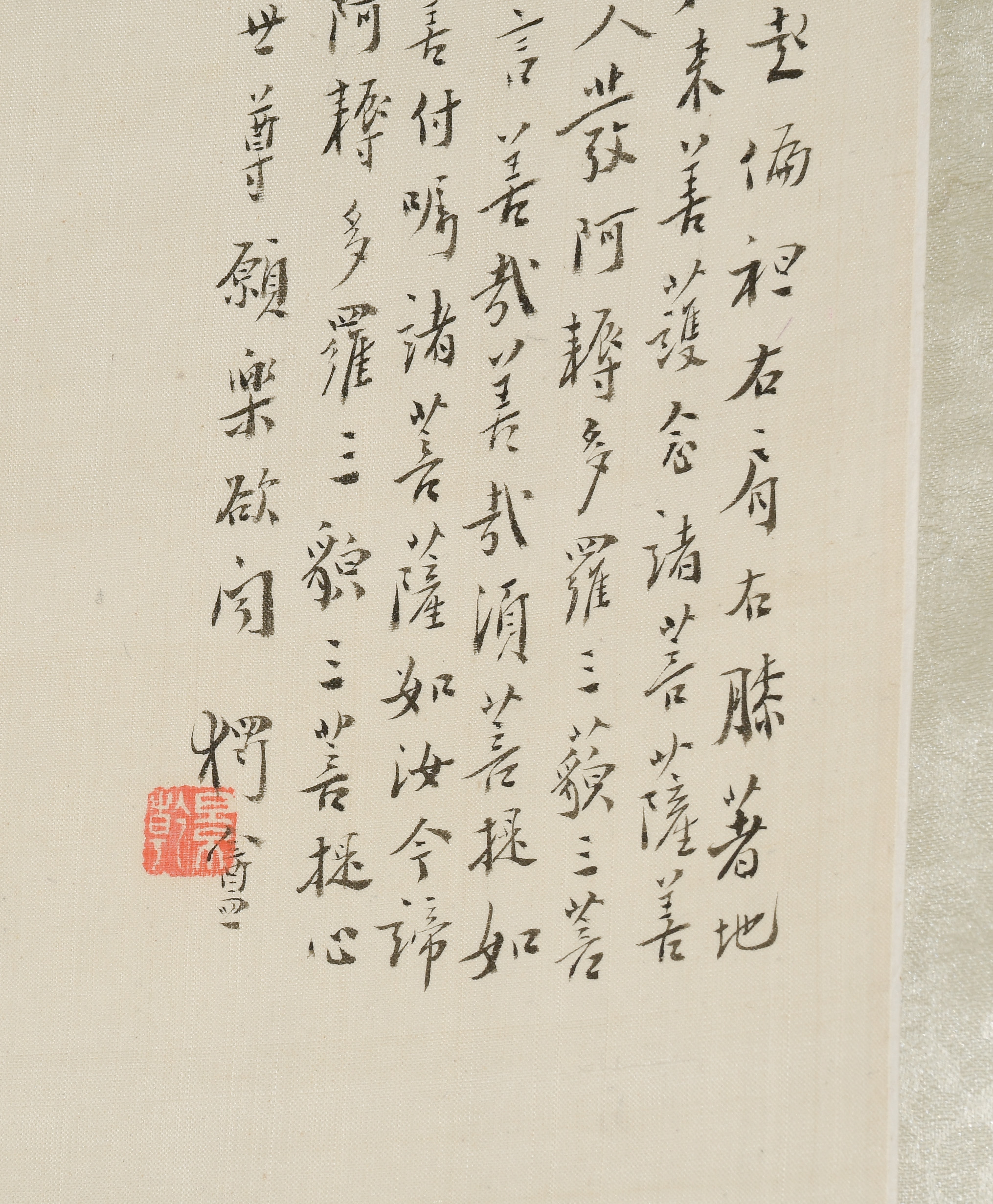 China, 20.Jh. Tusche und Farbe auf Papier. Signiert Duhui mit rotem Siegel Qianjin. Drei sitzende Weise am Fluss. 61x31,5, auf Rollbild aufgezogen 152x47,5 cm.