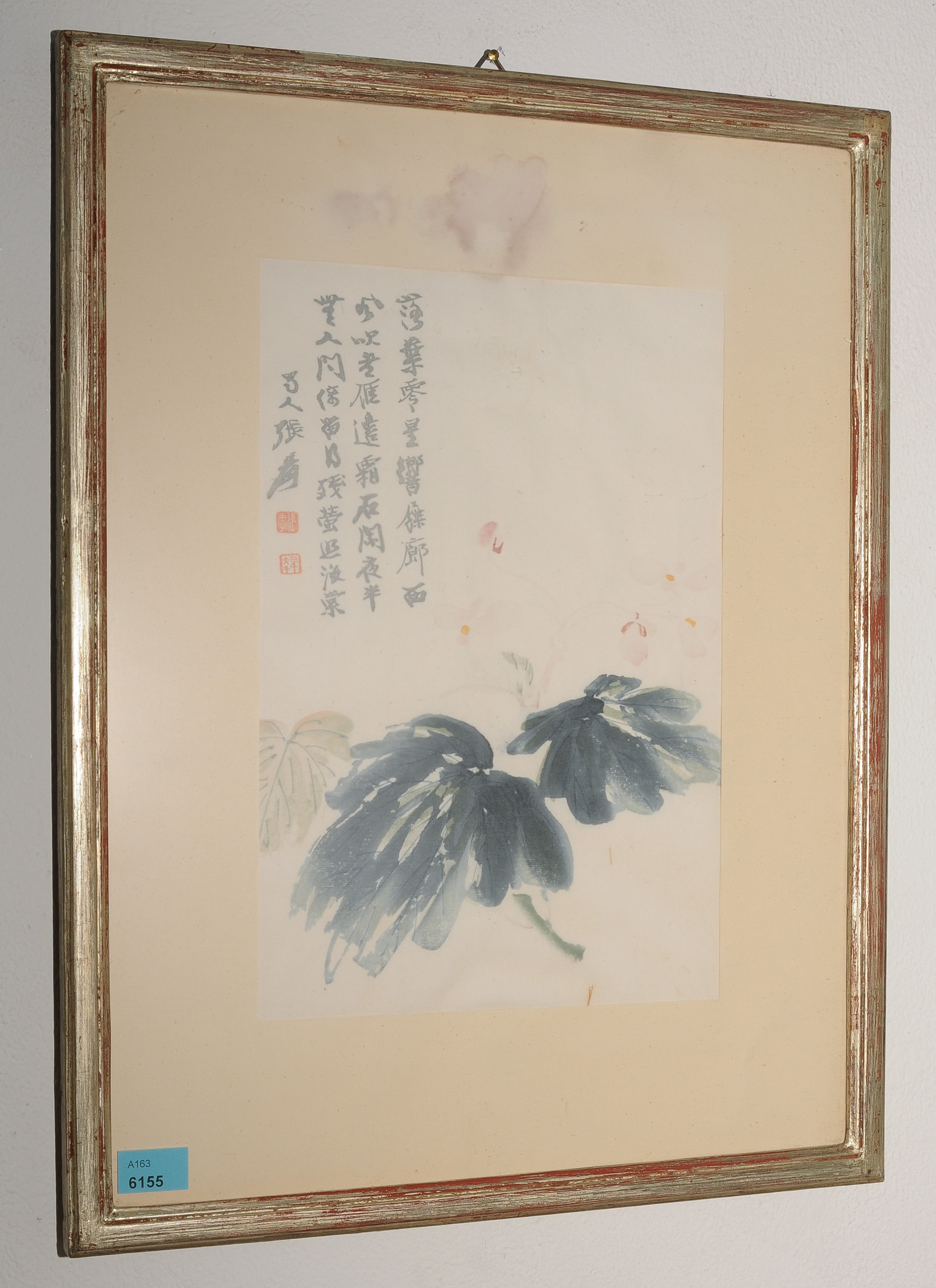 China, wohl 20.Jh. Blumen und Blätter mit Gedicht auf weissem Grund. 26,5x18 cm. Gerahmt 41,5x32 cm. - Fleckig.