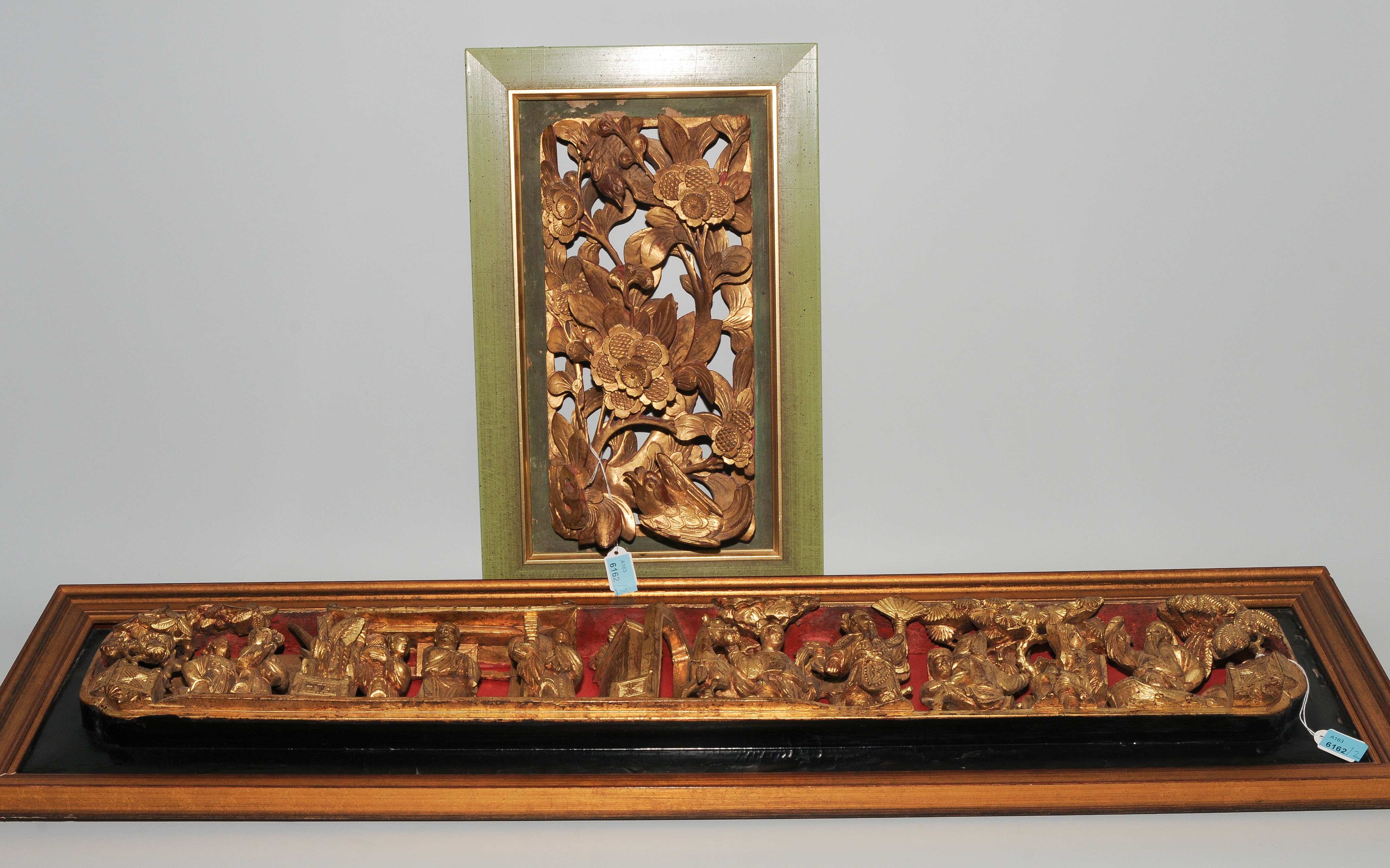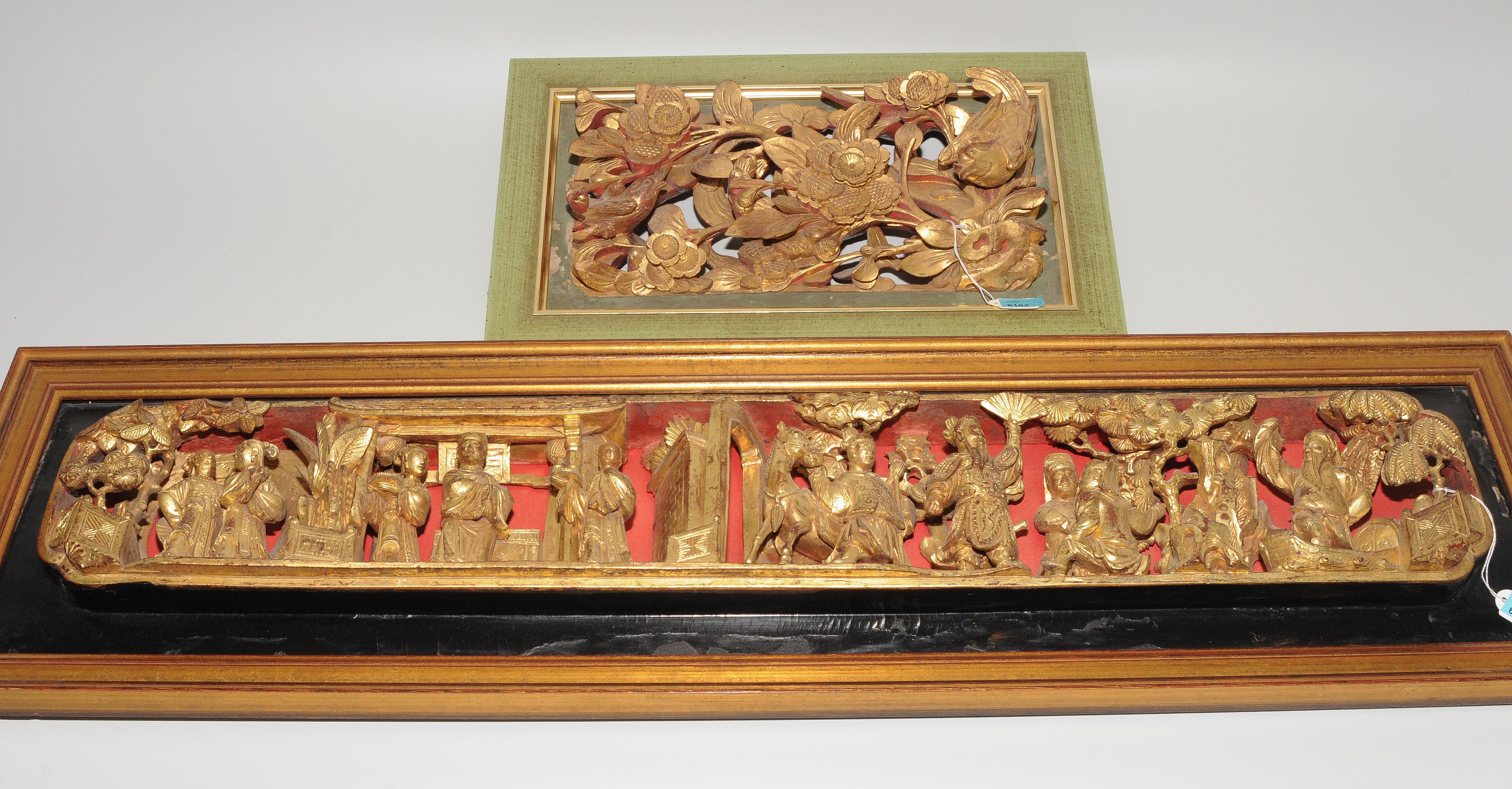 China. Holz, lackiert und vergoldet. Ein durchbrochen gearbeitetes, querrechteckiges Paneel mit plastischer figürlicher Szene. Eine hochformatiges Bild mit geschnitztem Blumen- und Vogeldekor. 83,5x23,5 / 36x22 cm.