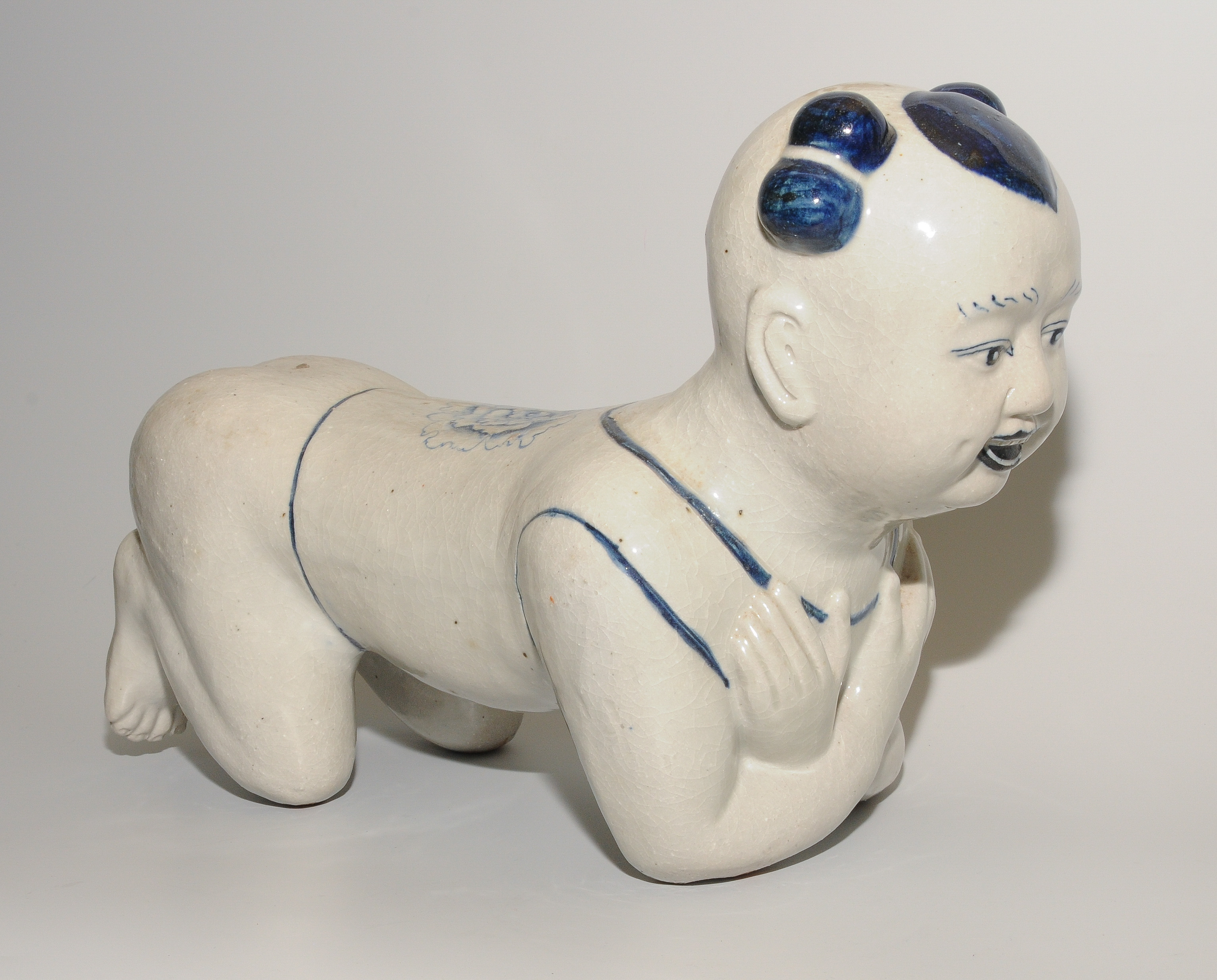 China, 21.Jh. Keramik. In Form eines knienden Kindes. Haare, Gesicht sowie Blumendekor auf Weste in Dunkelblau. 34x23 cm.