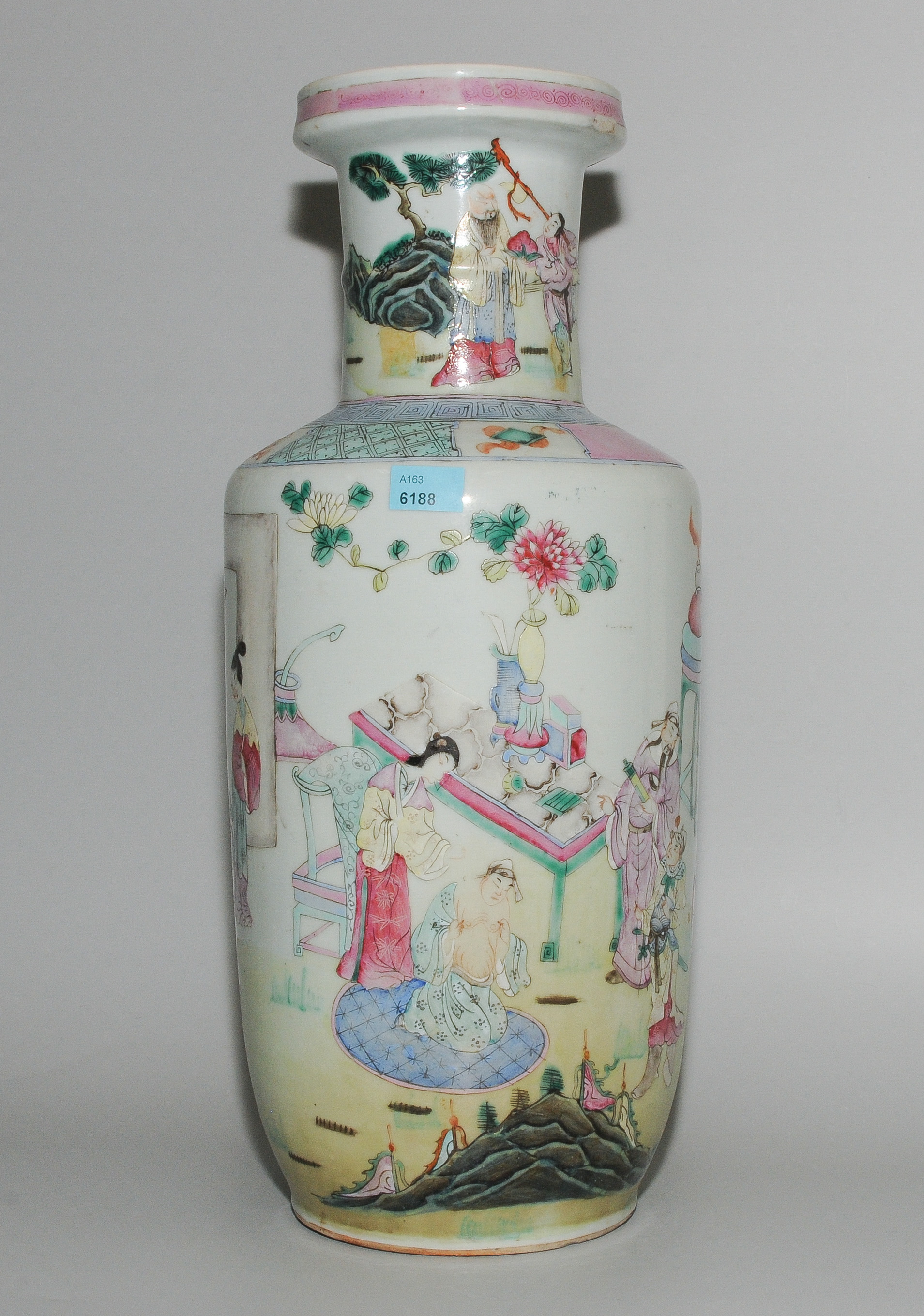 China. Porzellan, polychrom bemalt in den Farben der Famille rose. Darstellung von Gelehrten in Gartenlandschaft. H 42 cm. - Glasurfehler, berieben.