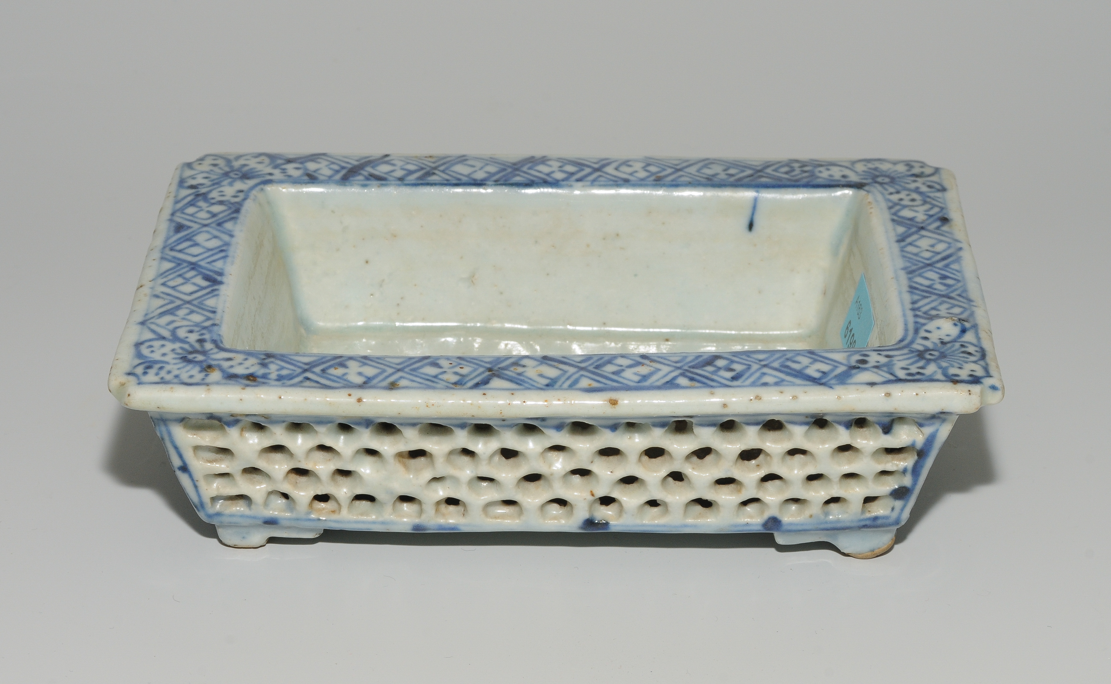 China. Porzellan. Rechteckige Form mit umlaufender durchbrochener Musterung. Unterglasurblaue Malerei mit Diamanten sowie Blumen in den Ecken. 4,5x17,5x11,5 cm. - Glasurfehler.