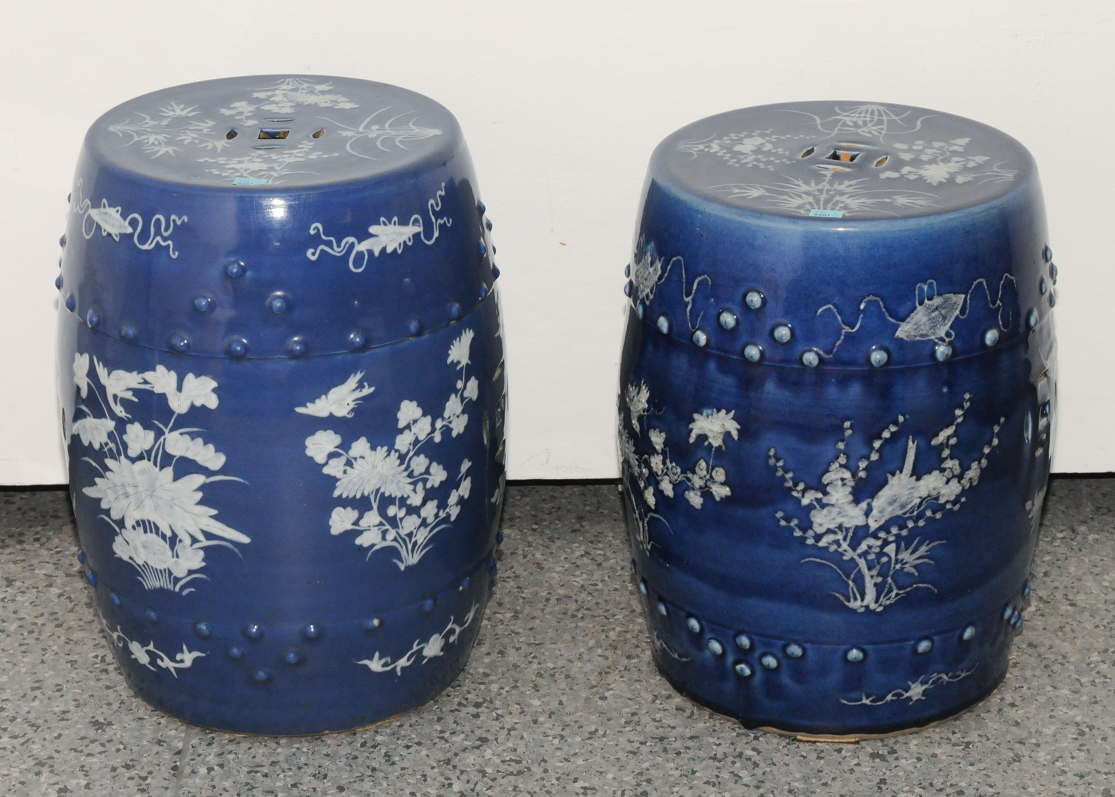 China, Ende 20.Jh. Porzellan. Trommelform. Pflanzenmotive in Weiss auf dunkelblauem Grund. H 46/48 cm.