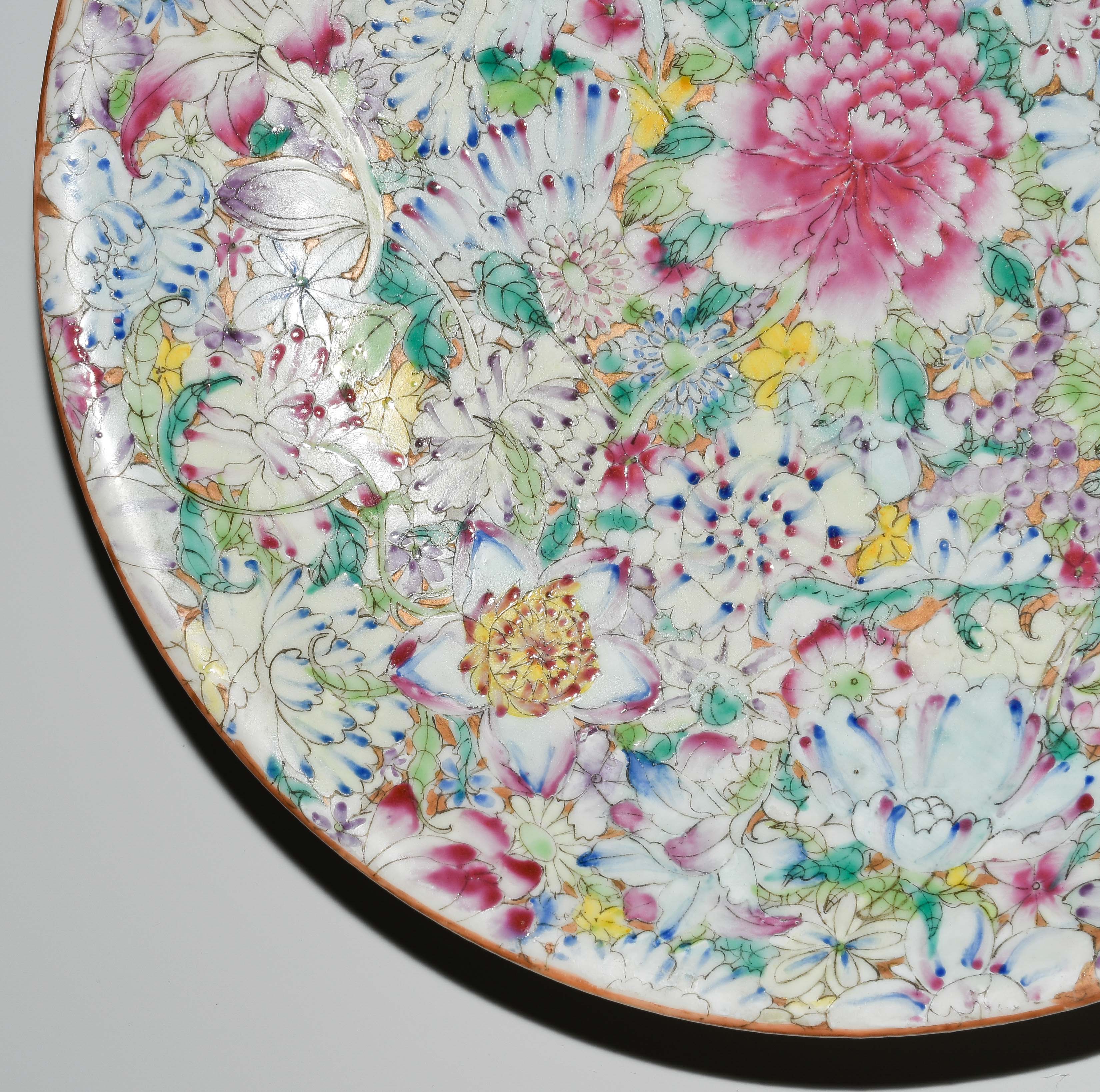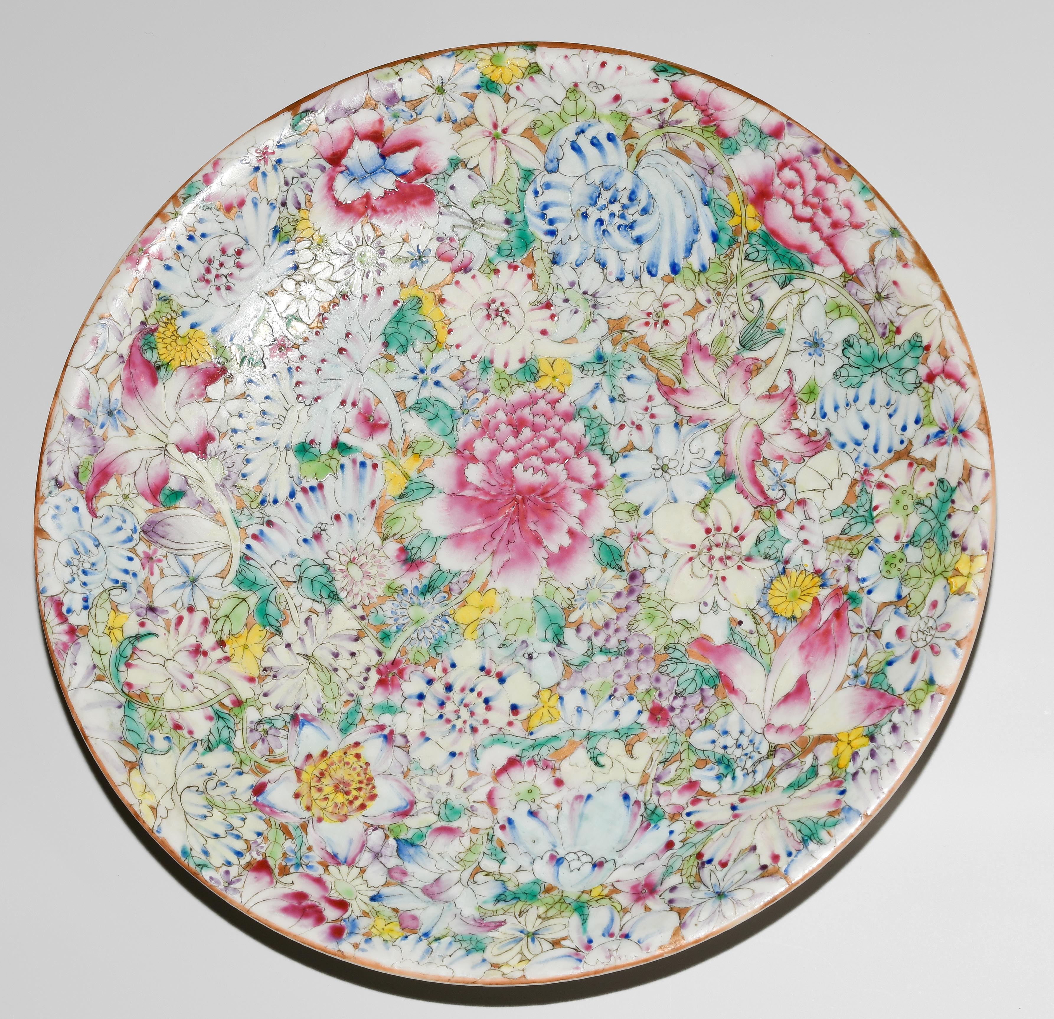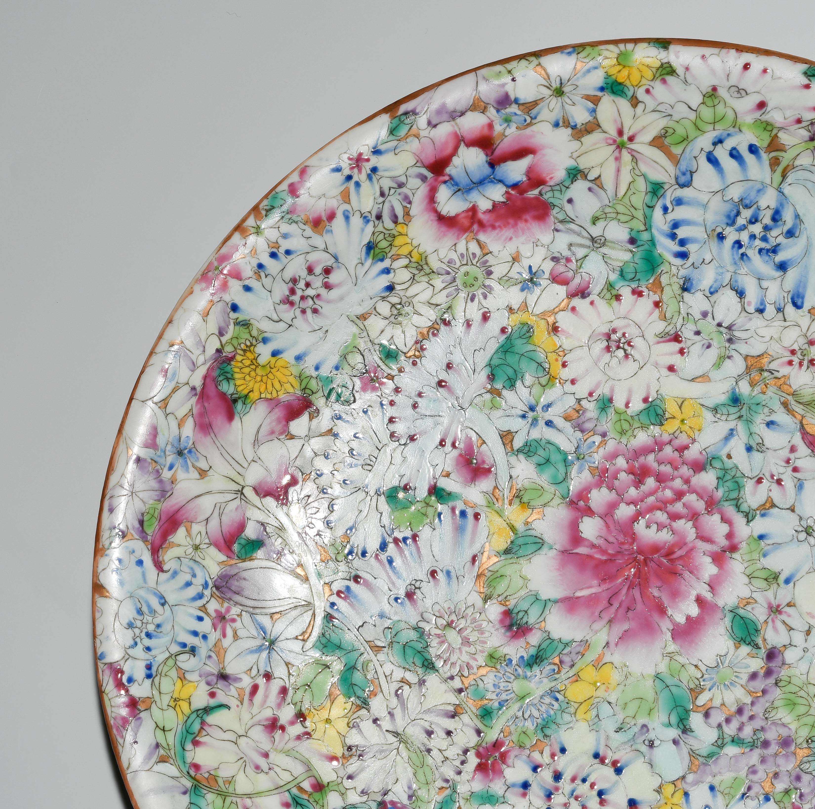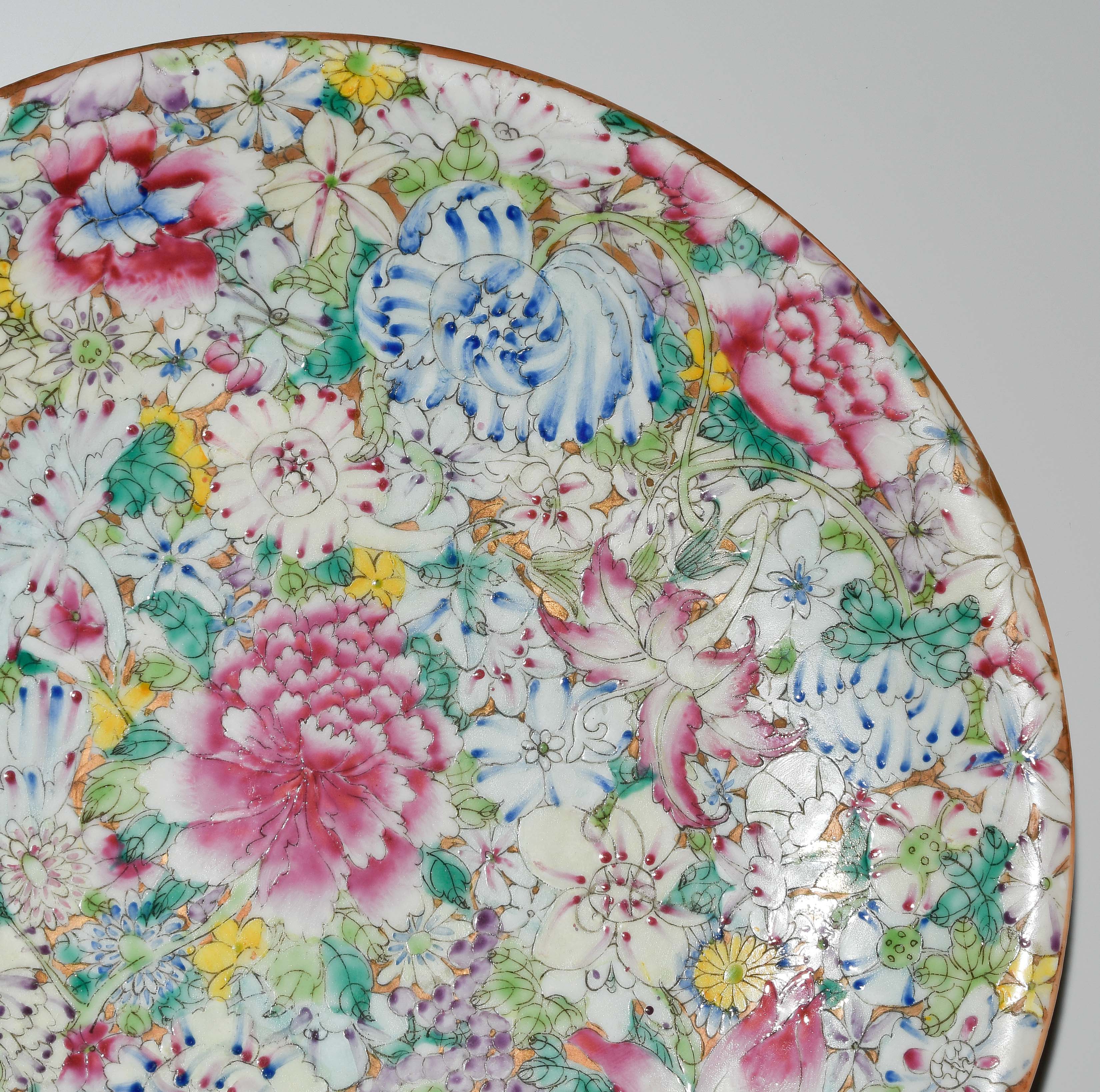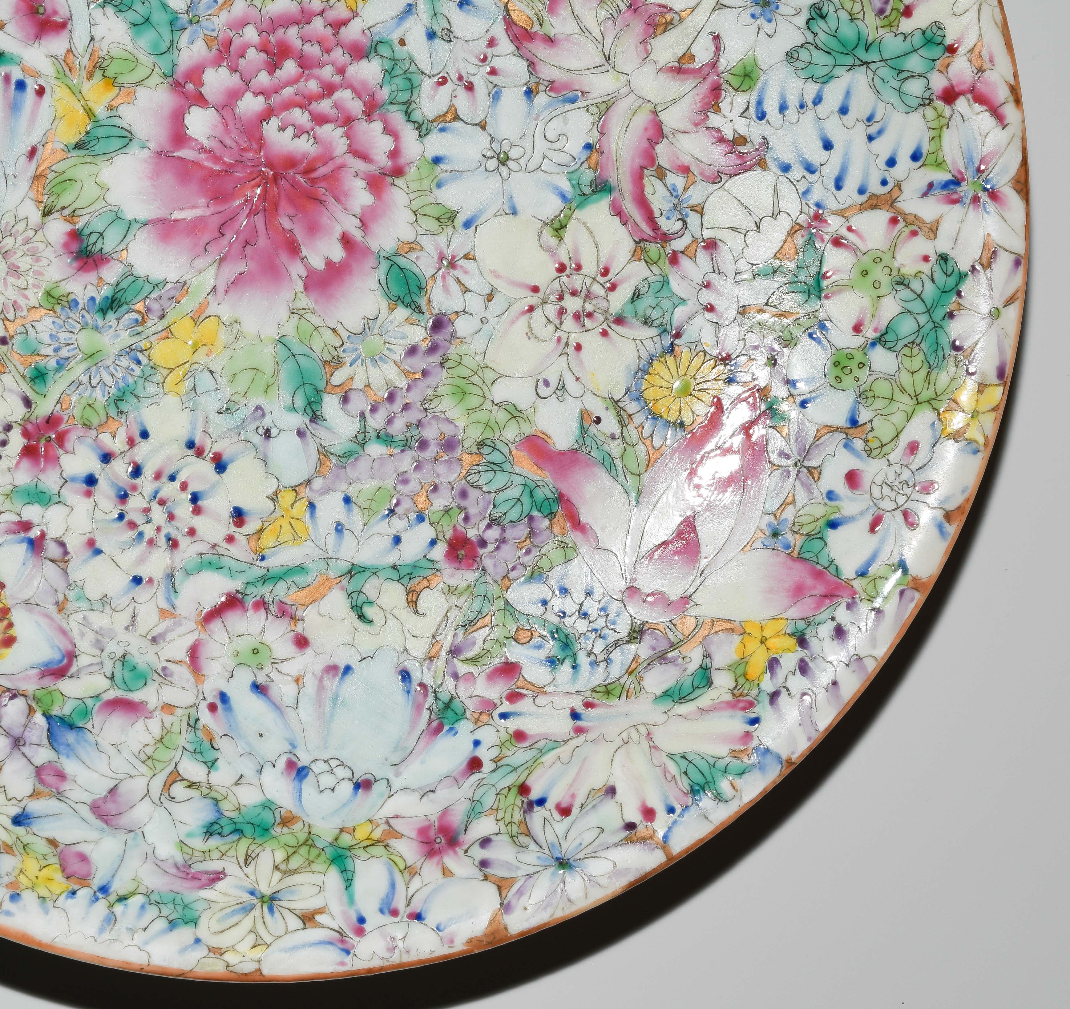 China, 20.Jh. Porzellan. Millefiori-Dekor in Famille rose. Mit ausgekratzter Kangxi-Marke. H 5, D 33 cm.