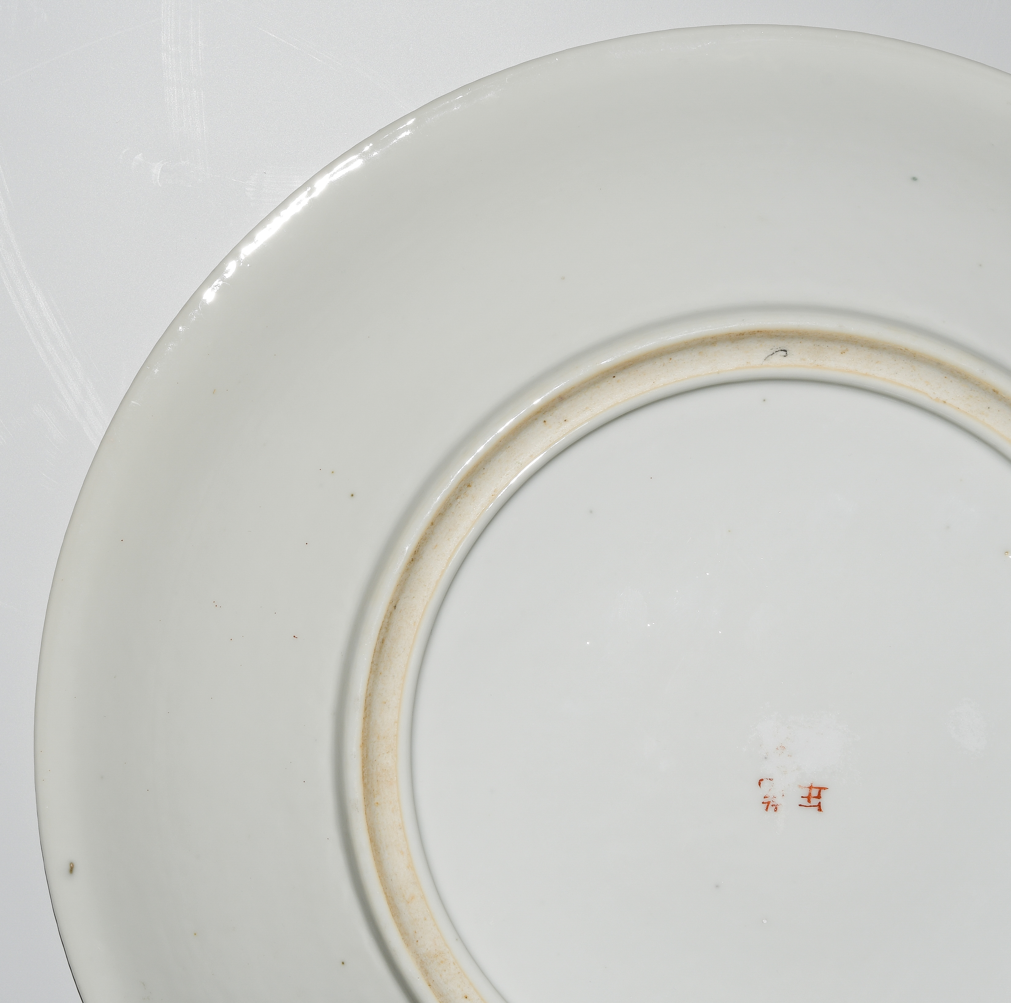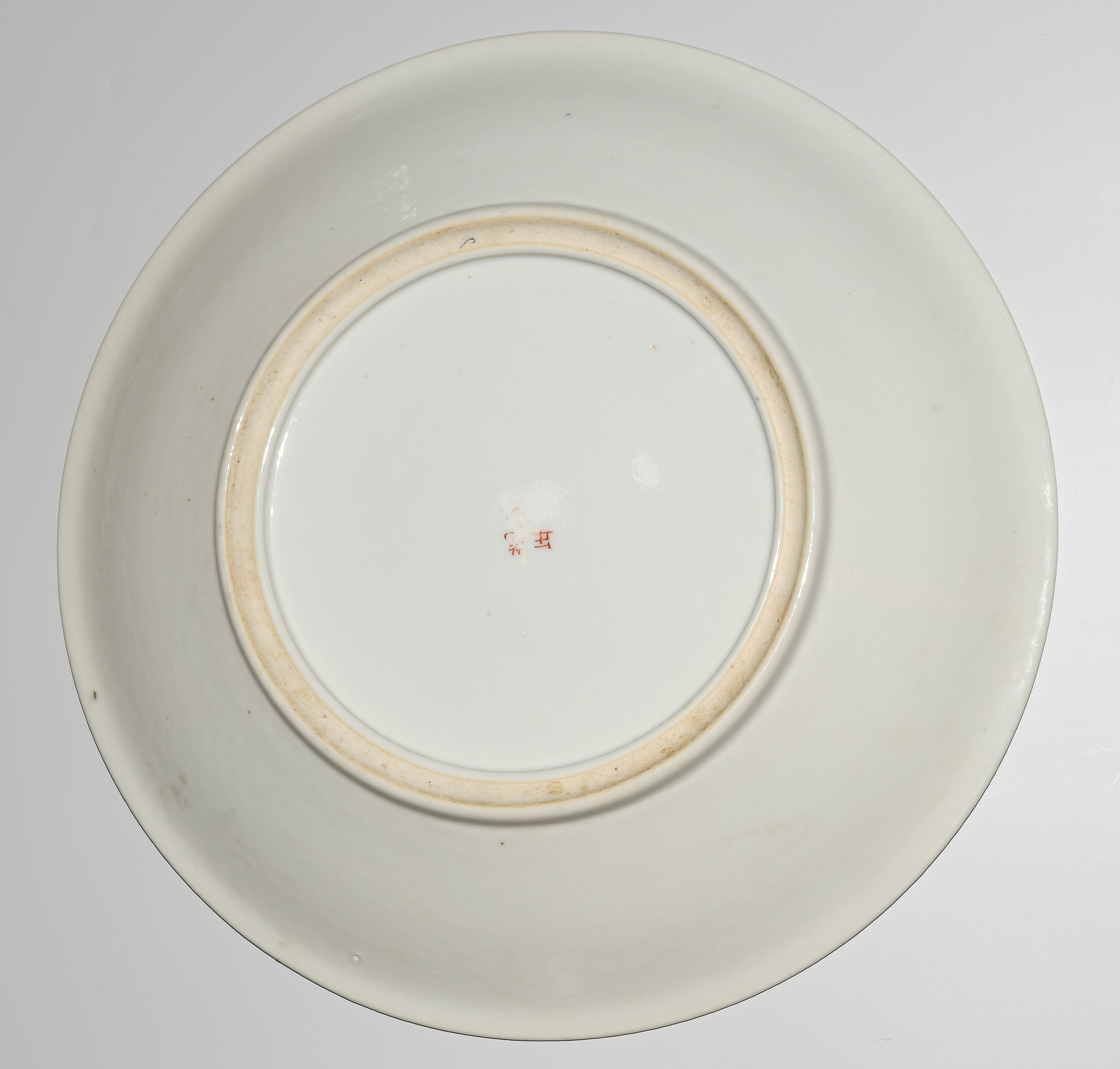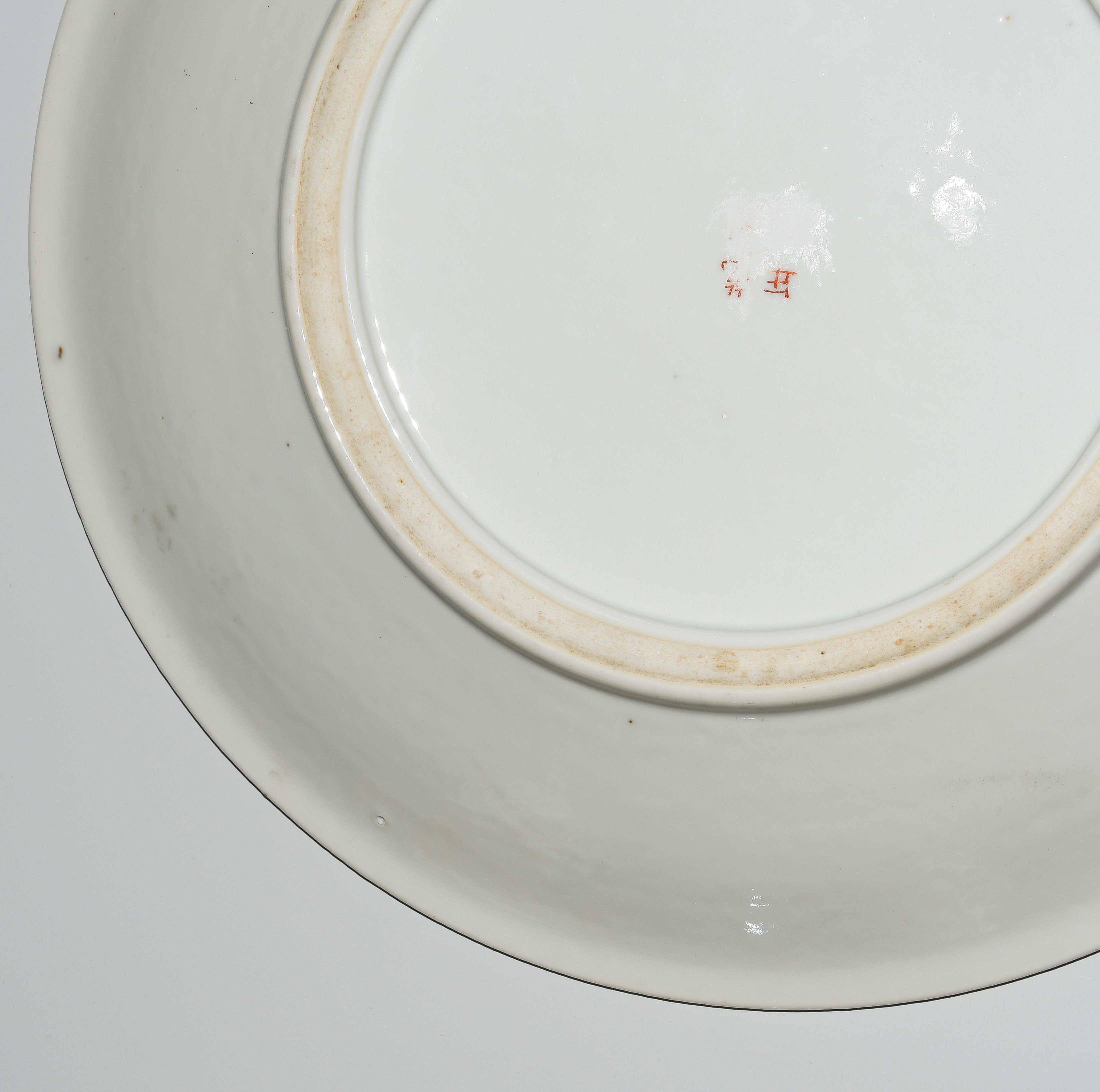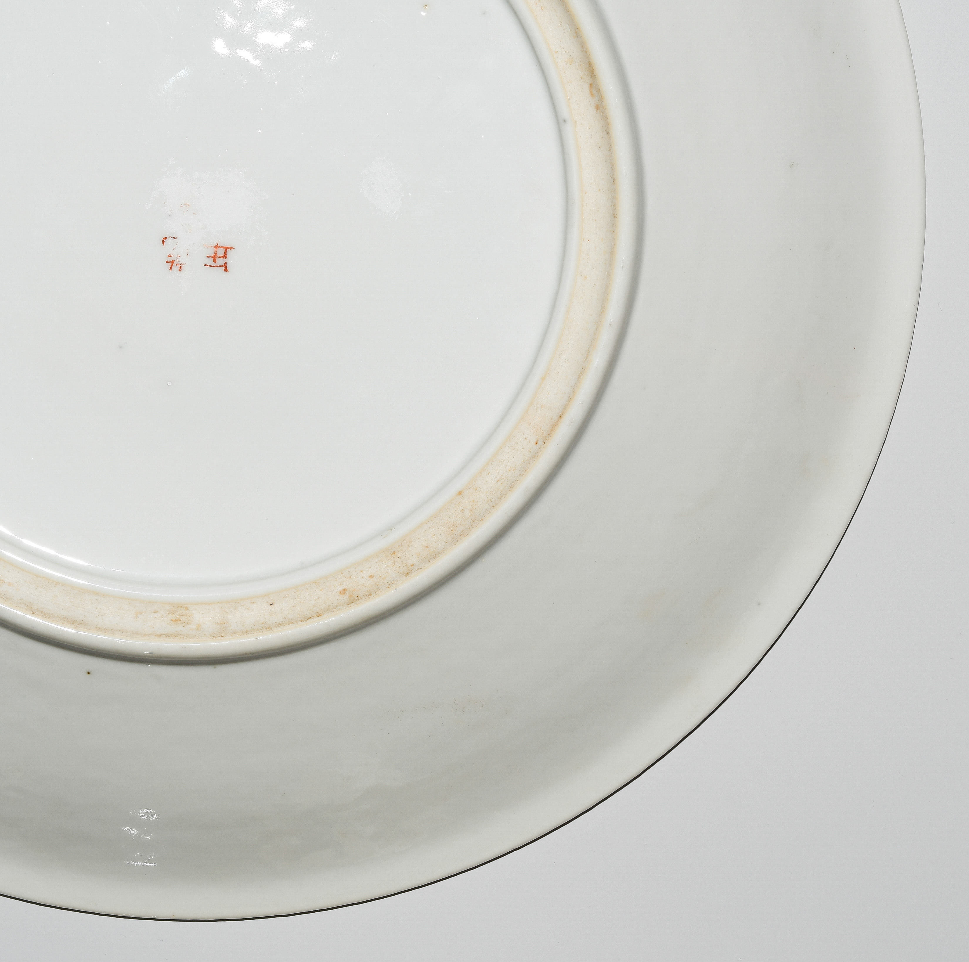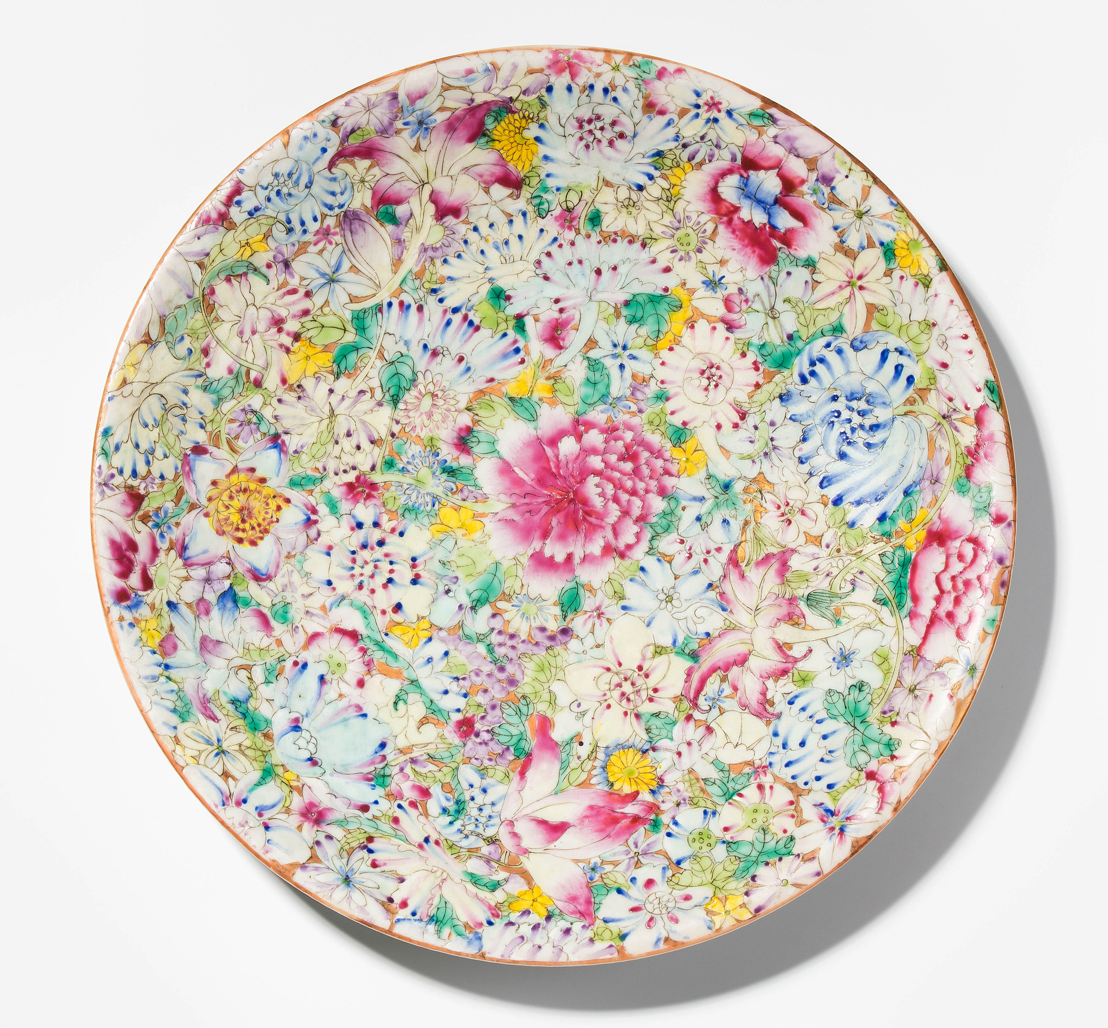 China, 20.Jh. Porzellan. Millefiori-Dekor in Famille rose. Mit ausgekratzter Kangxi-Marke. H 5, D 33 cm.