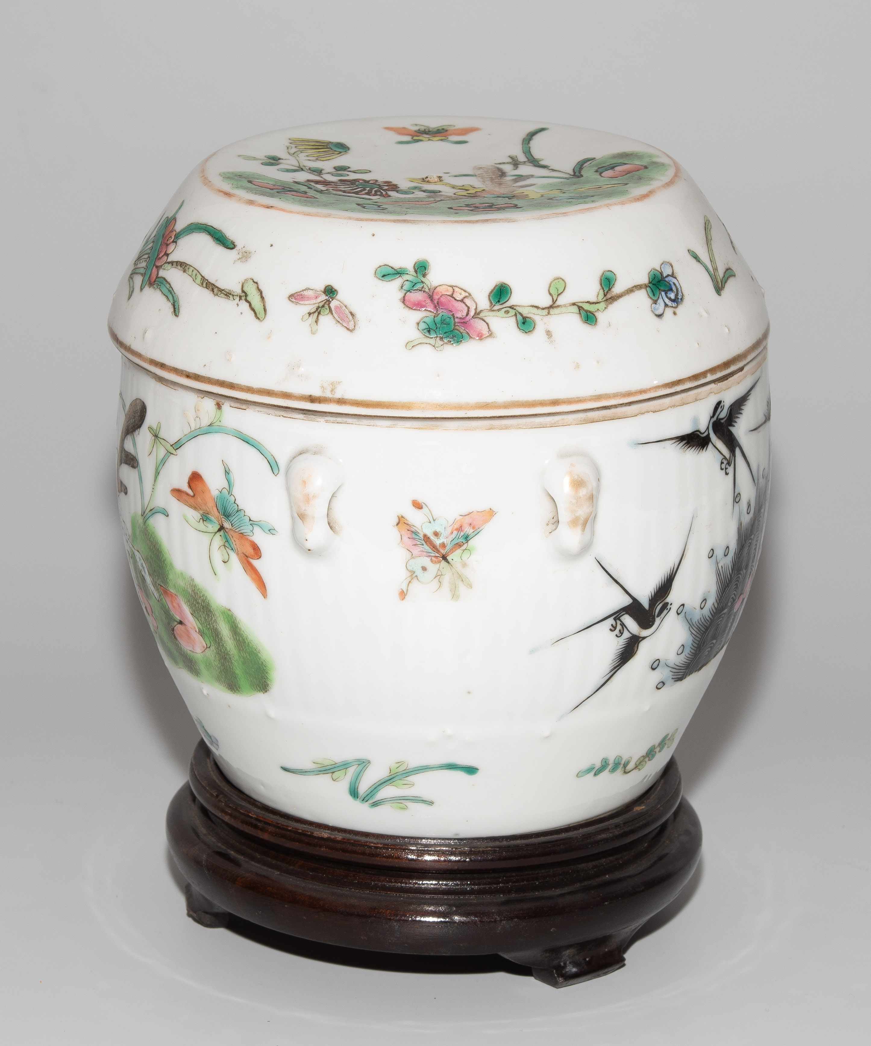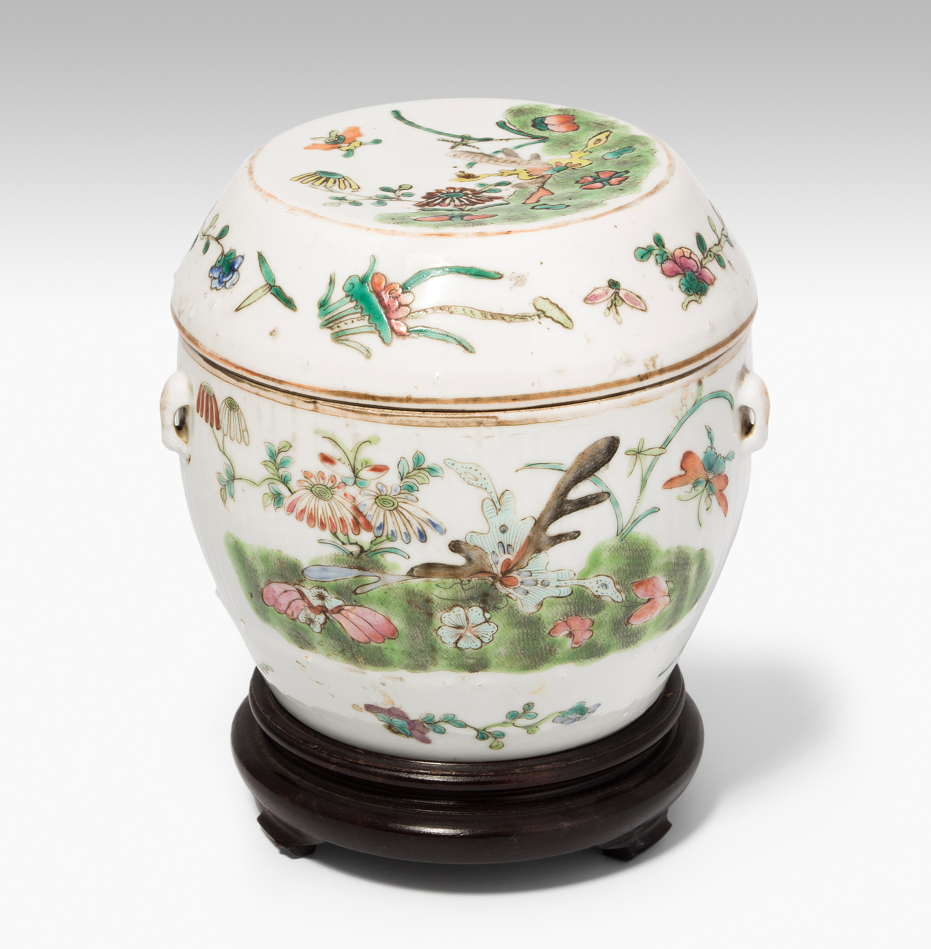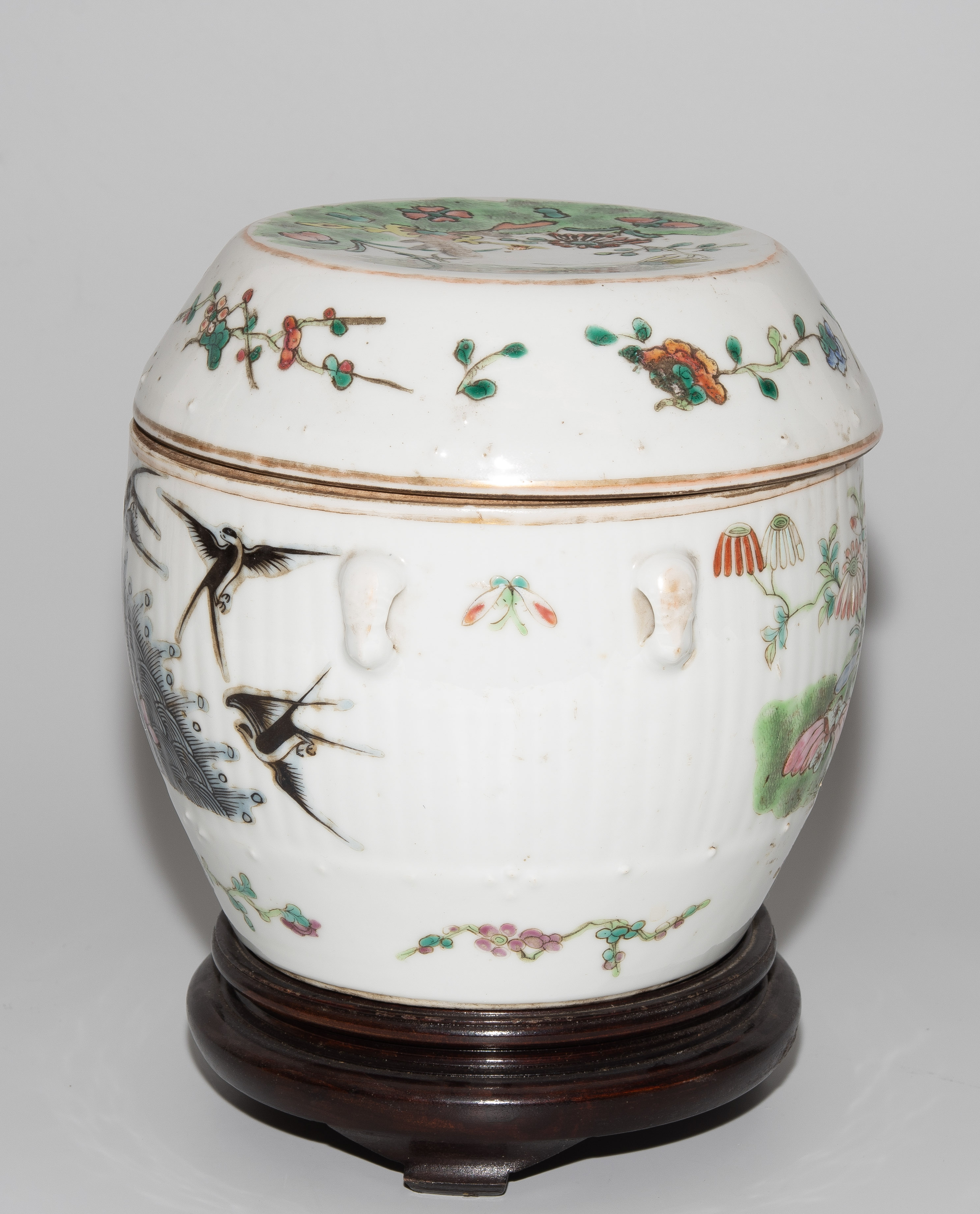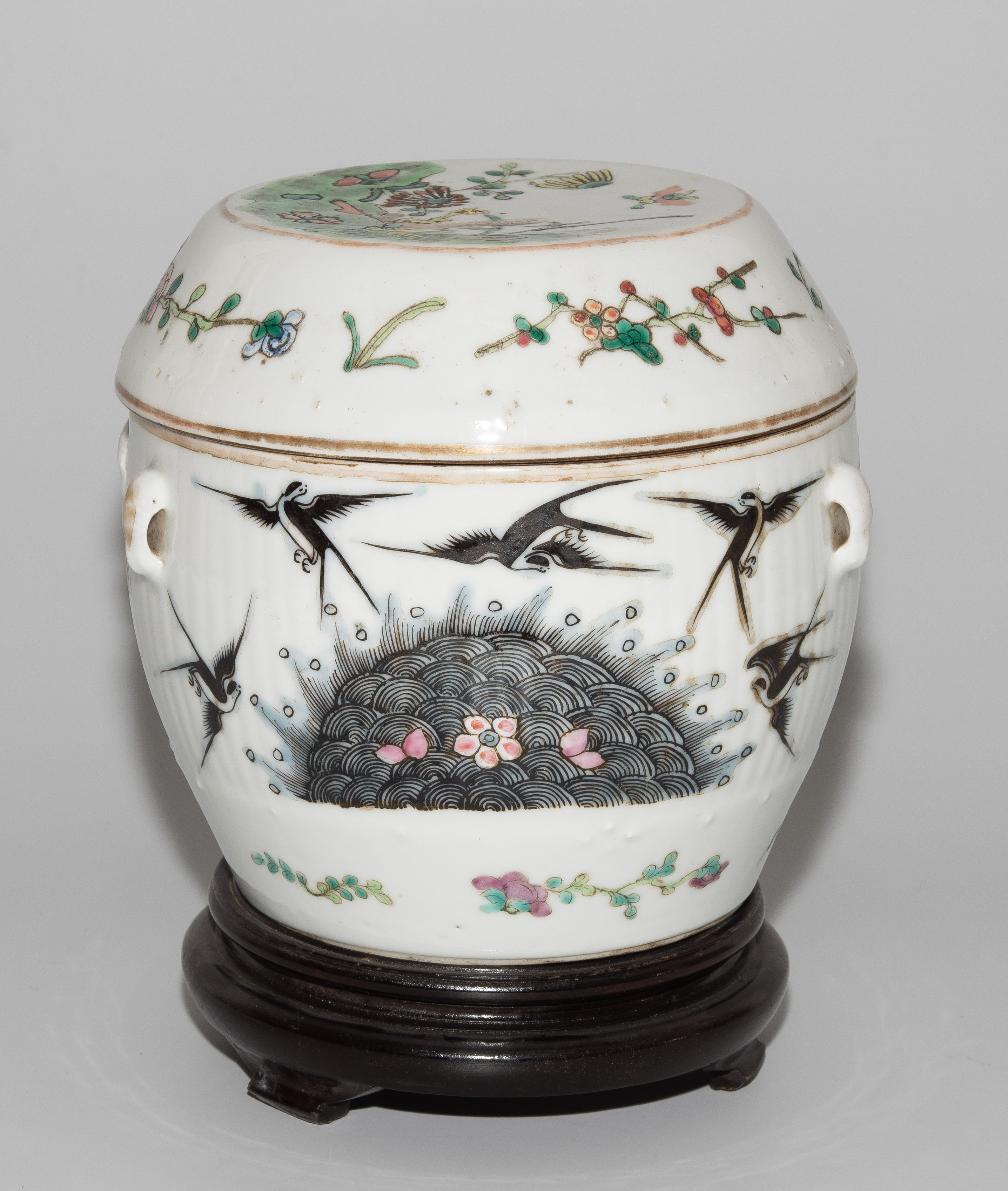 China, um 1900. Porzellan. Trommelförmiges Gefäss mit vier Henkeln, bemalt mit Blumen-, Schwalben- und Insektendekor in Famille verte. H 16,5 cm. - Knauf fehlt.