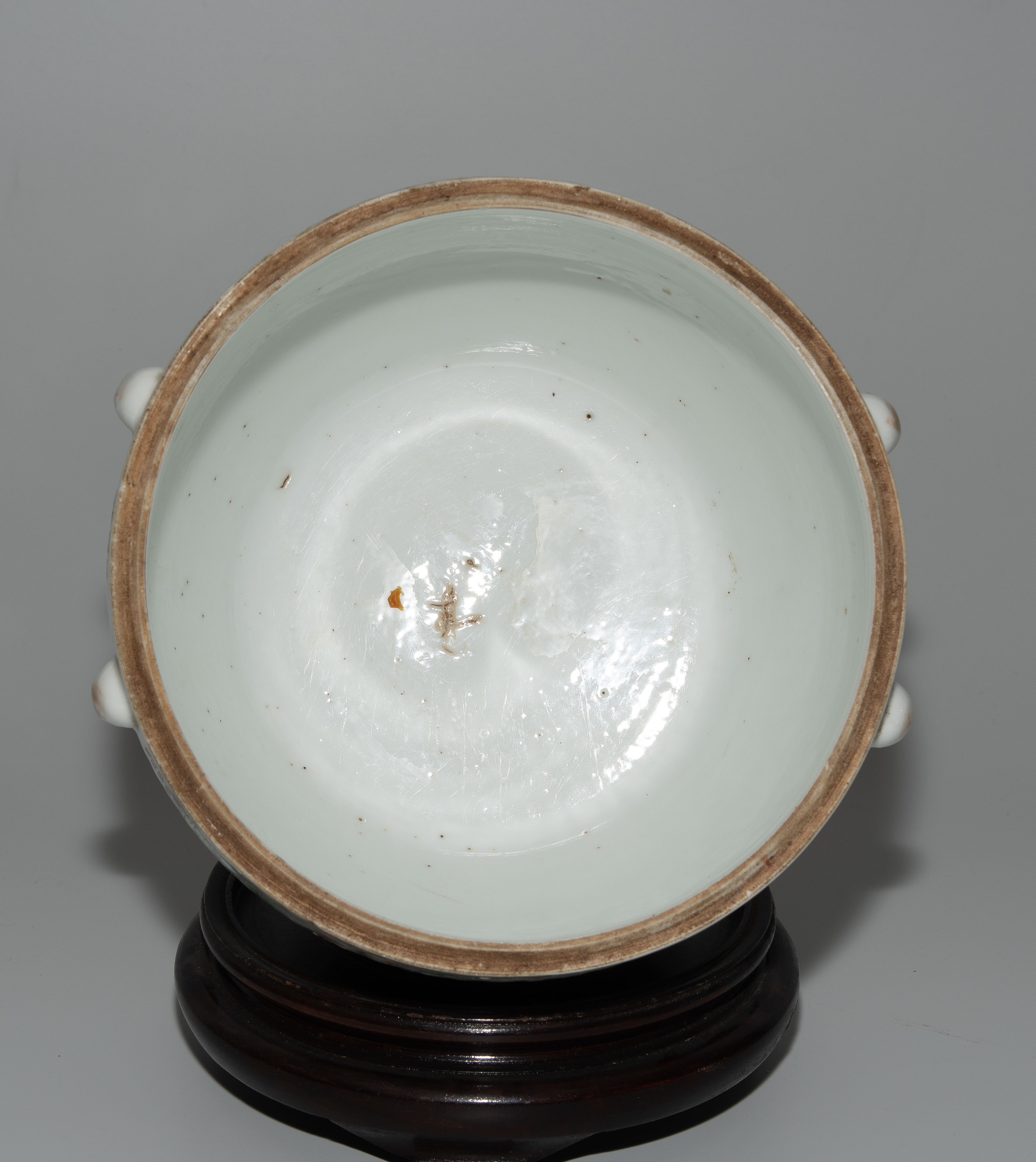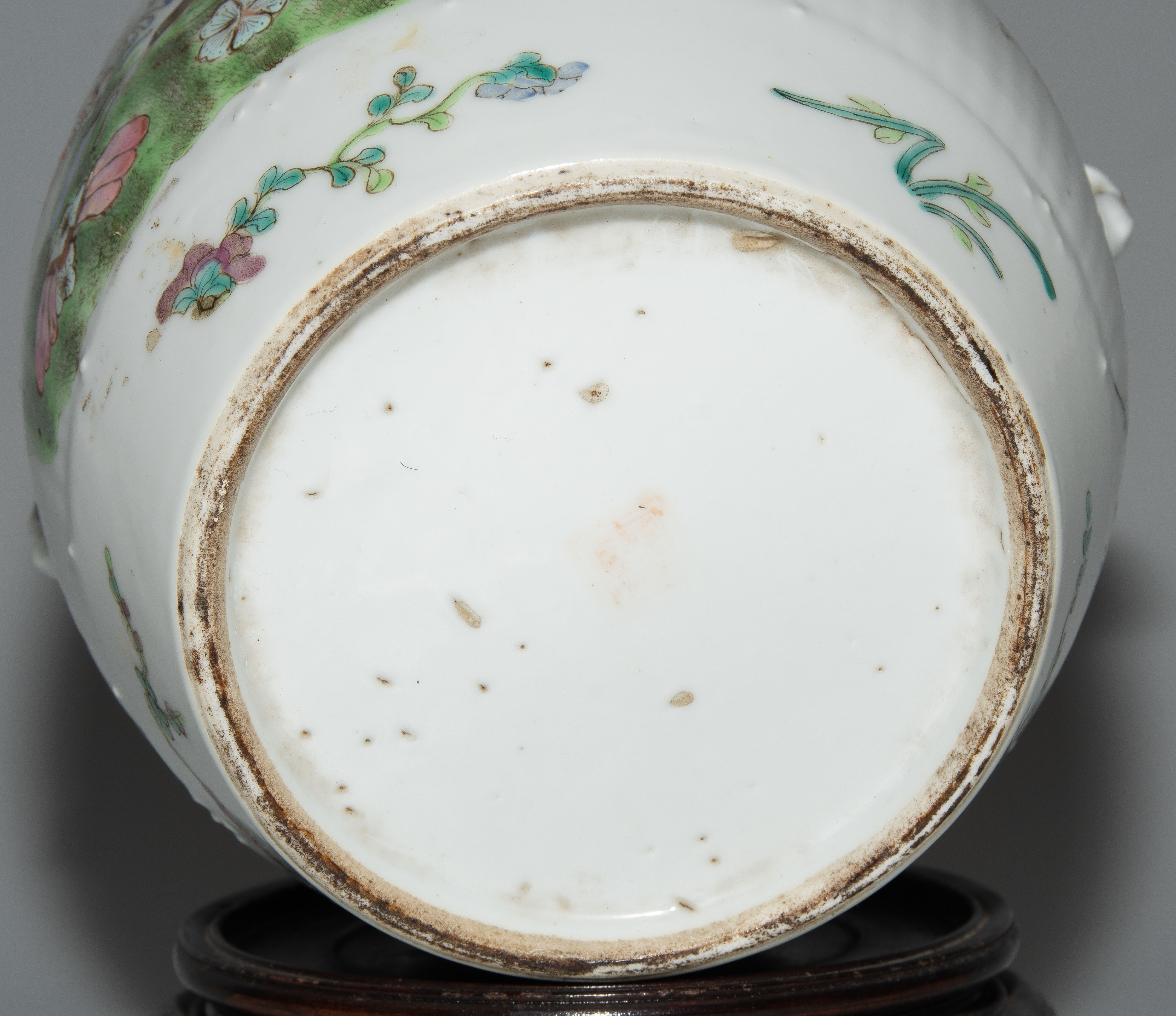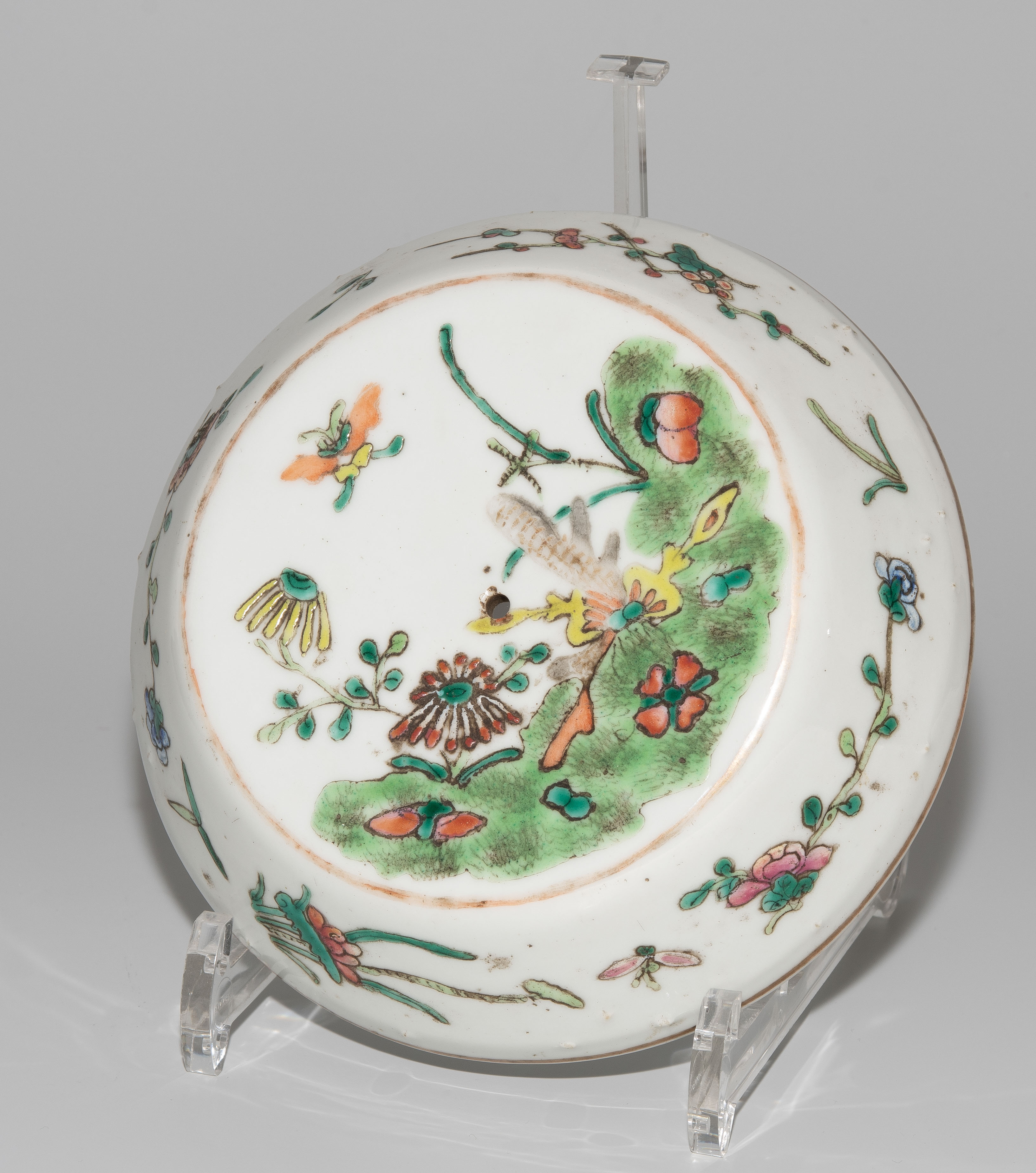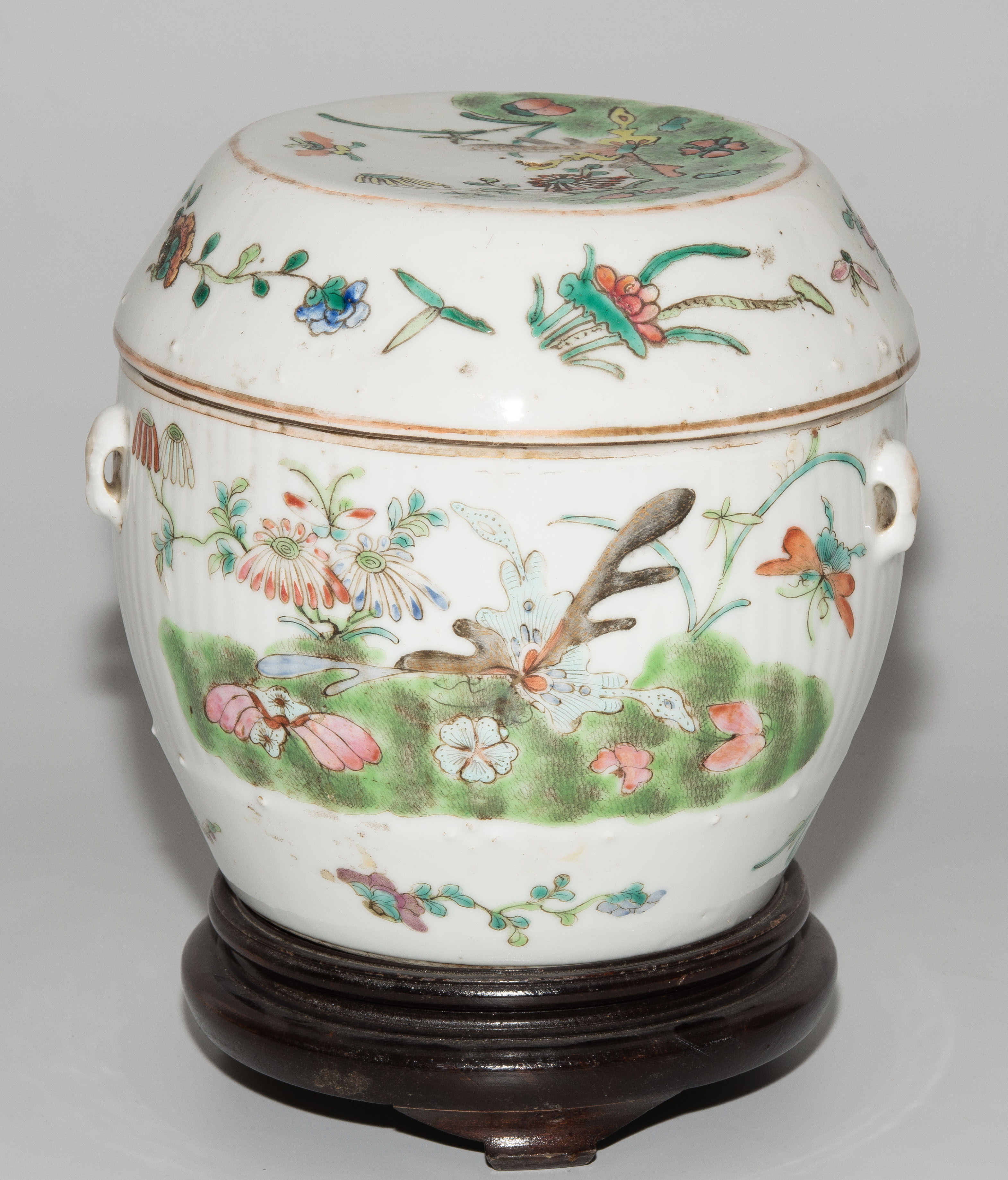 China, um 1900. Porzellan. Trommelförmiges Gefäss mit vier Henkeln, bemalt mit Blumen-, Schwalben- und Insektendekor in Famille verte. H 16,5 cm. - Knauf fehlt.