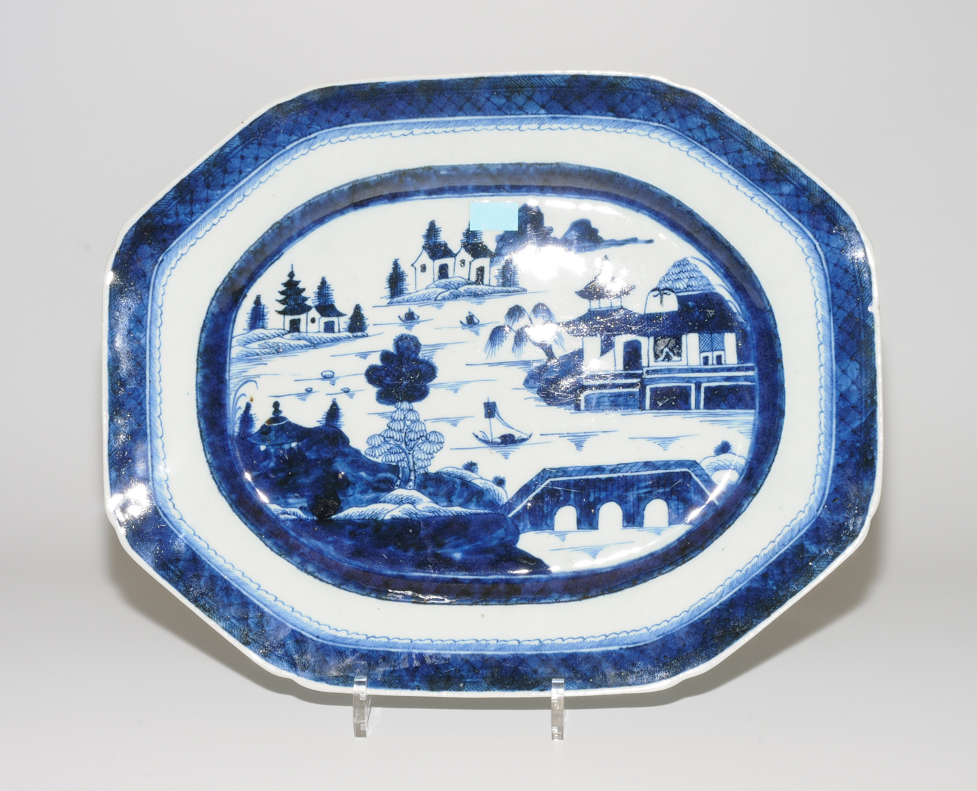 China. Porzellan. Achtpassig. Landschaftsdekor in Unterglasurblau. 31,5x39,5 cm. - Bestossen.
