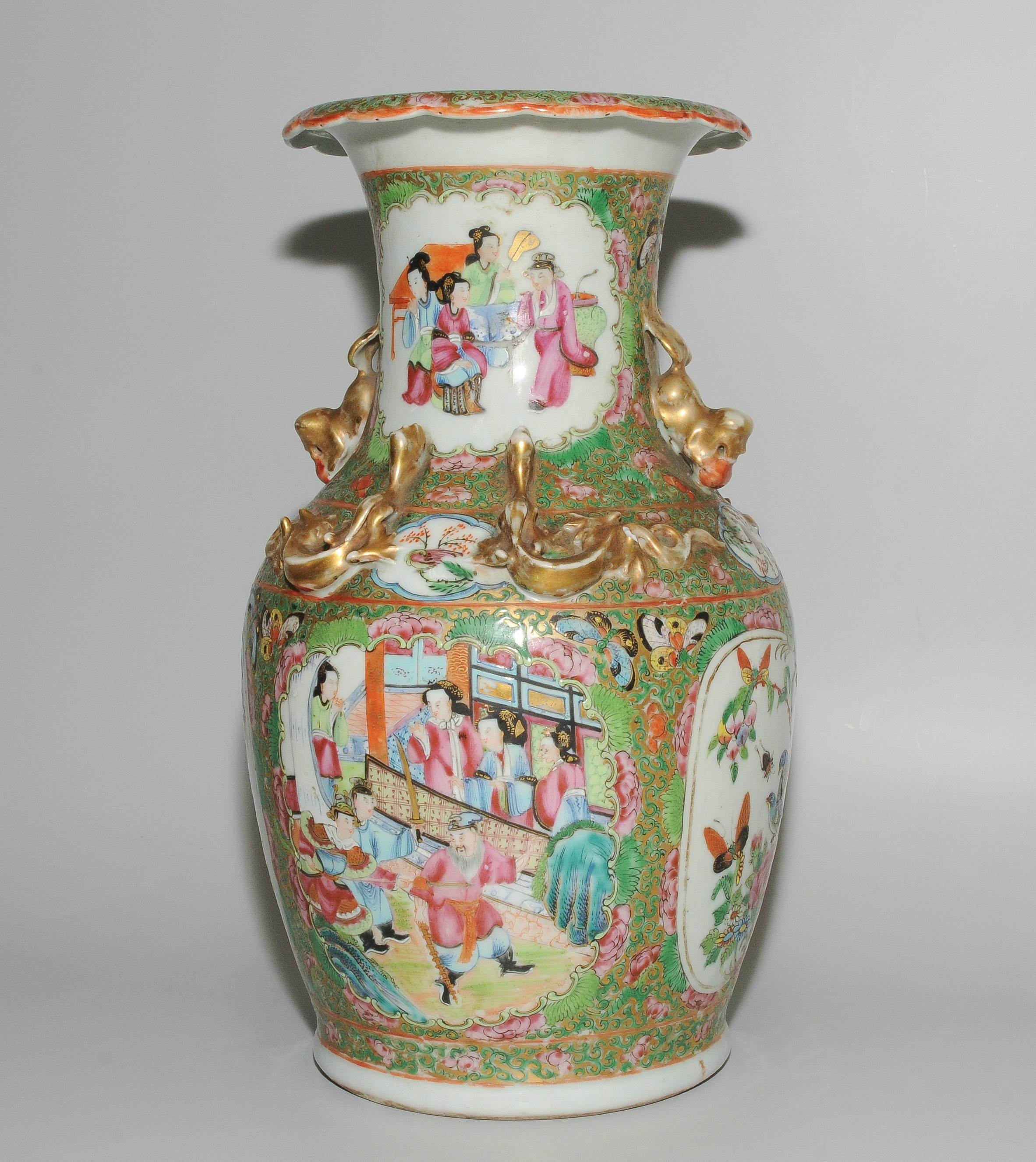 China, Ende 19.Jh. Kanton Famille rose. Balusterform. Figürliche Szenen in den Paneelen, umgeben von Blumen-, Schmetterling- und Vogeldekor. Schulter mit plastischen, vergoldeten Chilong-Drachen und Handhaben in Form von Fo-Hunden. H 33,5 cm. - Chip. Alters- und Gebrauchspuren.