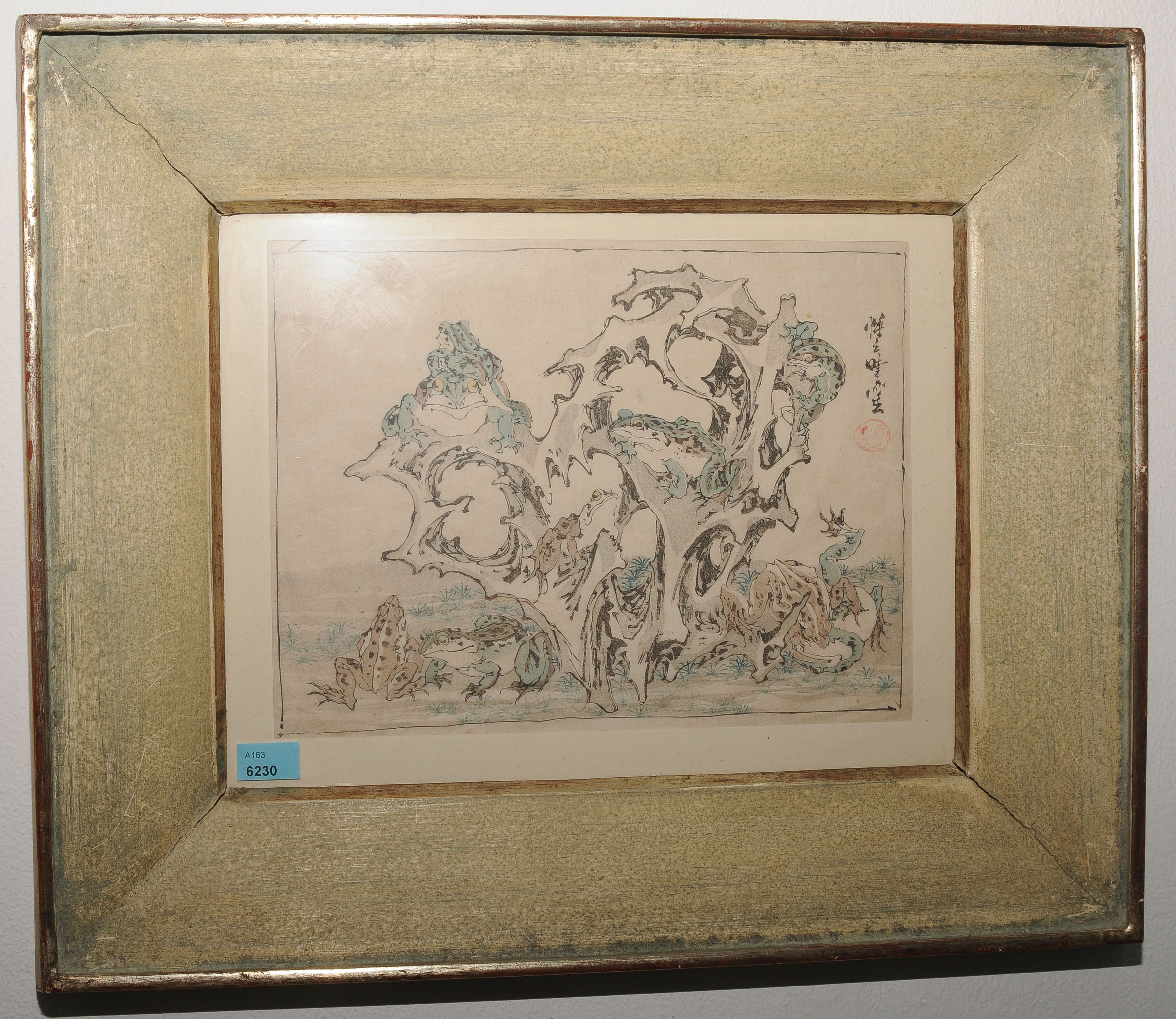 Japan, wohl 20.Jh. Spielende Frösche in Braun- und Grüntönen. 19,5x26 cm. Gerahmt 37,5x44,5cm.