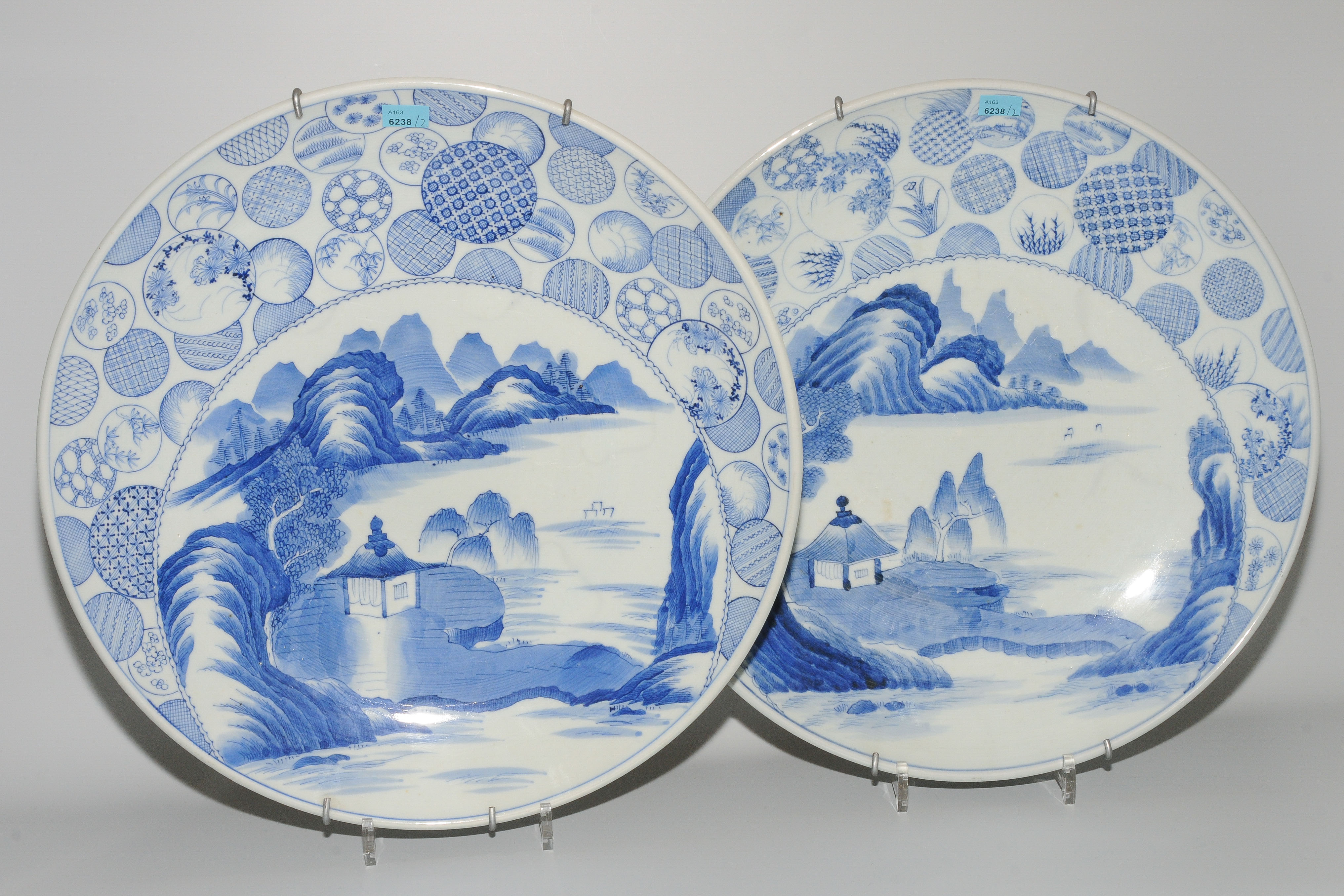 Japan, Anfang 20.Jh. Porzellan. Darstellung in Unterglasurblau einer Seelandschaft mit Pavillon sowie geometrische und Pflanzenmotive im oberen Drittel. D 43cm.