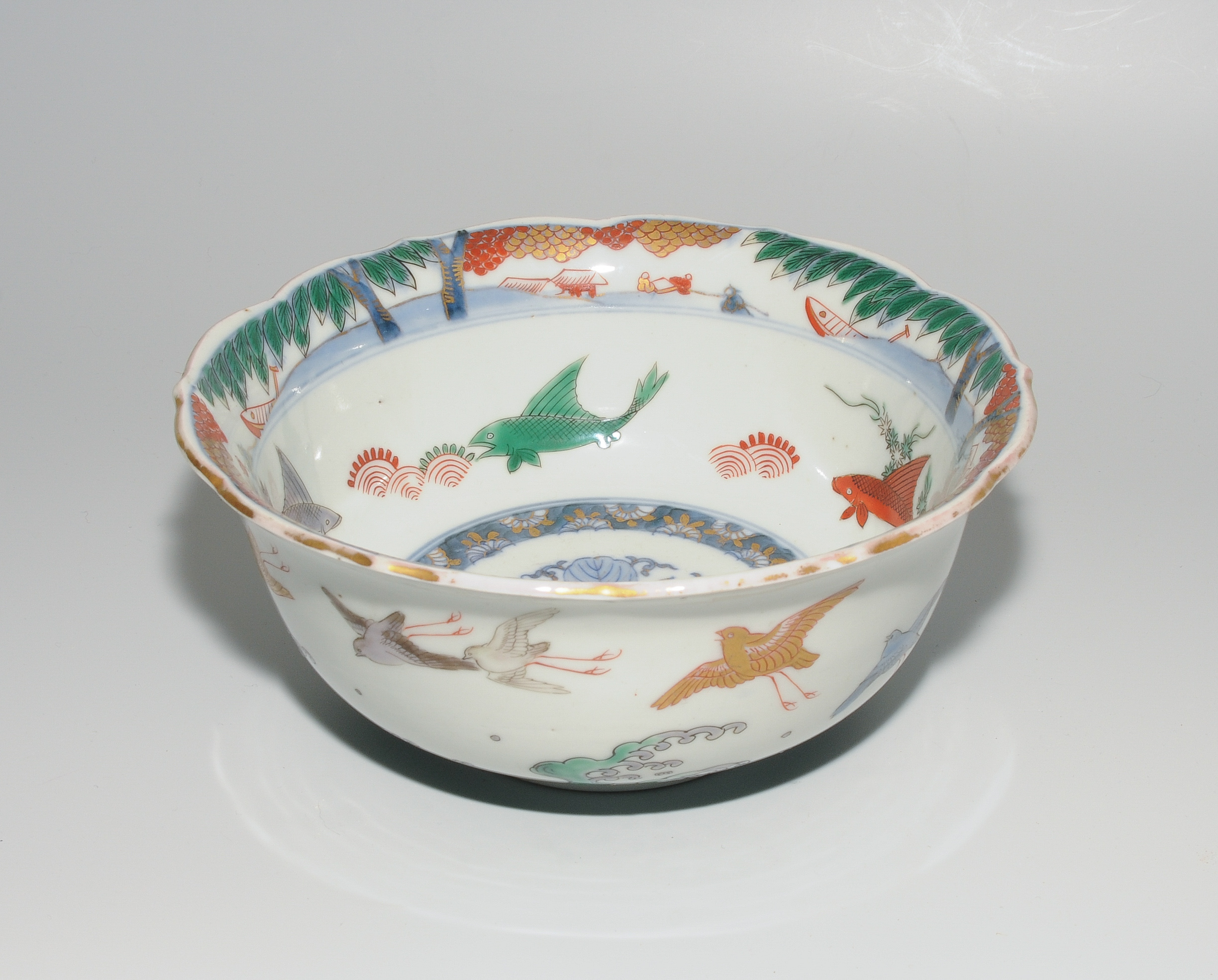Japan, 19.Jh. Porzellan. Kutani. Rote Marke. Fischdekor in Unterglasurblau, Rot, Grün und Gold. H 8,5, D 18,5 cm.