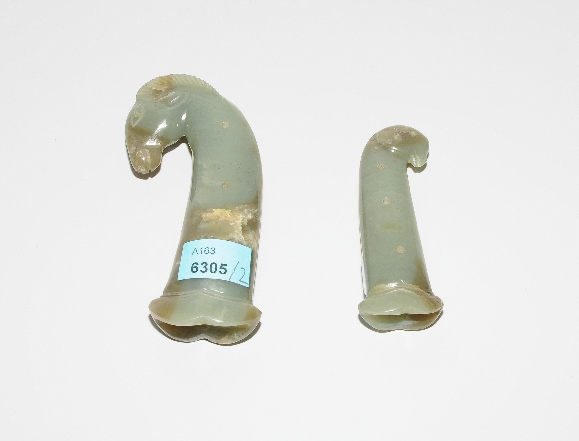 Mittelitalien, 3.–1.Jh. v. Chr. Jade. 2 Dolchgriffe aus graugrünem Stein mit braunen und weissen Zonen. Einer in Form eines Pferdekopfes, der andere in Form eines Vogelkopfes geschnitzt. L 11 bzw. 8,5 cm.