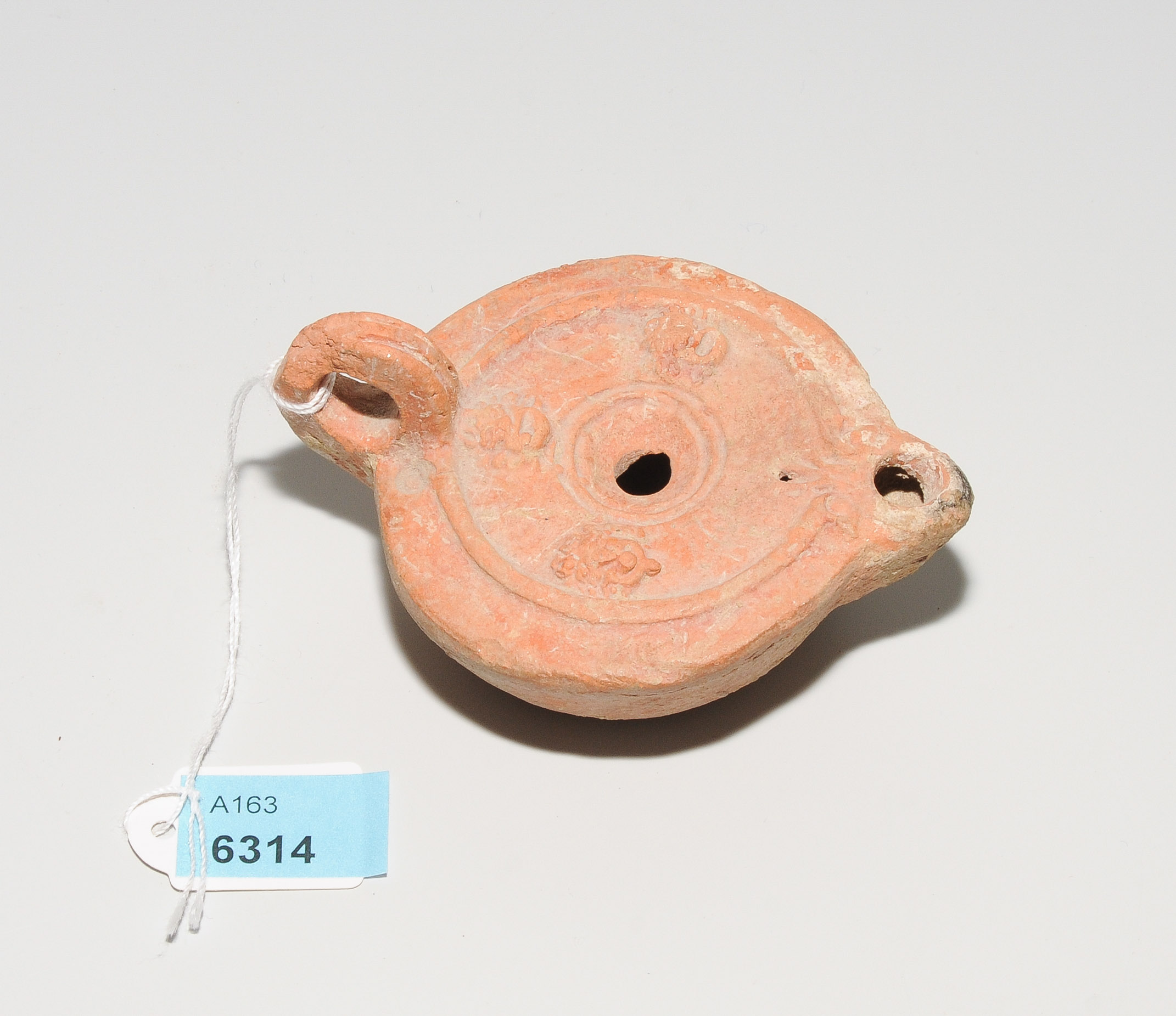 Römisch, 2./3.Jh. n. Chr. Anatolien. Rötlicher Ton. Gerippter Henkel und Standring. Halbrunder Schnauzenansatz. Auf dem Spiegel Kreise und drei komische Masken. Mit Fuss-Stempel. L 8,5 cm.