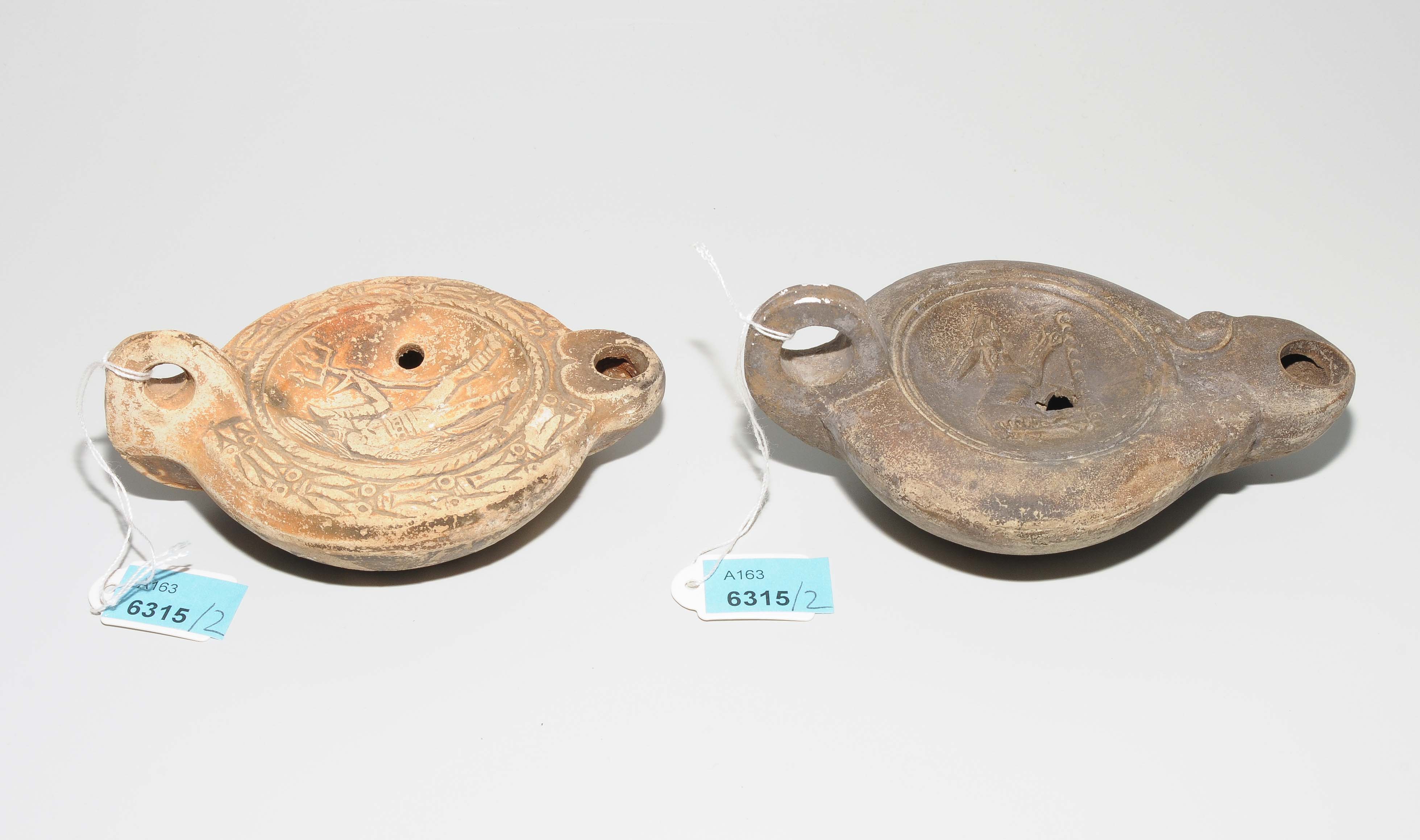 Römisch, Kaiserzeit. Terrakotta. Zwei Lampen mit gerundeter Schnauze. Eine Öllampe mit Darstellung eines Retiarius im Spiegel, die andere mit Darstellung einer Ziege im Spiegel und LMADIEC Werkstattstempel im Boden. L 11 bzw 12.5 cm. - Diverse Schadstellen.