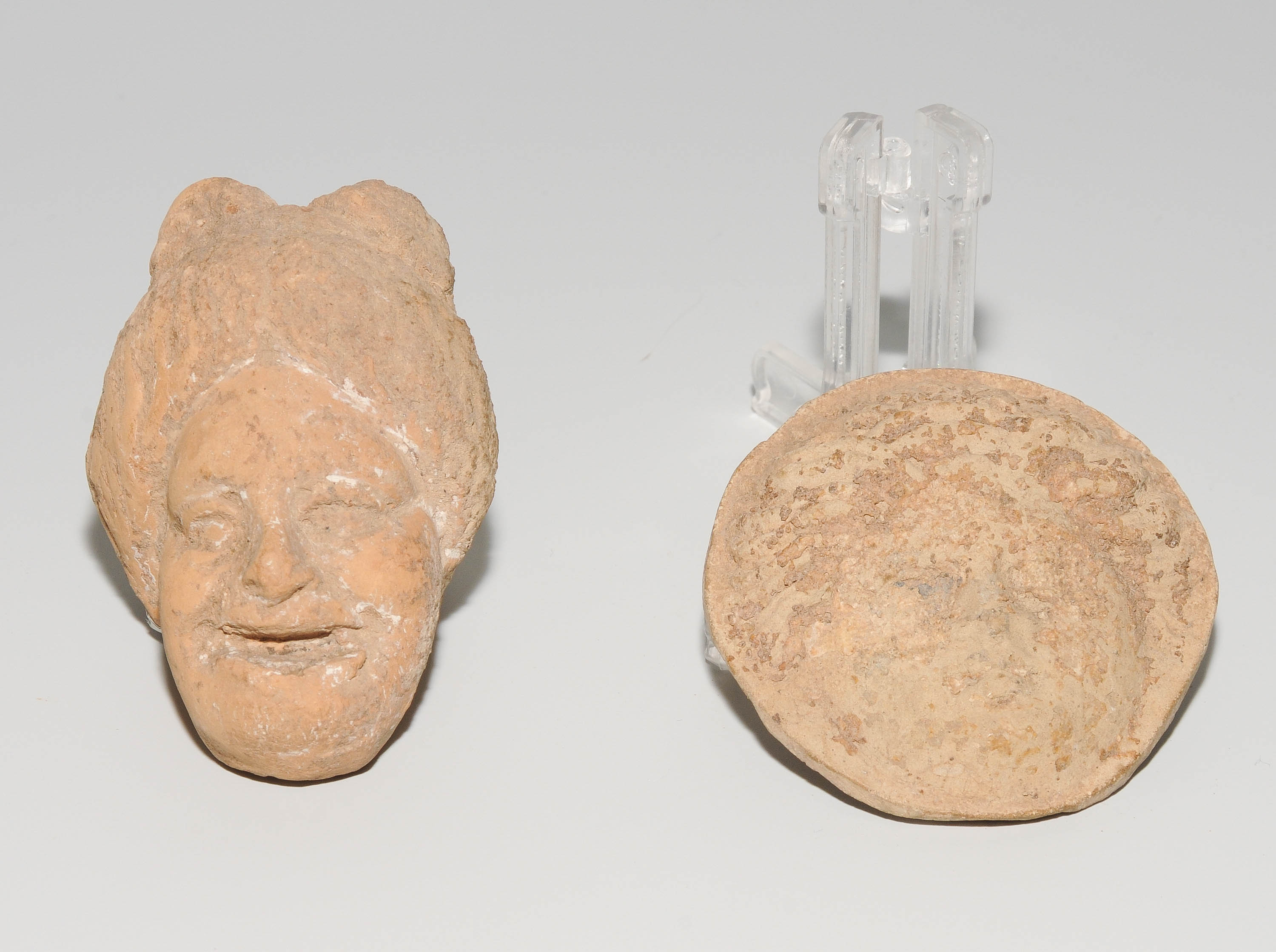 Griechenland, 4.Jh. v. Chr. Terrakotta mit Resten weisser Bemalung. Ein rundes Relief mit Medusenkopf sowie ein Gorgonenhaupt. D 5,5 bzw H 6,5 cm. - Versintert.