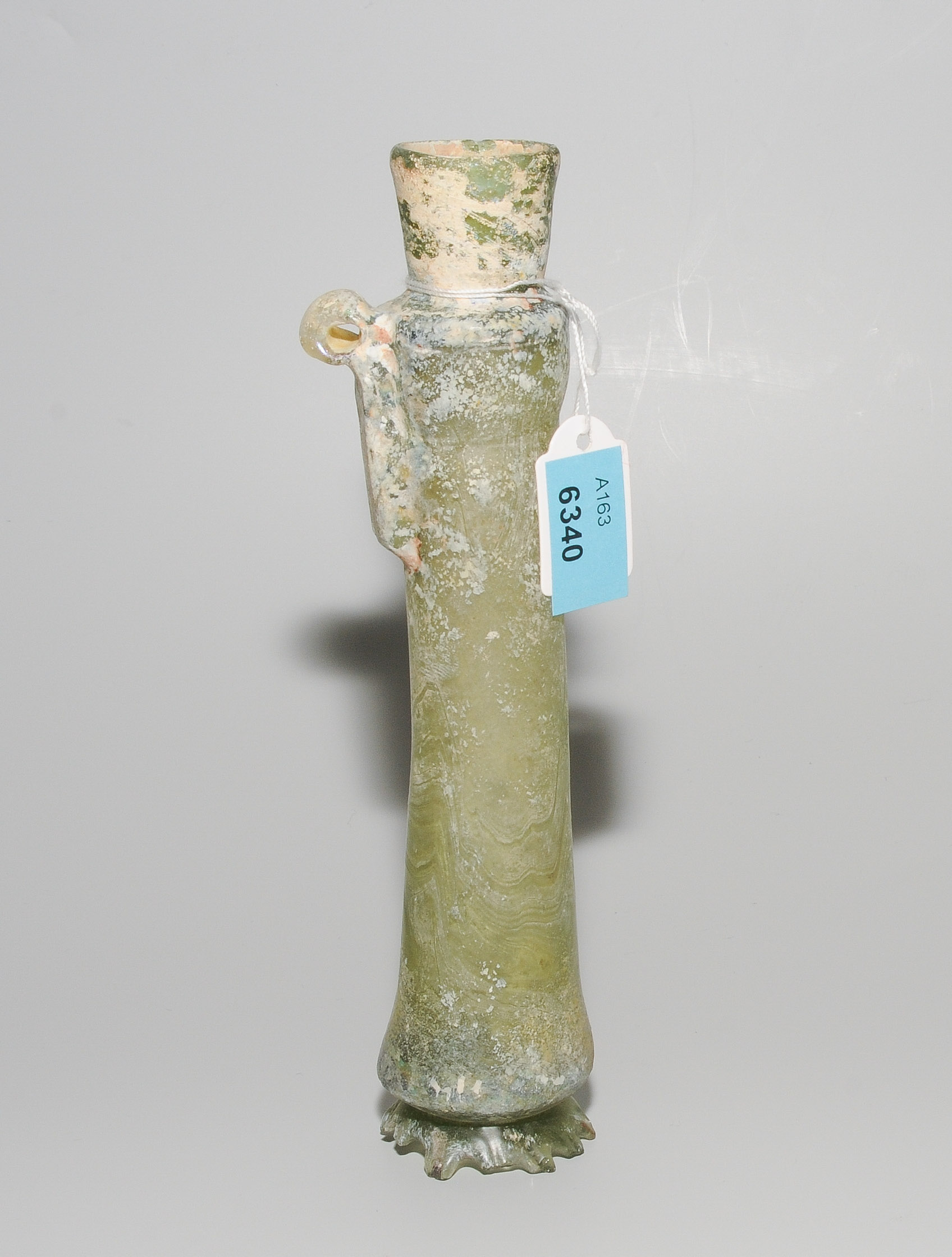 Syrien, 11.–12.Jh. Transparentes hellgrünes Glas. Langgezogene, leicht taillierte Form mit kleinem ringförmigen Henkel und blattförmigem Fuss. Leicht irisierende Stellen um den Henkel. H 17 cm. - Leicht korrodiert.