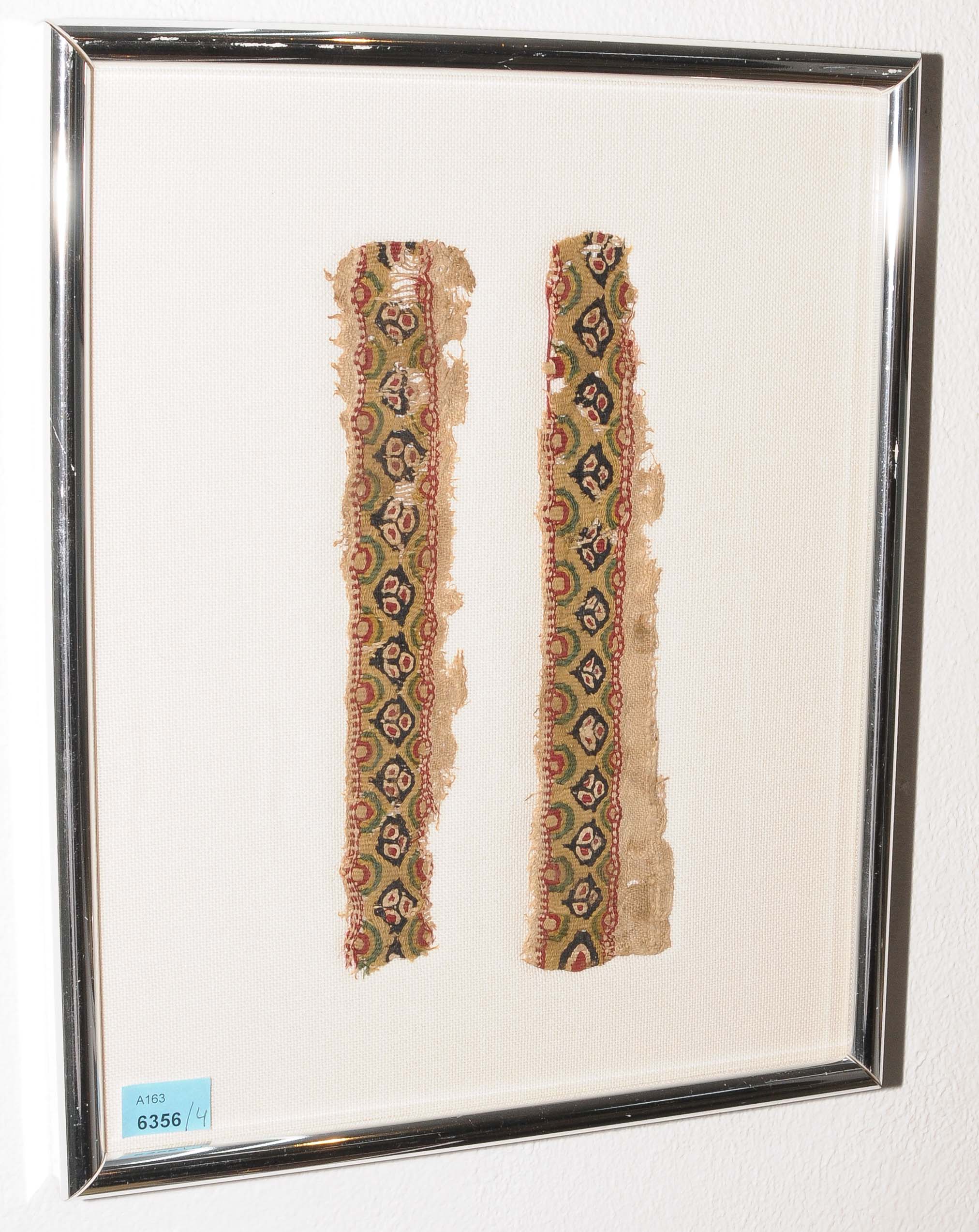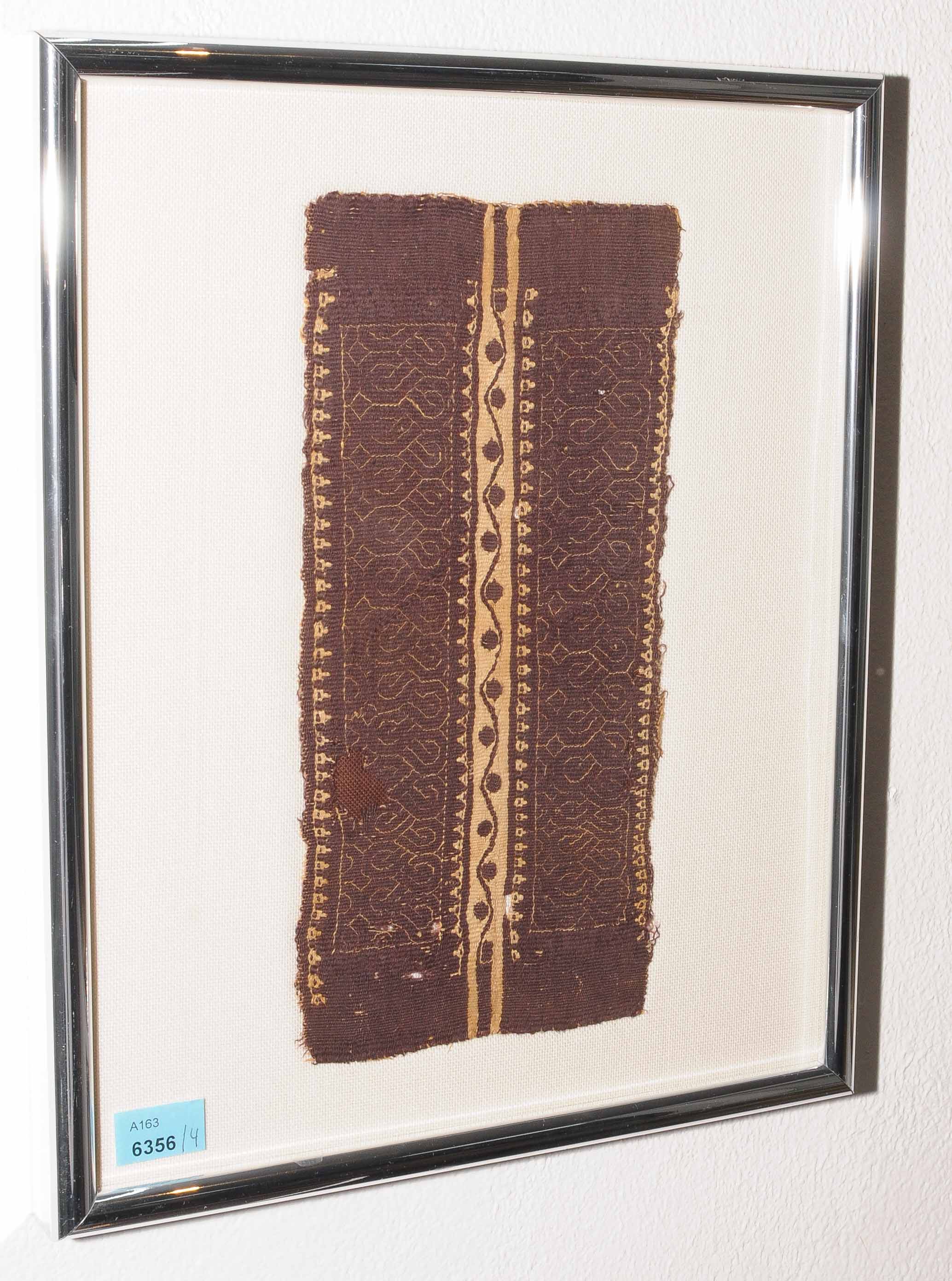 Ägypten, 5.Jh. Leinen. Ein Fragment mit geometrischen Mustern auf dunkelbraunem Grund, zwei florale Bordüren auf gelbem Grund sowie ein Fragment mit Inschrift und Kreuz in Kartusche. 24x11 / 20x3 / 21x3 / 12x45 cm. Alle Fragmente gerahmt. - Löcher, Altersspuren.