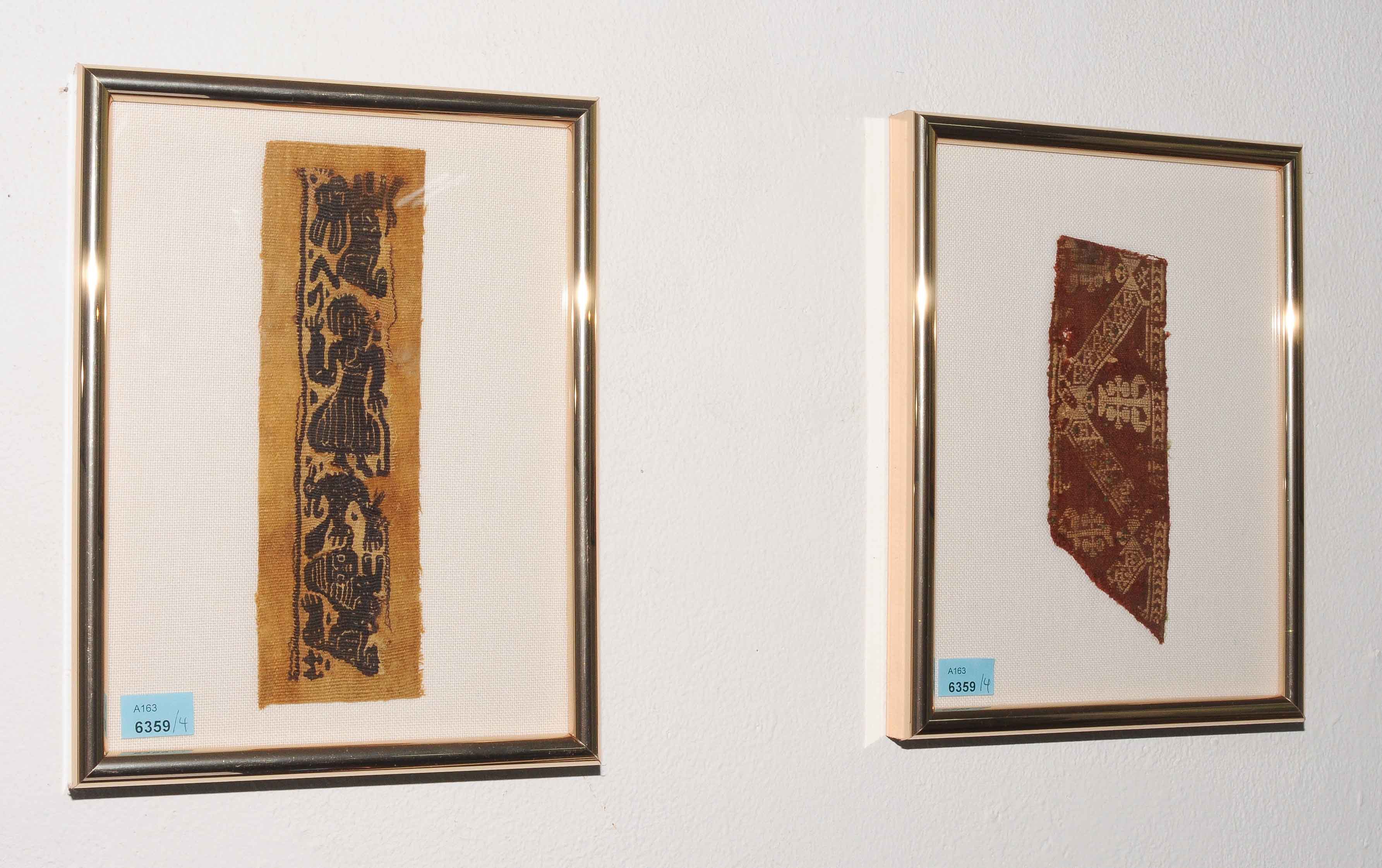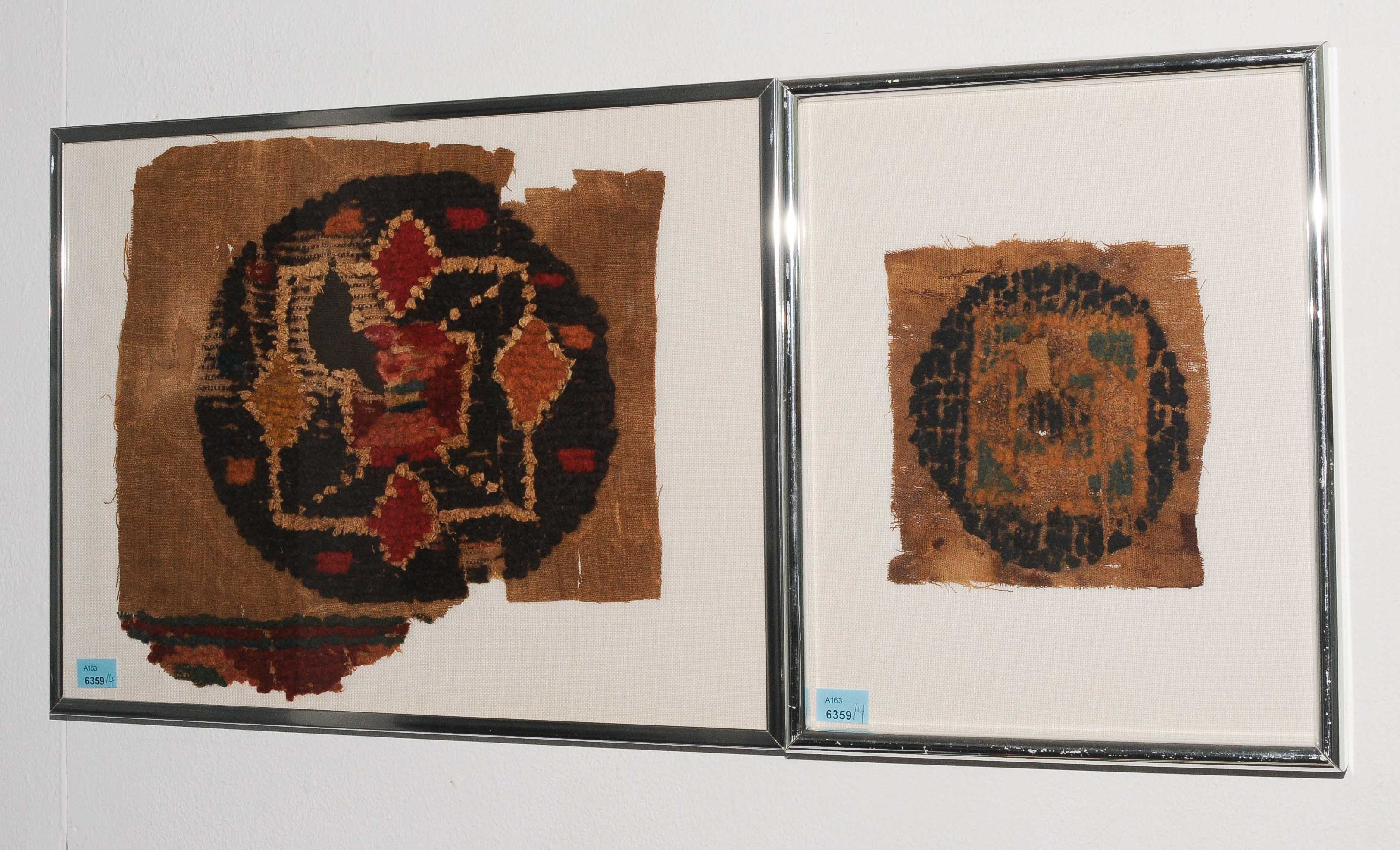 Ägypten, 5.–8.Jh. Leinen und Seide. Zwei polychrome Medaillons in Bouclé-Technik, ein Bordürenfragment in Brokat-Technik auf rotem Grund sowie ein Zierband mit Sphinx-Muster. Medaillons 30x28 / 16x15, Bordüre 16x6, Zierband 20x6 cm. Gerahmt. - Fehlstellen.