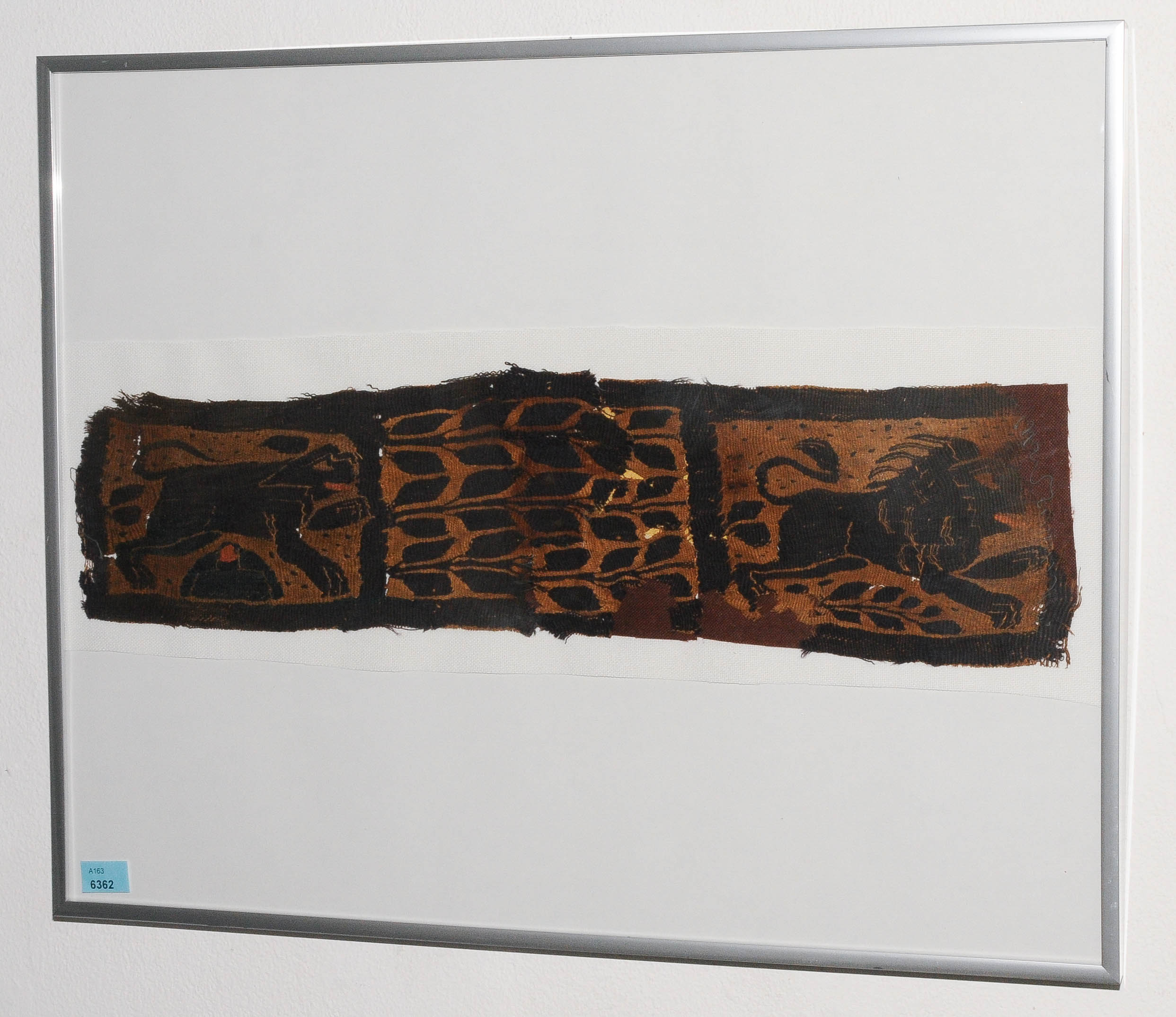 Ägypten, wohl Antinoe, 5.Jh. Leinen. Zierstreifen mit Darstellung eines springenden Löwen und eines Panthers nach altiranischer Art. Zwischen den Tieren drei Lebensbäume. 47x12 cm. Gerahmt. - Fehlstellen.