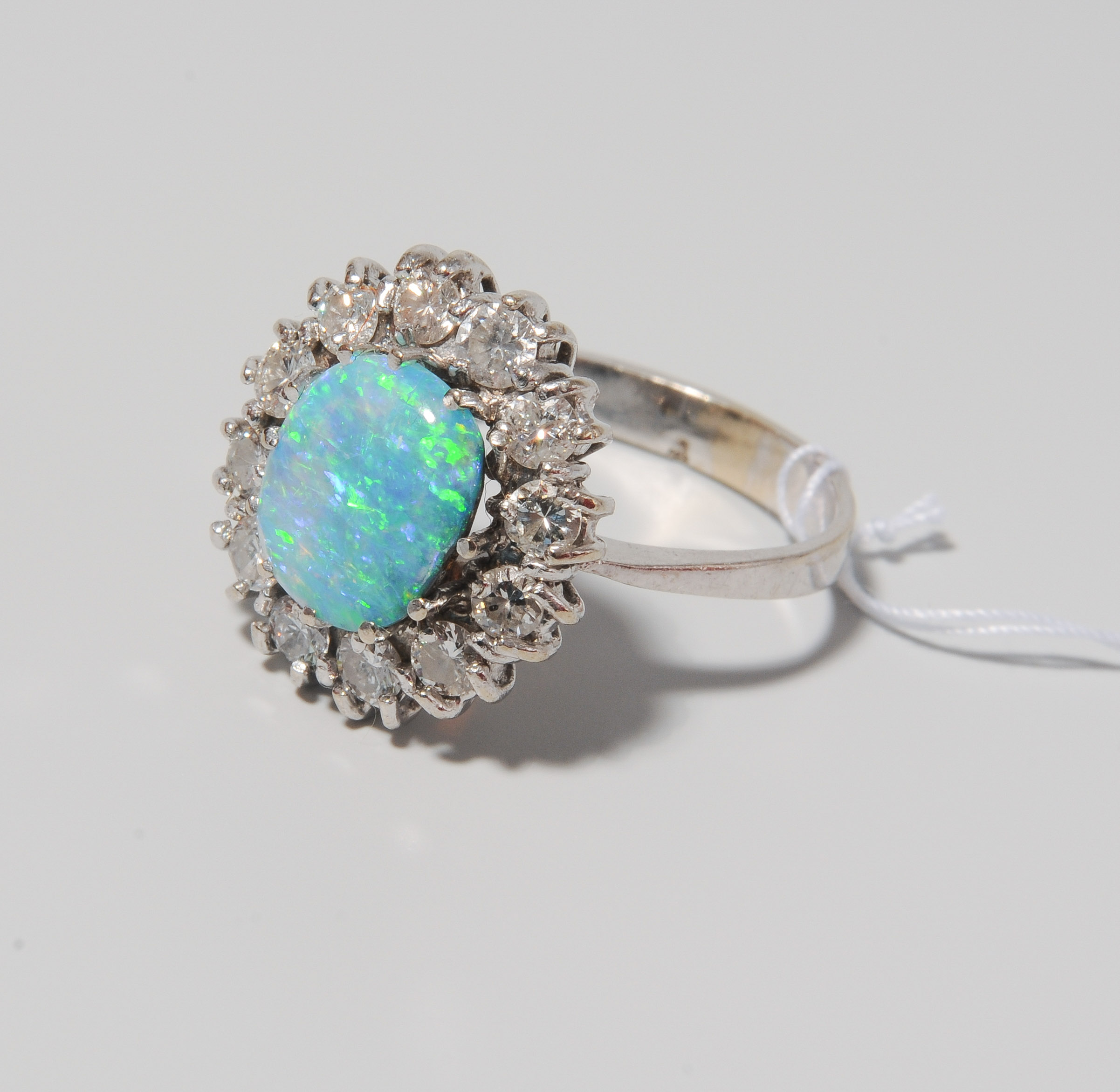 585 Weissgold. Ovaler Boulderopal Cabochon (etwas rissig) ca. 2 ct, 12 Brillanten ca. 1.20 ct. Gr. 53, 5,3 g.