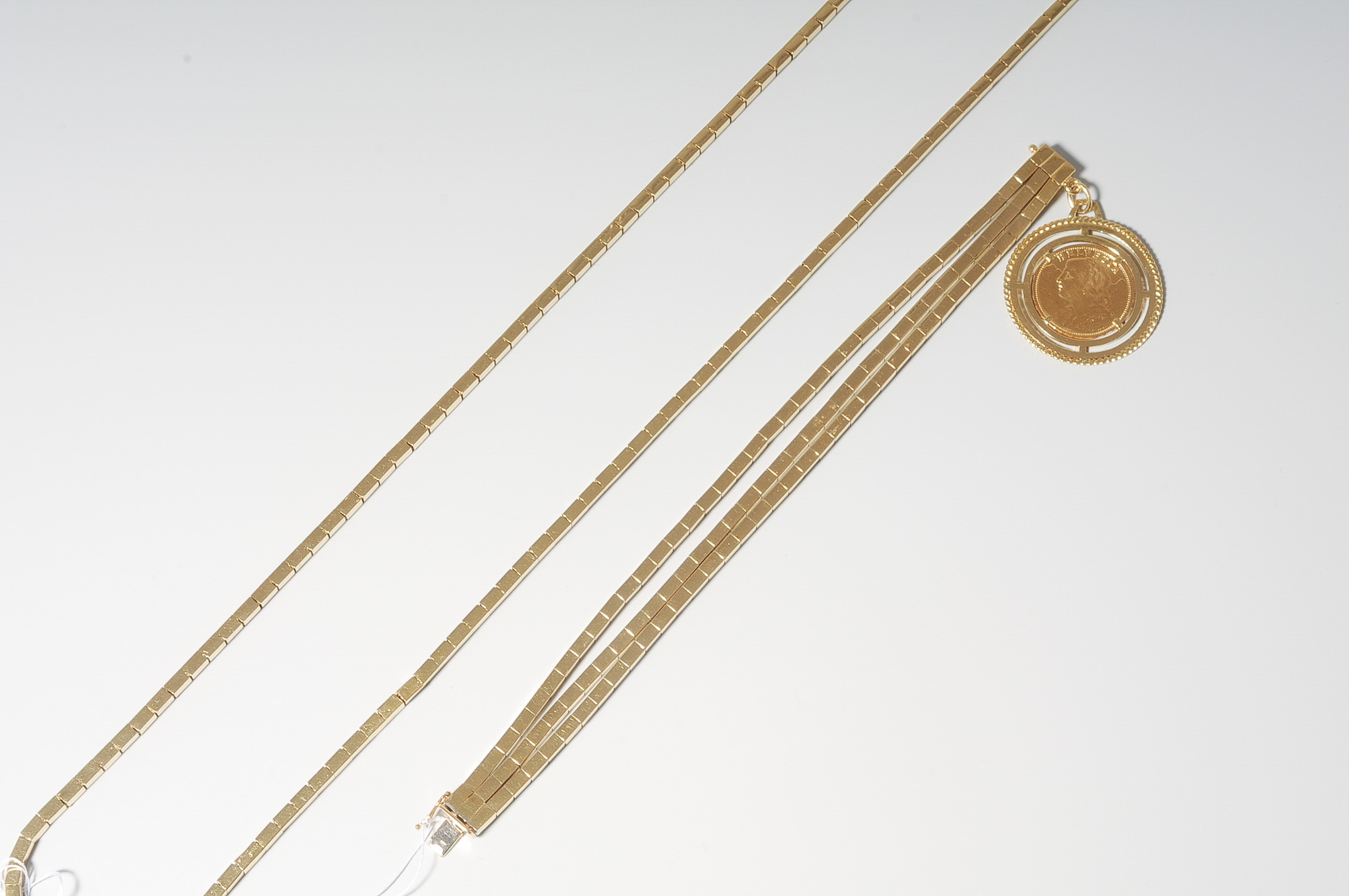 750 Gelbgold. Bracelet 3-reihig mit Goldvreneli Fr. 20.- in Fassung 3,4 cm Ø, L 19 cm, B 1cm. Kette (einige Dellen) L 80 cm, B 0,3 cm. Gesamtgewicht 98,2 g.