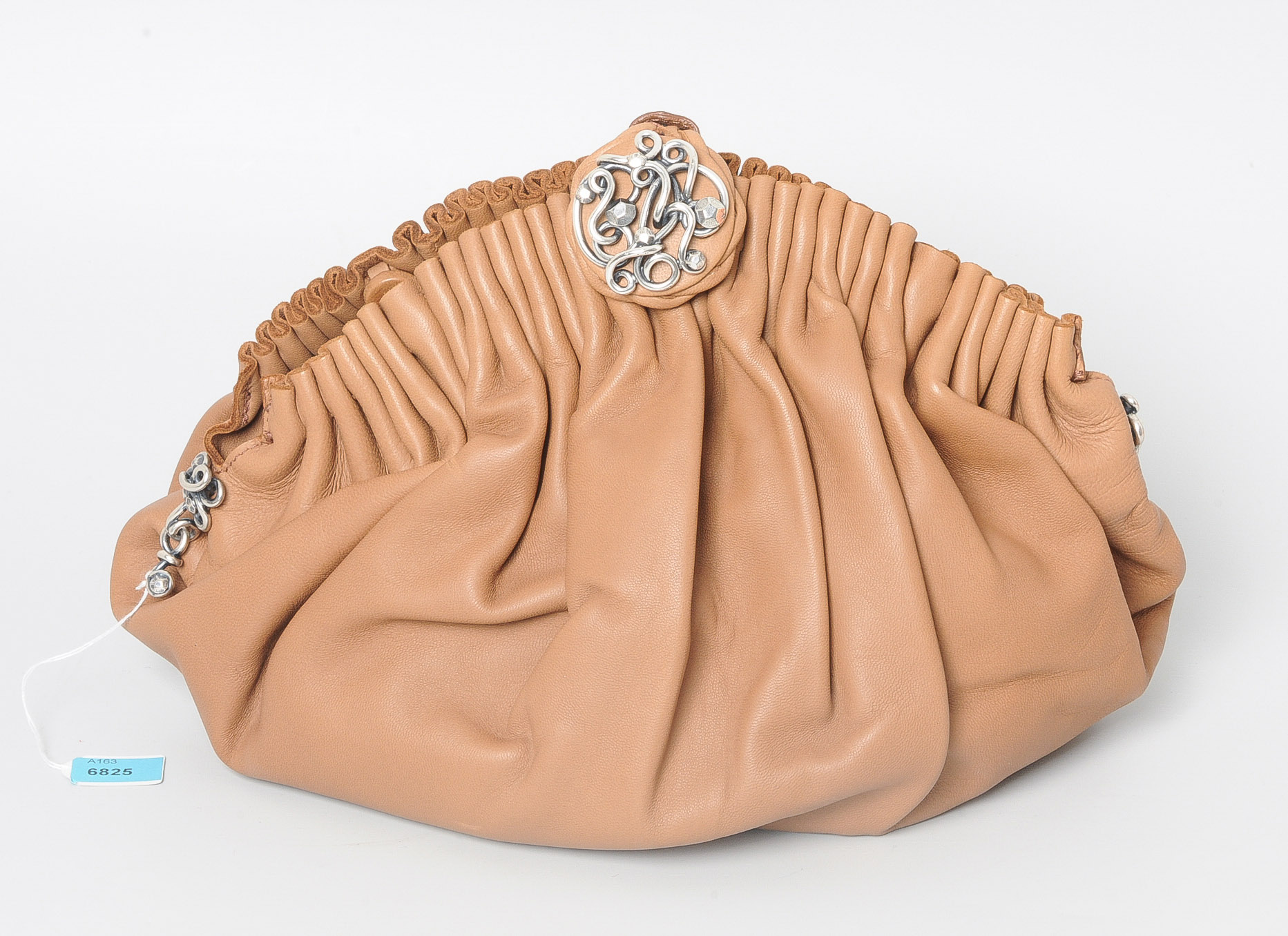 Aus braunem Nappaleder. Silberfarbene, patinierte Metallbeschläge. Magnetverschluss. 30x20 cm.
