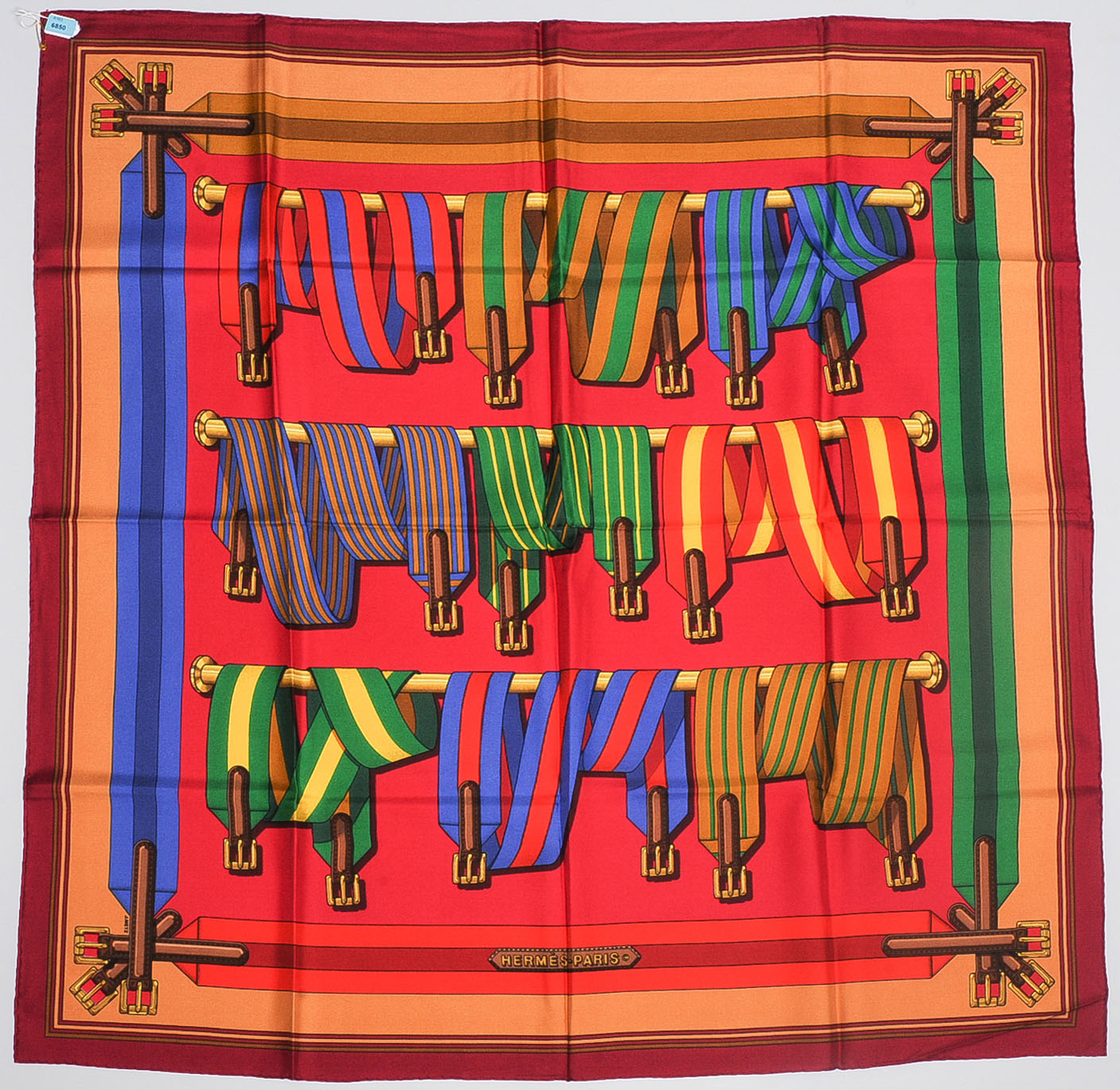 Seide in Rot. Umrandung in Bordeaux und Braun. Entwurf von J. Metz. 86x86 cm.
