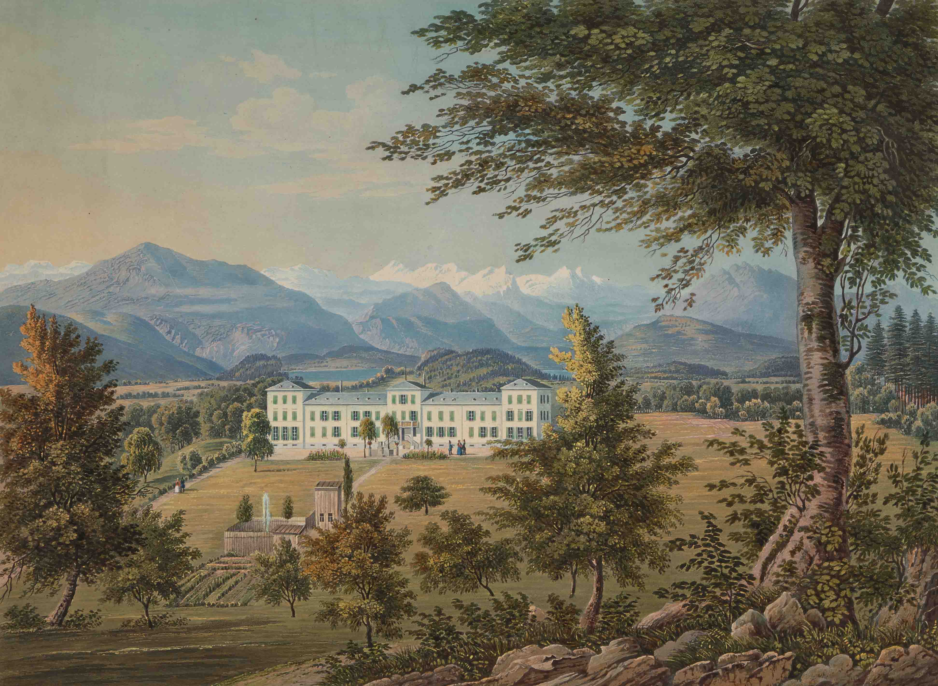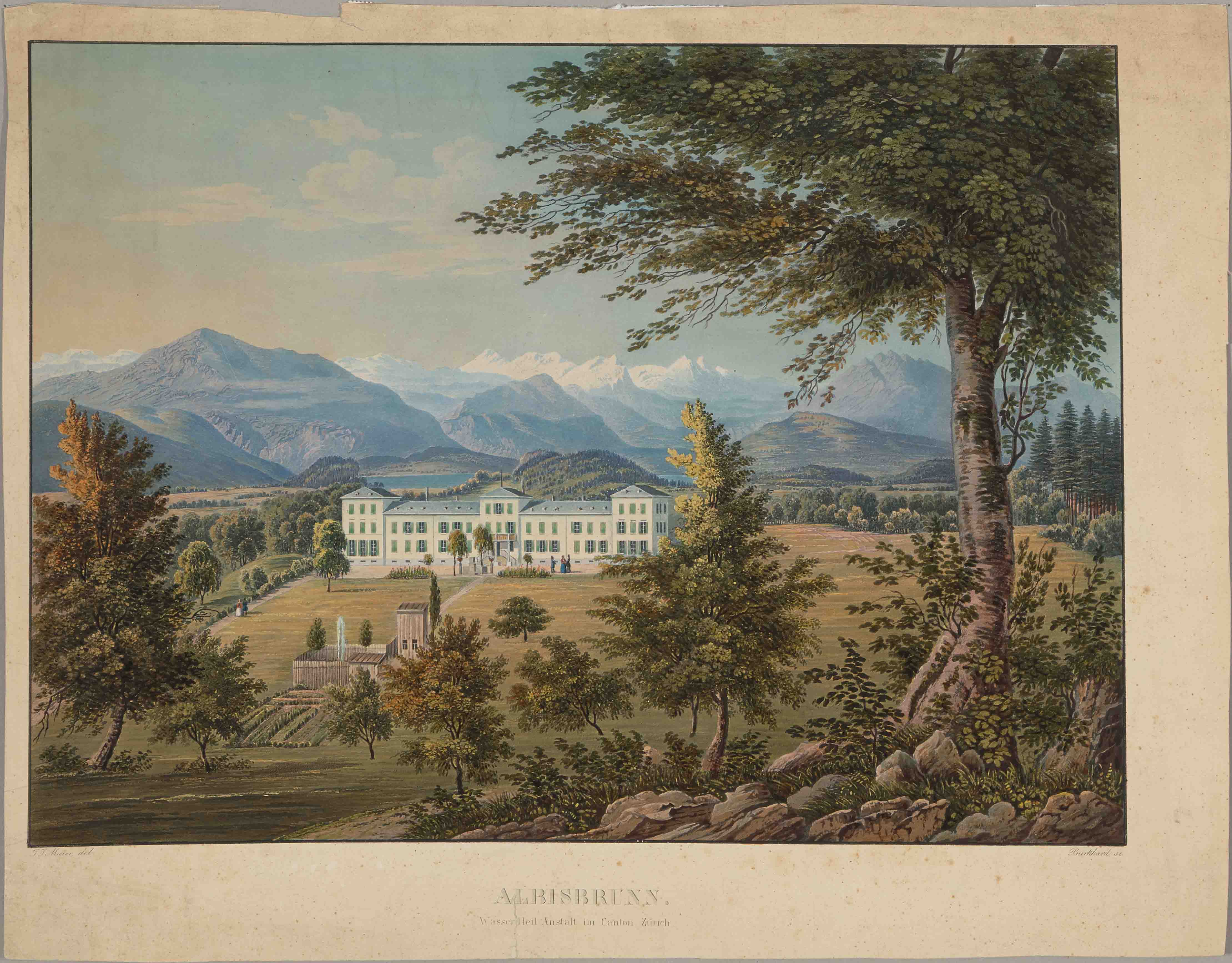 "Albisbrunn. Wasser Heil-Anstalt im Canton Zürich". Kol. Aquatinta von K. Burkhard nach J.J. Meier, um 1845. 29,2x40,3 cm.