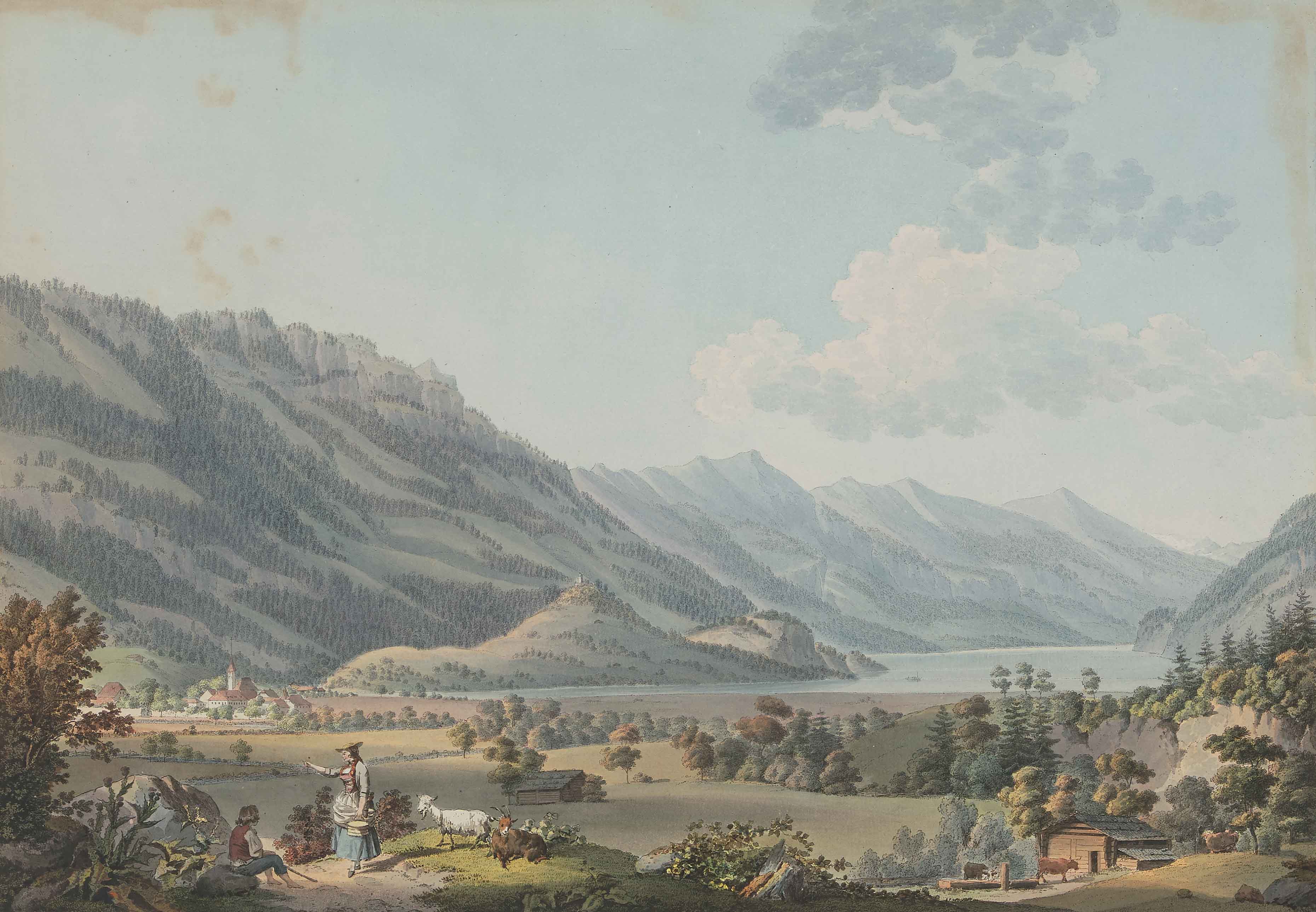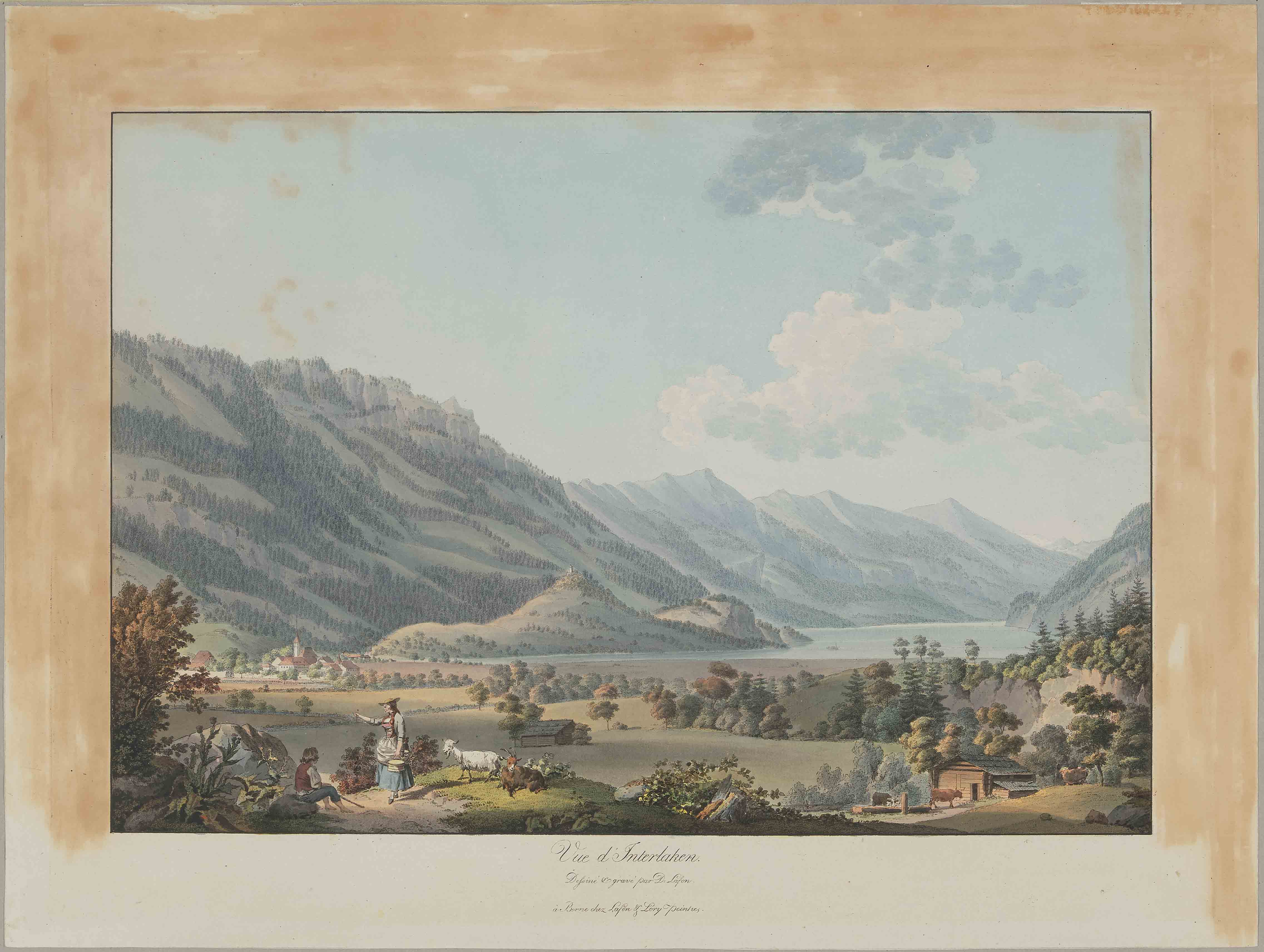 "Vue d'Interlaken". Kol. Umrissradierung von S. D. Lafon, Hrsg. Lafond & Lory père, um 1789. 34,5x50 cm.
