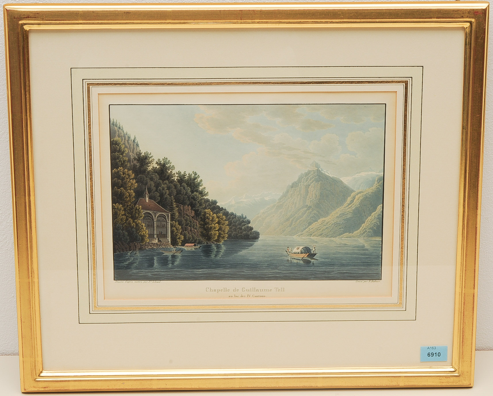 "Chapelle de Guillaume Tell au lac des IV Cantons". Kol. Aquatinta von R. Bodmer nach F. Schmid, um 1825. 16,1x24 cm. Gerahmt.