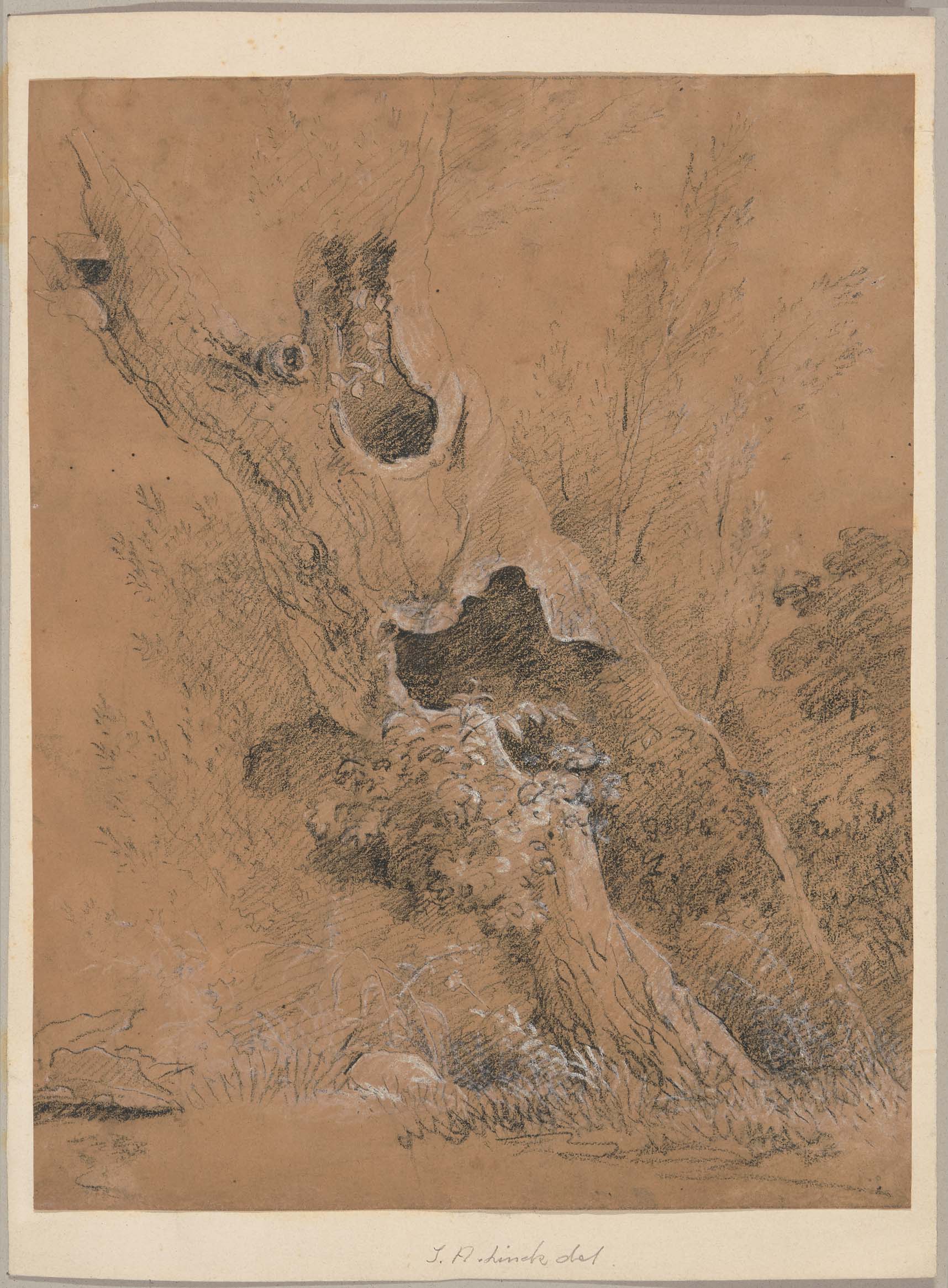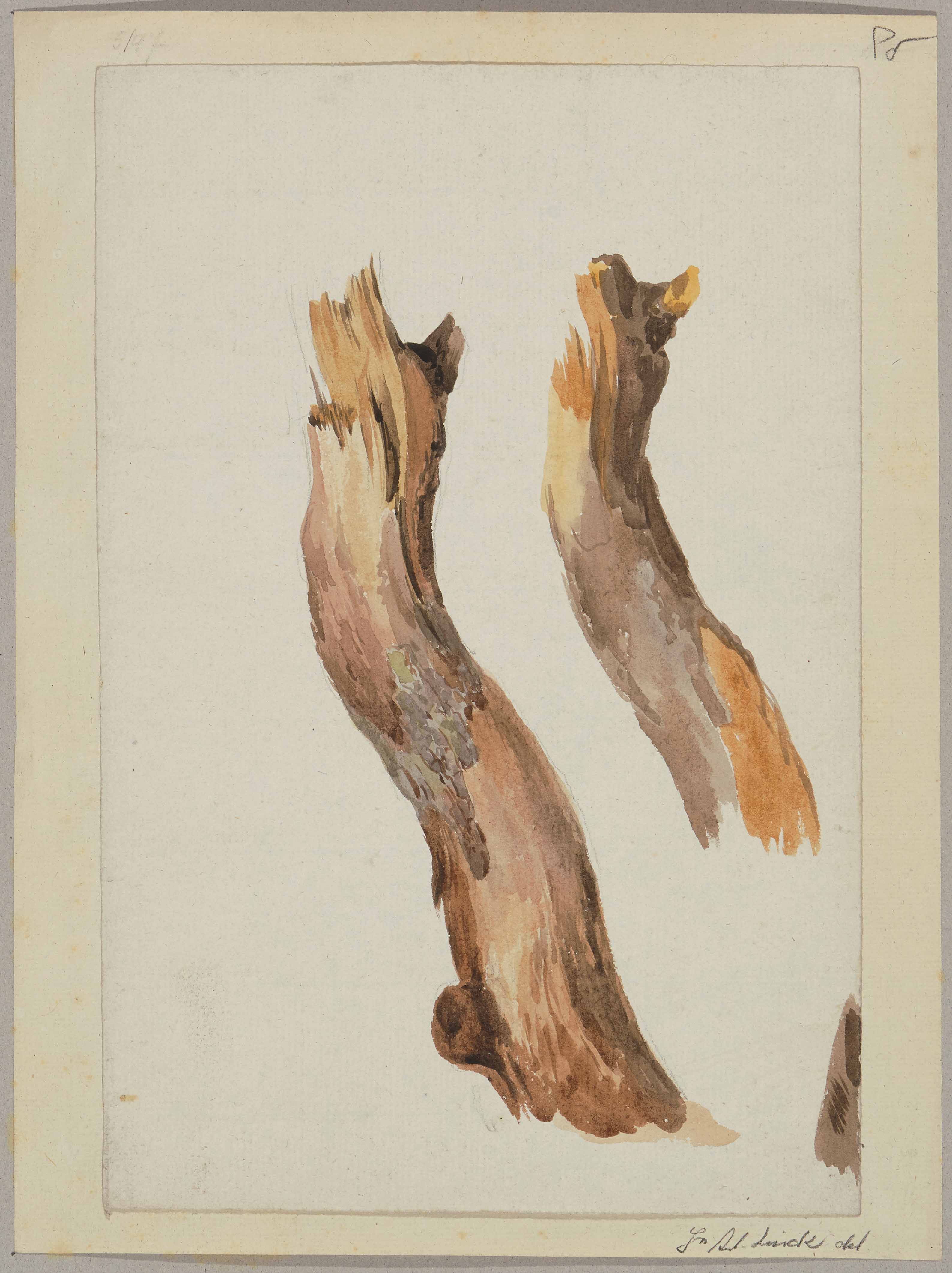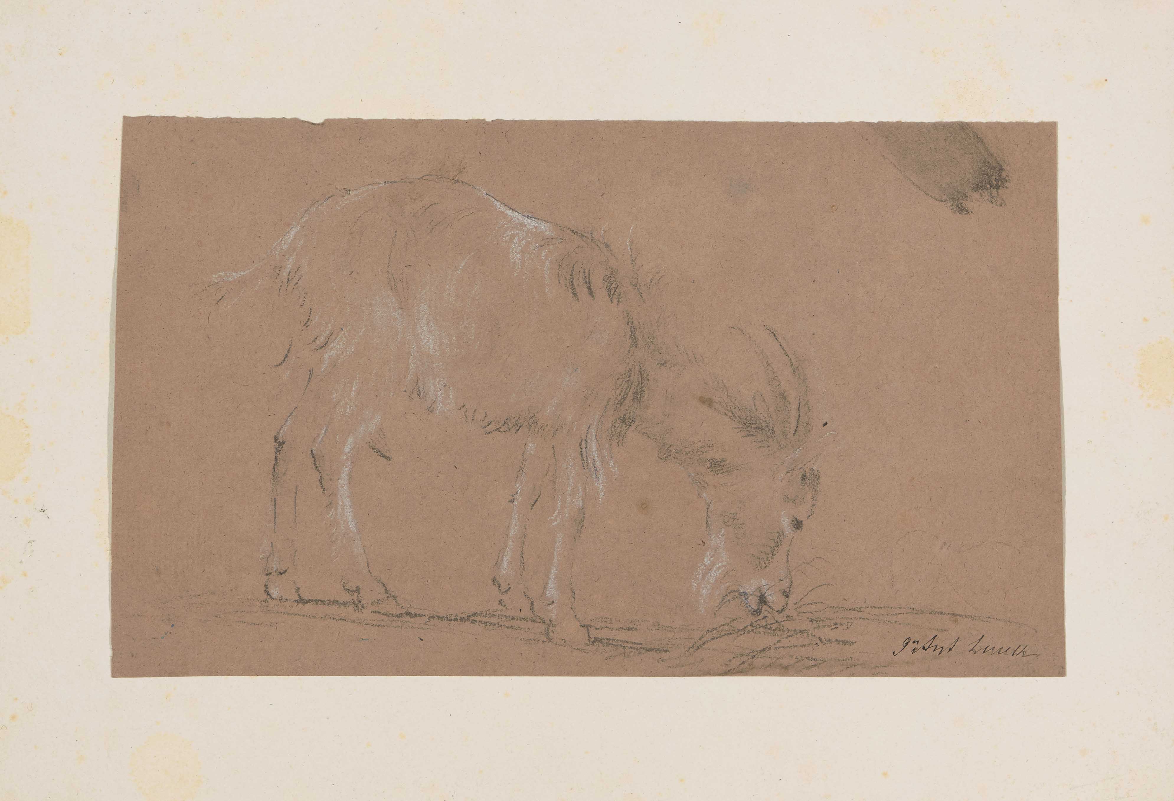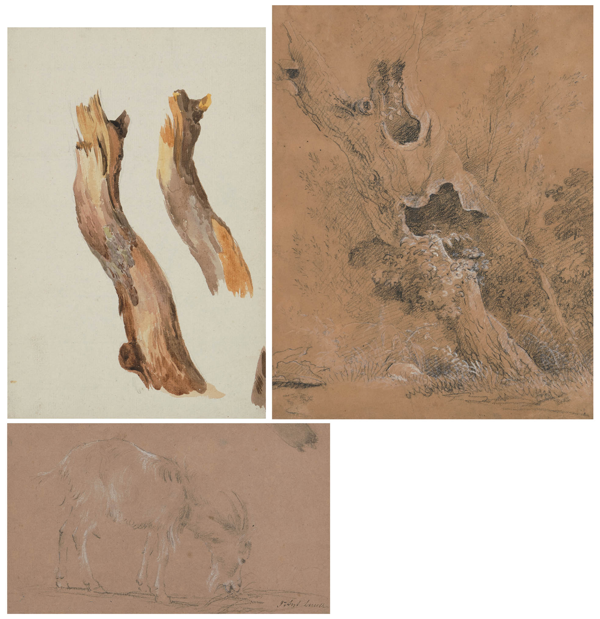 Grasende Ziege. / Weidenstrunk. / Baumstammstudien. 2 weiss gehöhte Kreidezeichnungen und 1 Aquarell. Das erste Blatt unten rechts signiert, die anderen auf Unterlage bezeichnet. 12,5x21,5 cm – 27,5x21 cm.