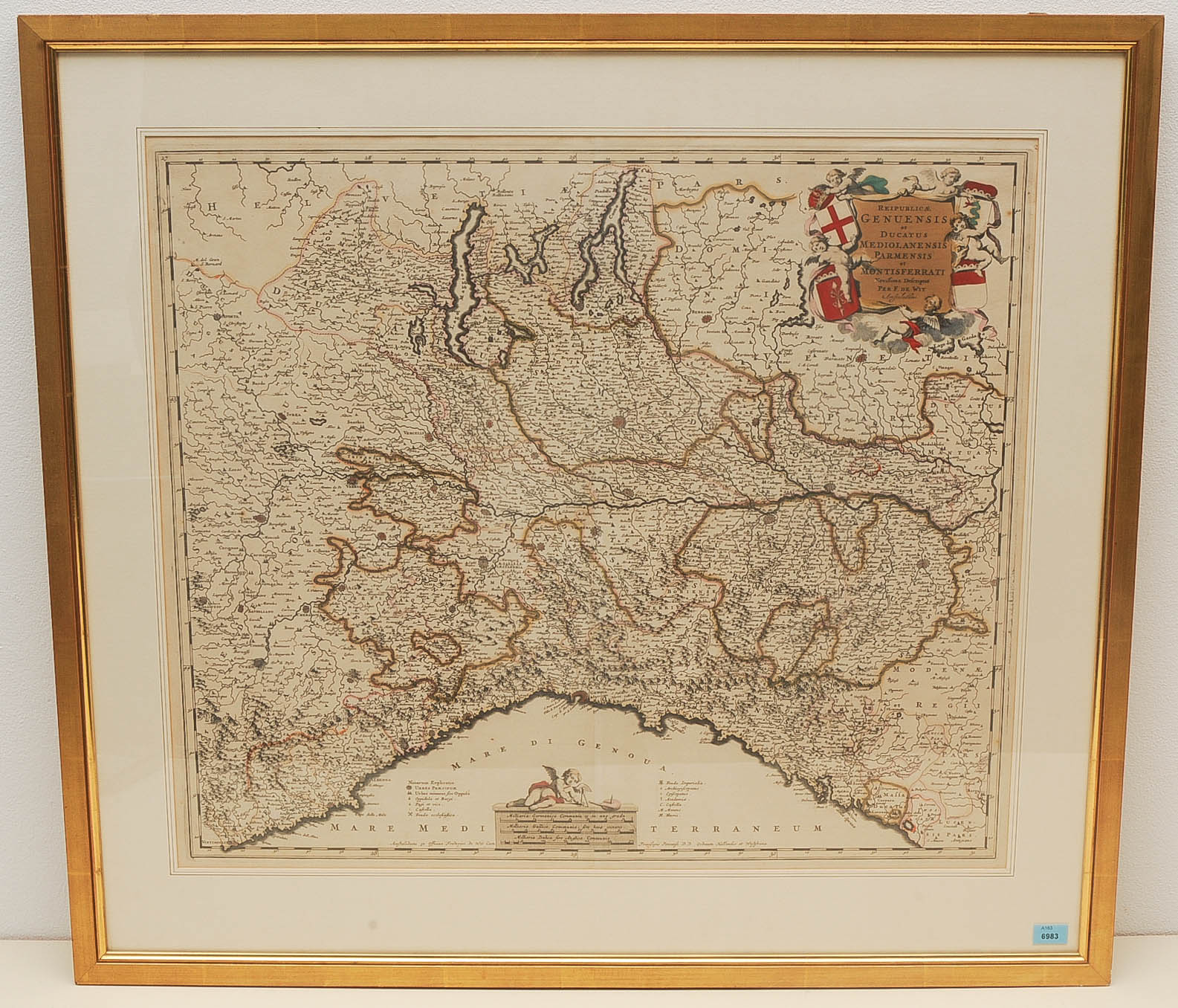 Reipublicae Genuensis et Ducatus Parmensis et Montisferrati. Grenzkol. Kupferstichkarte, mit ausgem. Titelkartusche, bei F. de Wit, um 1670. 50x57,5 cm. Gerahmt.