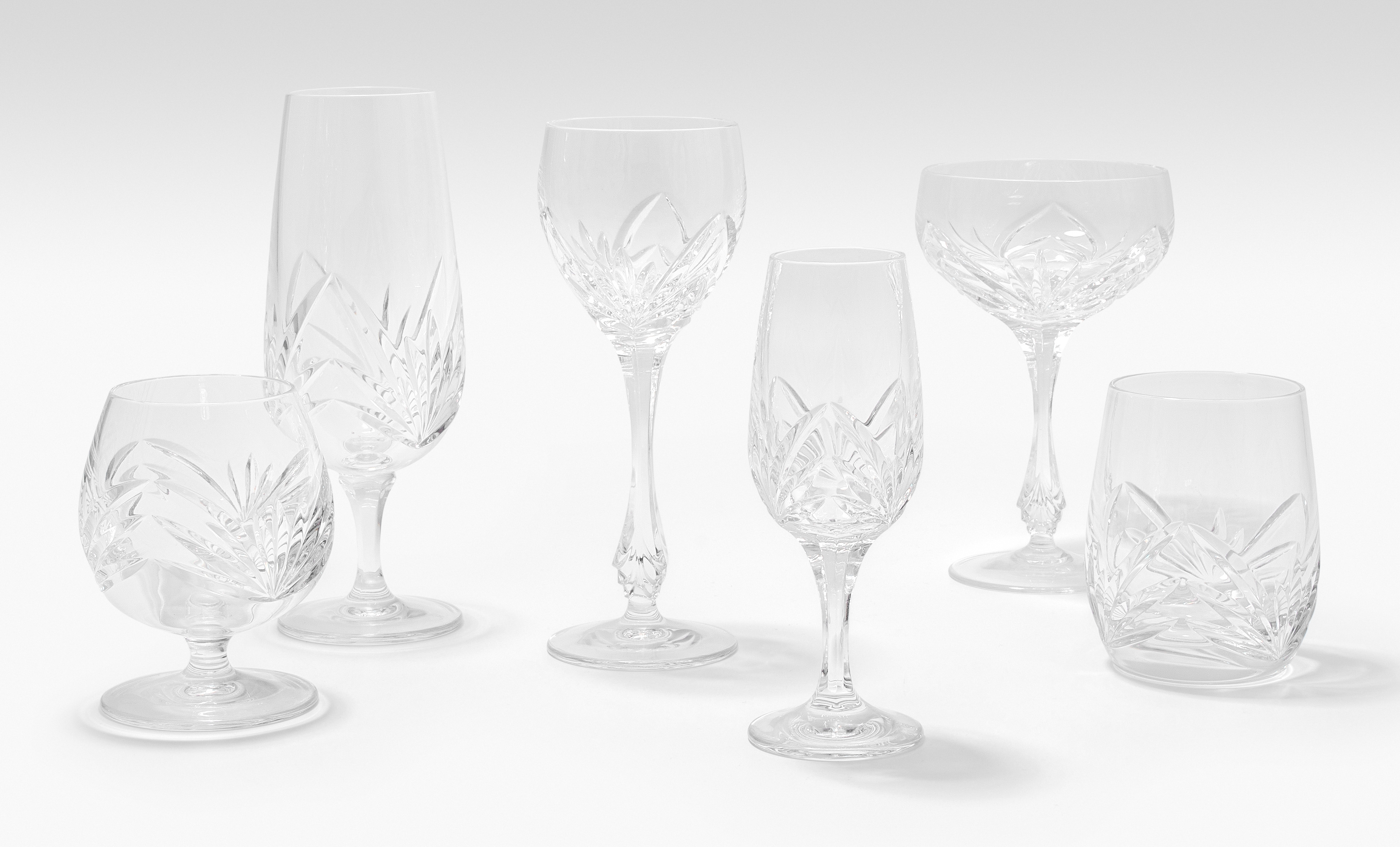 20.Jh. Farbloses Kristallglas. Modell "Noblesse". Schliffdekor. Bestand: 6 Wassergläser, 6 Weissweingläser, 6 Süssweingläser (H 8,5 cm), 6 Champagnerschalen, 6 Becher (H 10 cm), 6 Likörgläser, 6 Cognacgläser. Total 42 Teile.