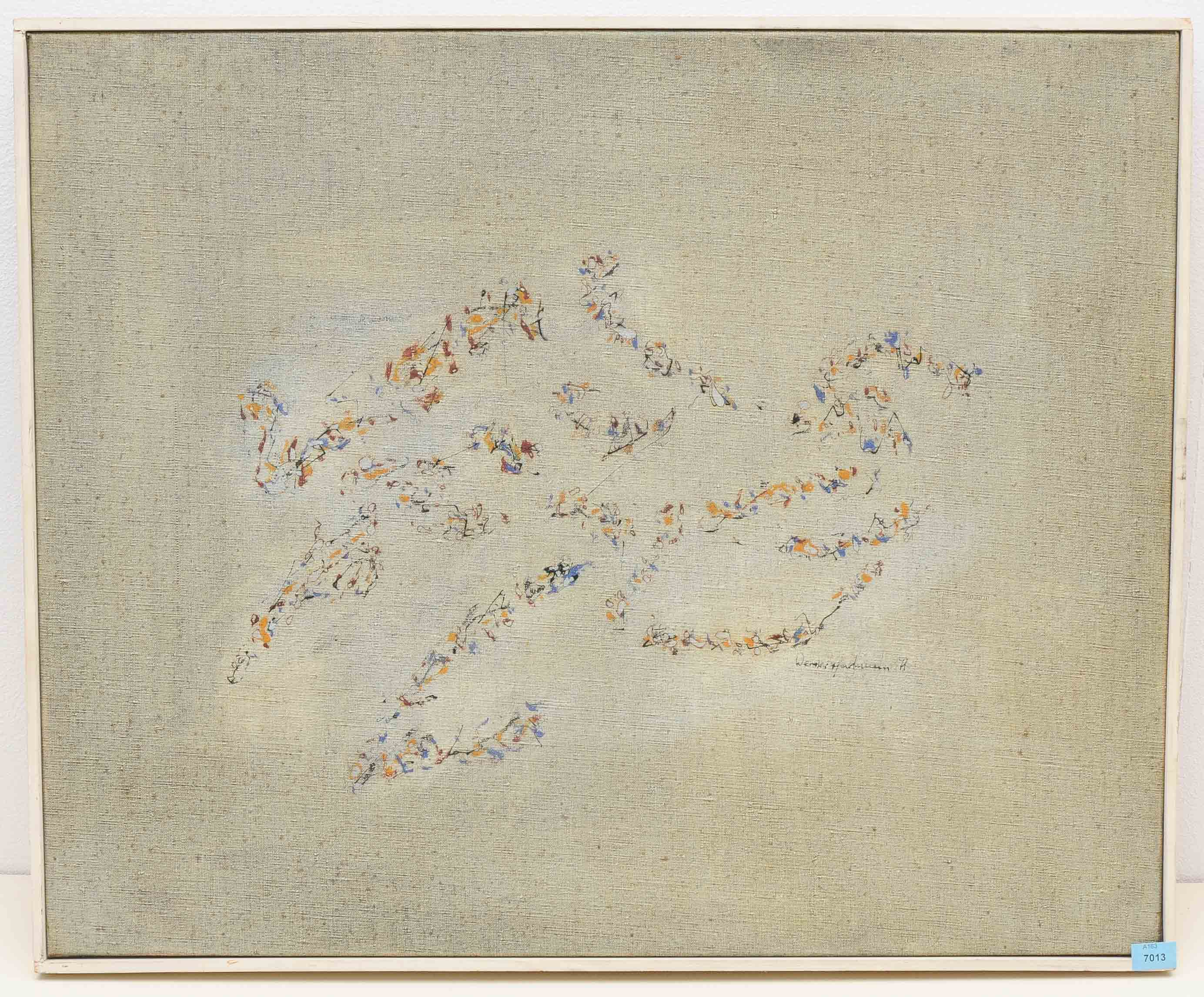 "Getrennte Bewegungen", 1971. Öl auf Leinwand. Unten rechts signiert und datiert, verso auf Künstleretikett bezeichnet. 50x61 cm.