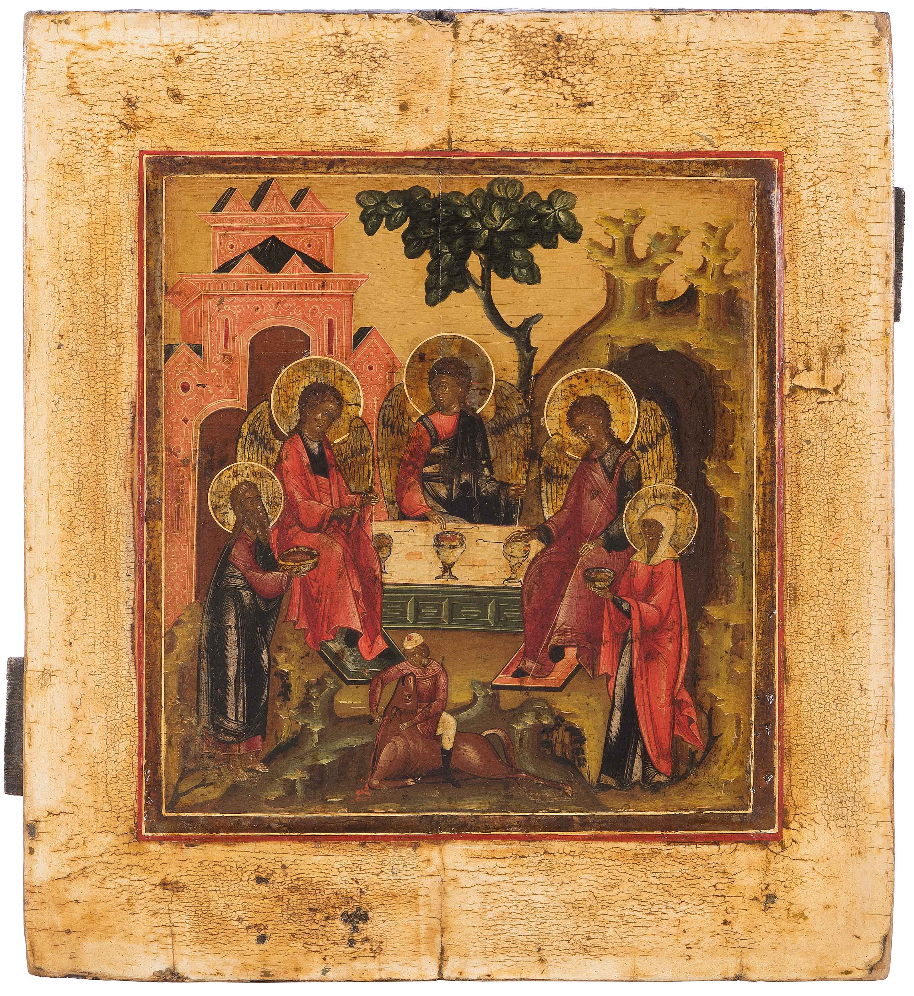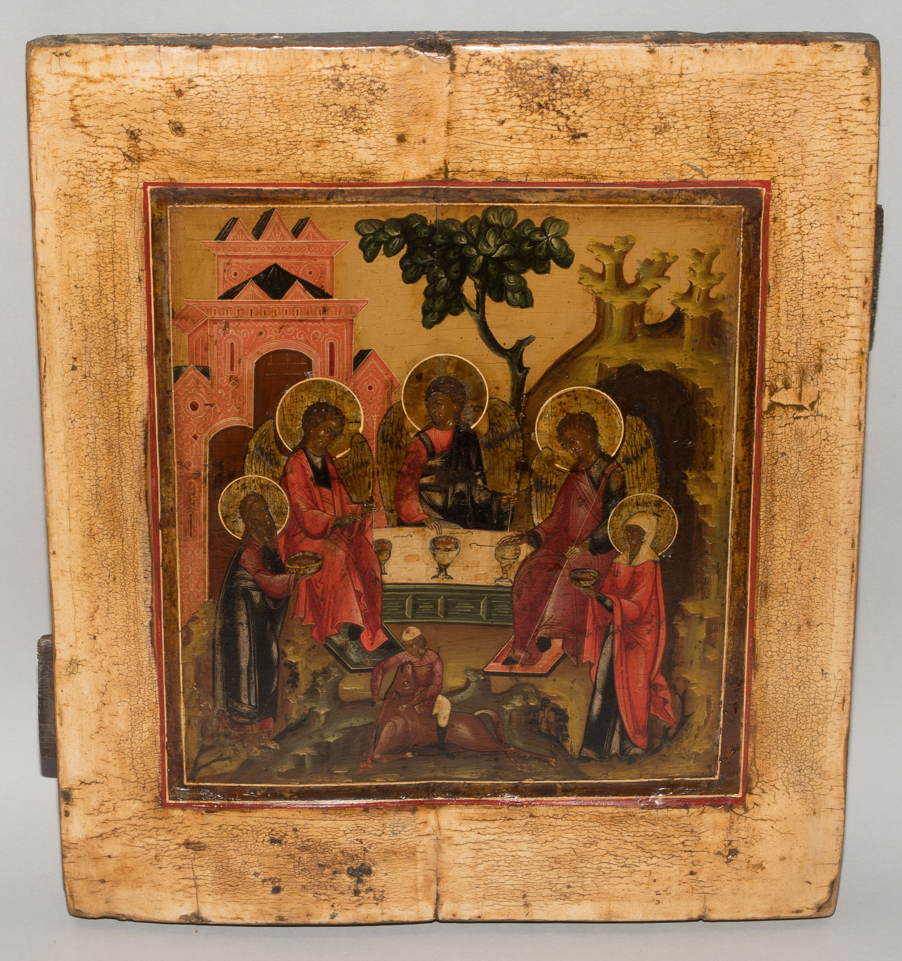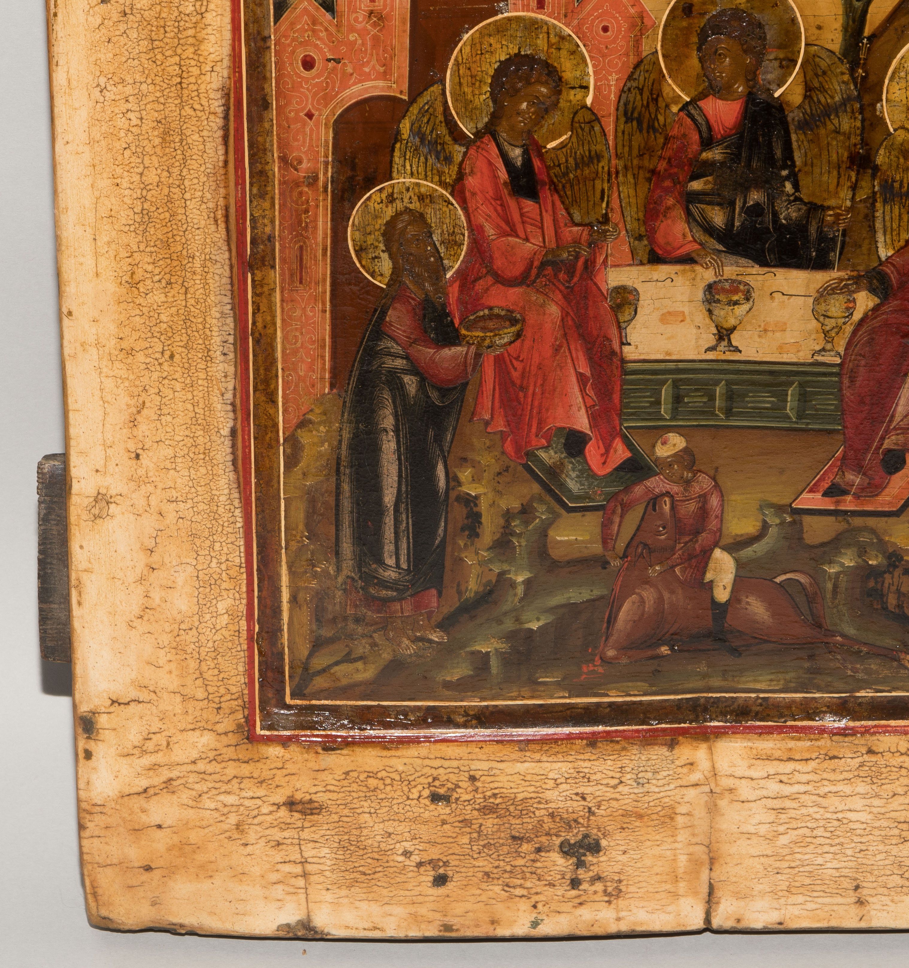 Russisch, 18.Jh. Tempera über Kreidegrund auf Holz. Im vertieften Mittelfeld Darstellung der drei Engel am gedeckten Tisch, bewirtet von Sara und Abraham. Im Vordergrund schlachtet ein Diener einen Ochsen. Im Hintergrund Architekturkulisse, Eiche von Mamre und zerklüftete Felsen. 35x31 cm.