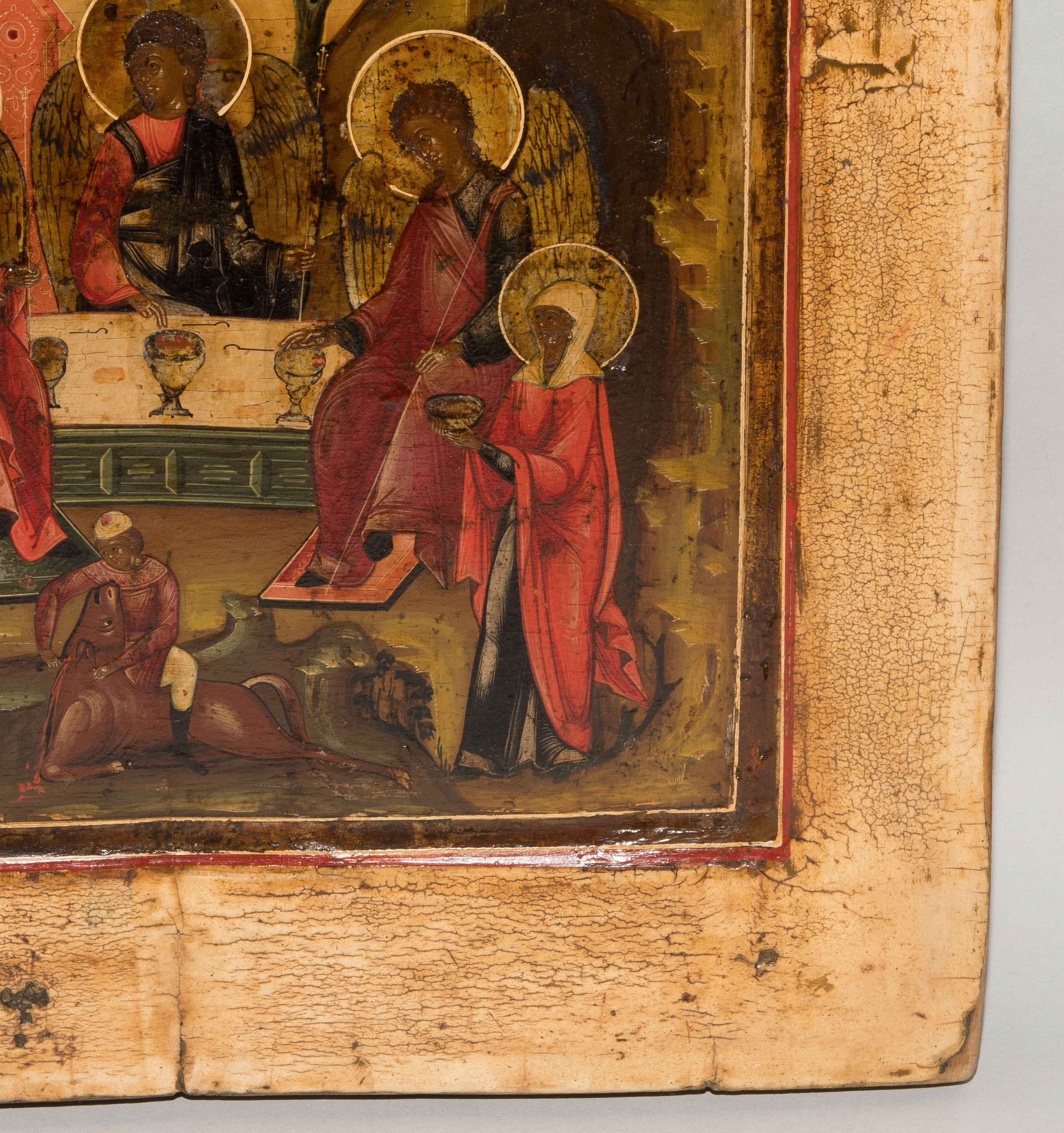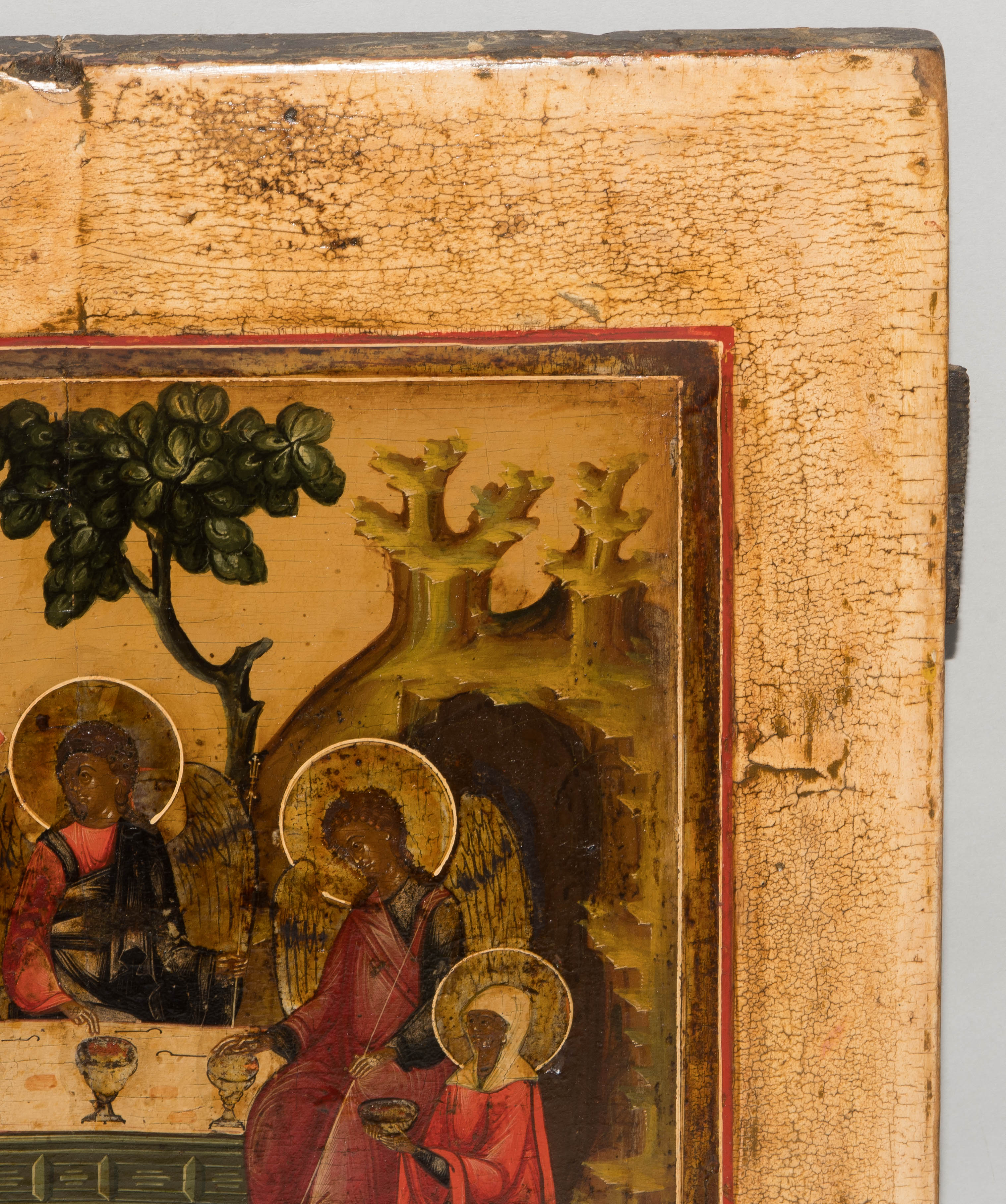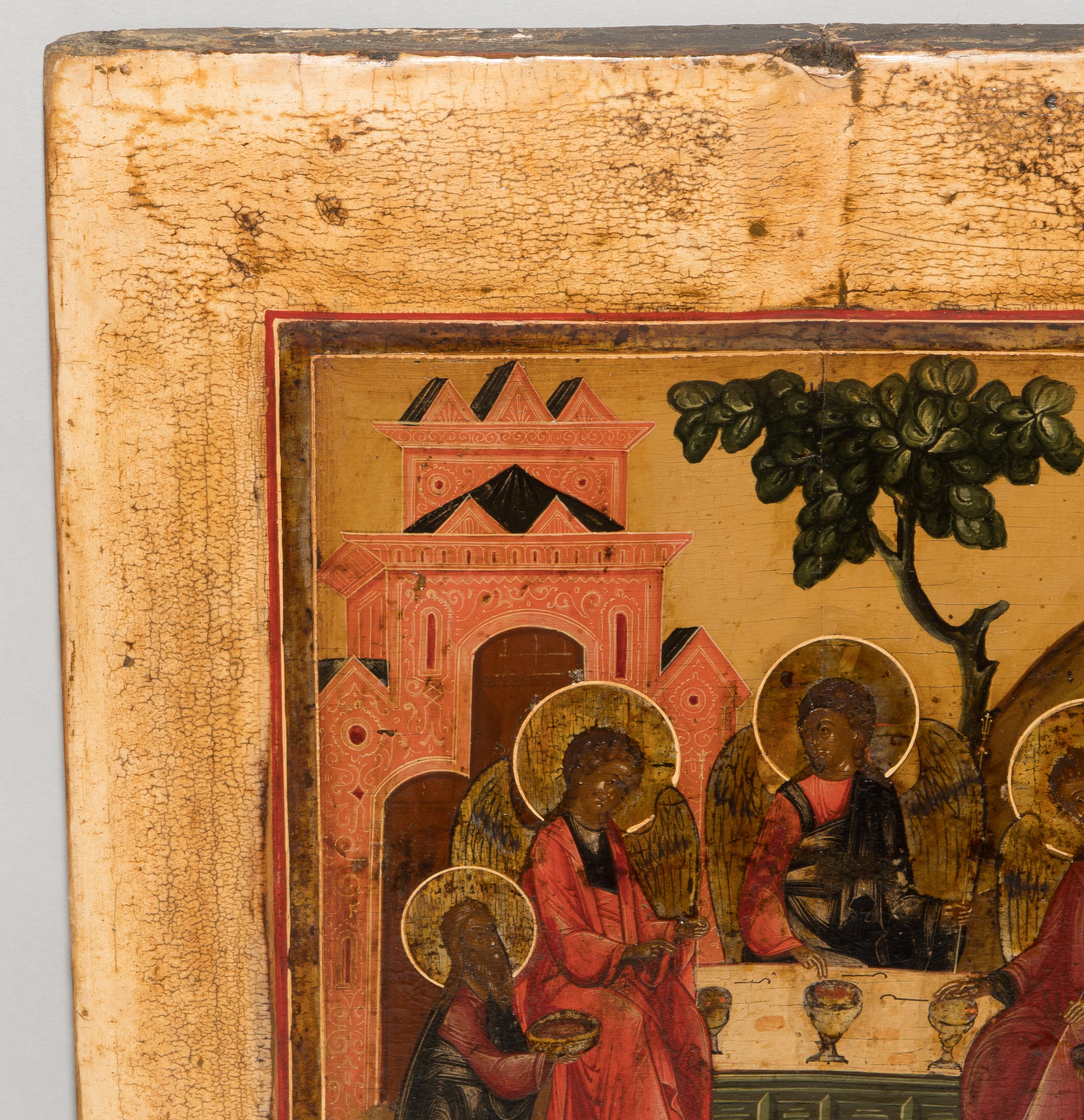 Russisch, 18.Jh. Tempera über Kreidegrund auf Holz. Im vertieften Mittelfeld Darstellung der drei Engel am gedeckten Tisch, bewirtet von Sara und Abraham. Im Vordergrund schlachtet ein Diener einen Ochsen. Im Hintergrund Architekturkulisse, Eiche von Mamre und zerklüftete Felsen. 35x31 cm.