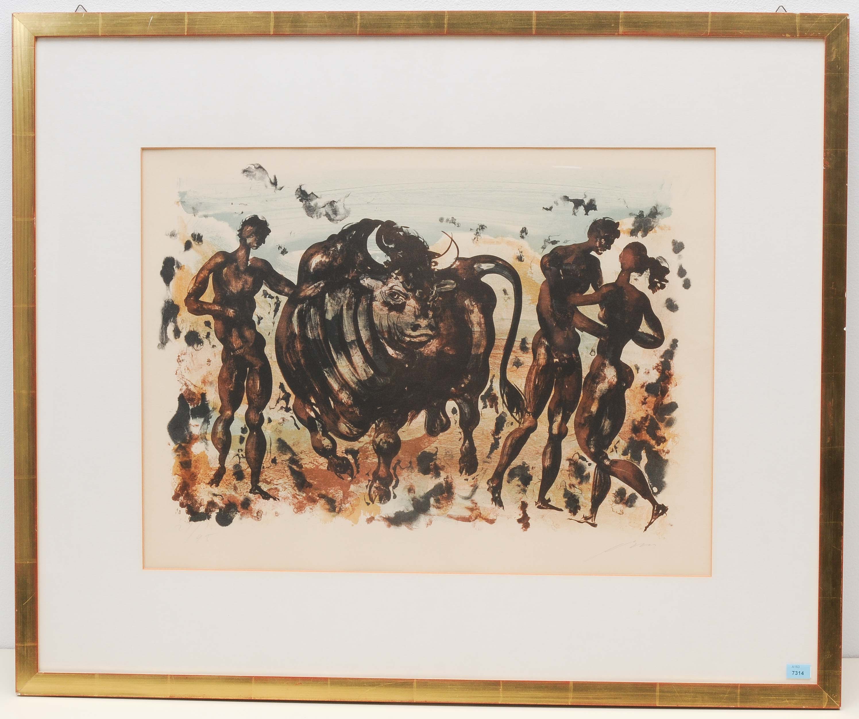 "Ländliche Szene". 1955. Farblithographie. 21/95. Unten rechts signiert. Lichtmass 44x59 cm. Gerahmt.