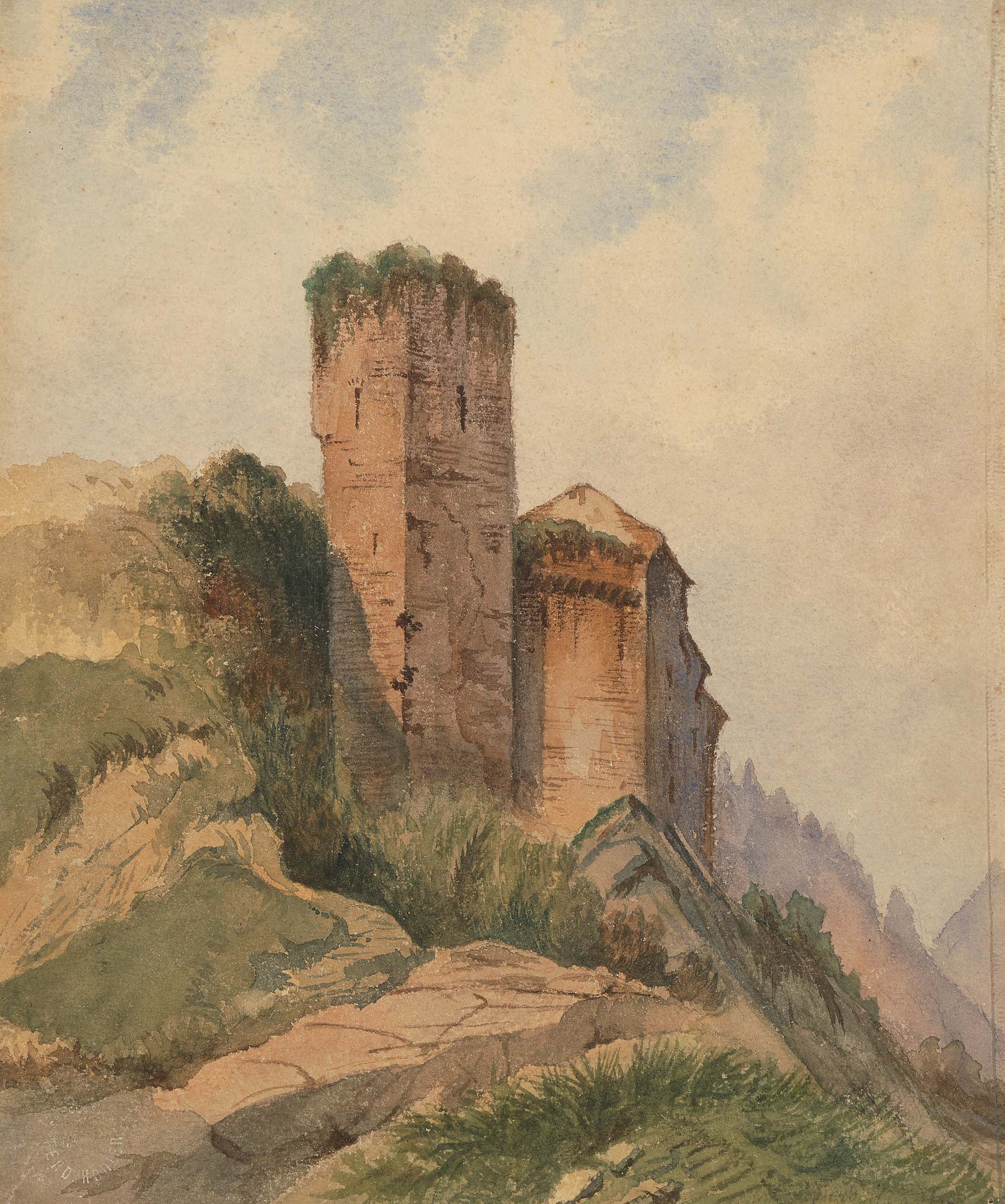 Burgruine. Um 1872. Aquarell auf Papier. Unten links mit Nachlassstempel: "Succession Ferd. Hodler". Unten rechts mit Stempelsignatur. Blattgrösse 31,8x25,8 cm. Gerahmt.