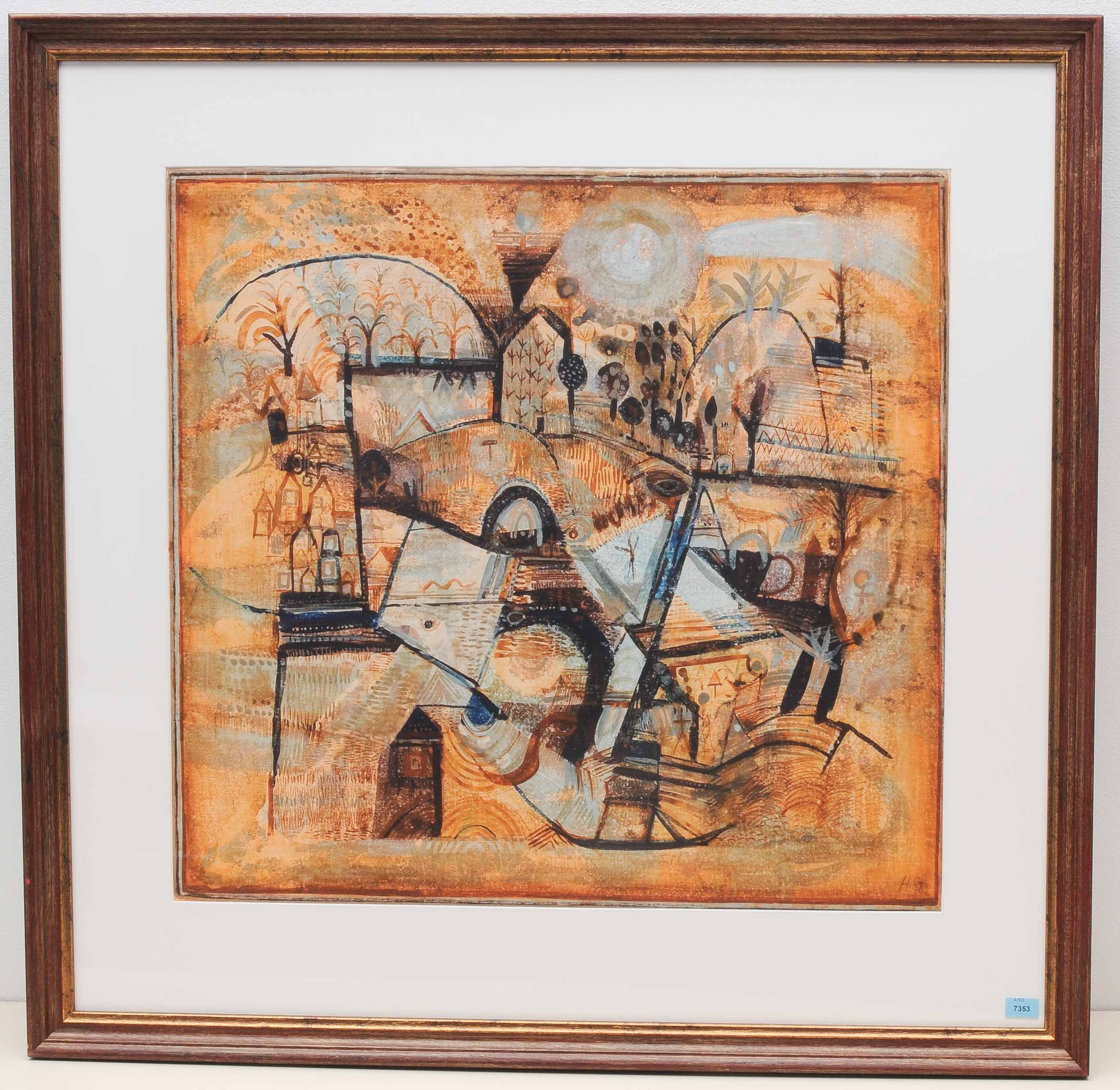 Landschaft. Mischtechnik auf Papier. Unten rechts monogrammiert. Lichtmass 54,5x57 cm. Gerahmt.