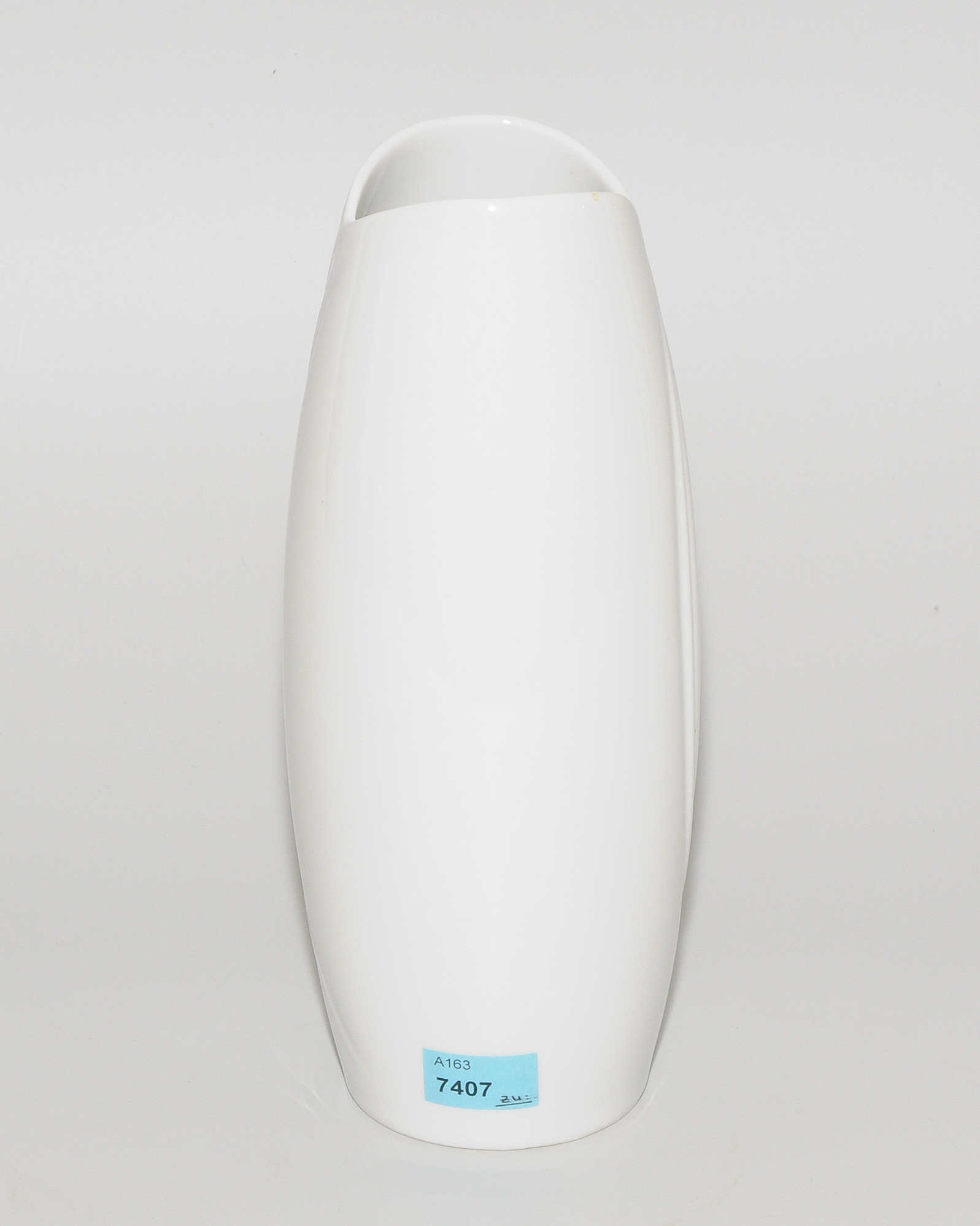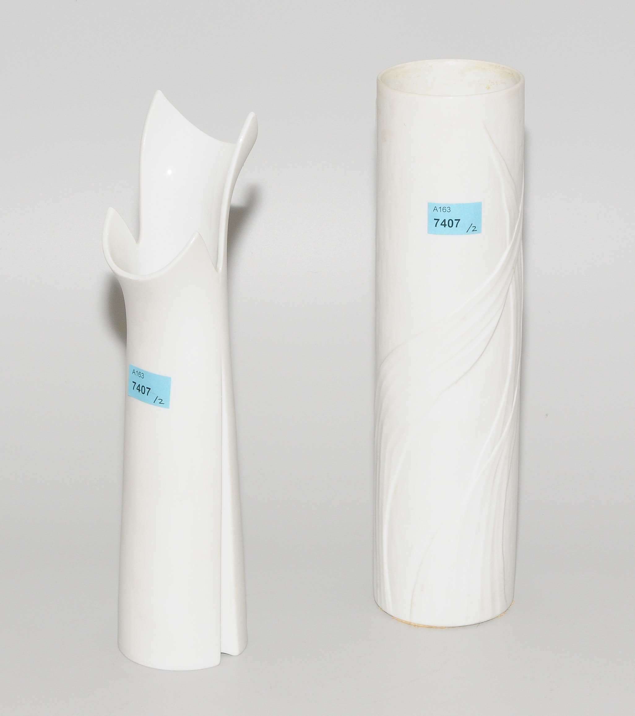 (1) Entwurf von Lino Sabattini. Firmenmarke, Künstlersignatur. Biskuitporzellan, innen glasiert. H 26 cm. (2) Firmenmarke. Biskuitporzellan, innen glasiert. Zylindrische Form mit reliefiertem Blattdekor. H 26 cm. Beigegeben: Vase aus weissem Porzellan. Mitterteich Bavaria. H 21,5 cm.