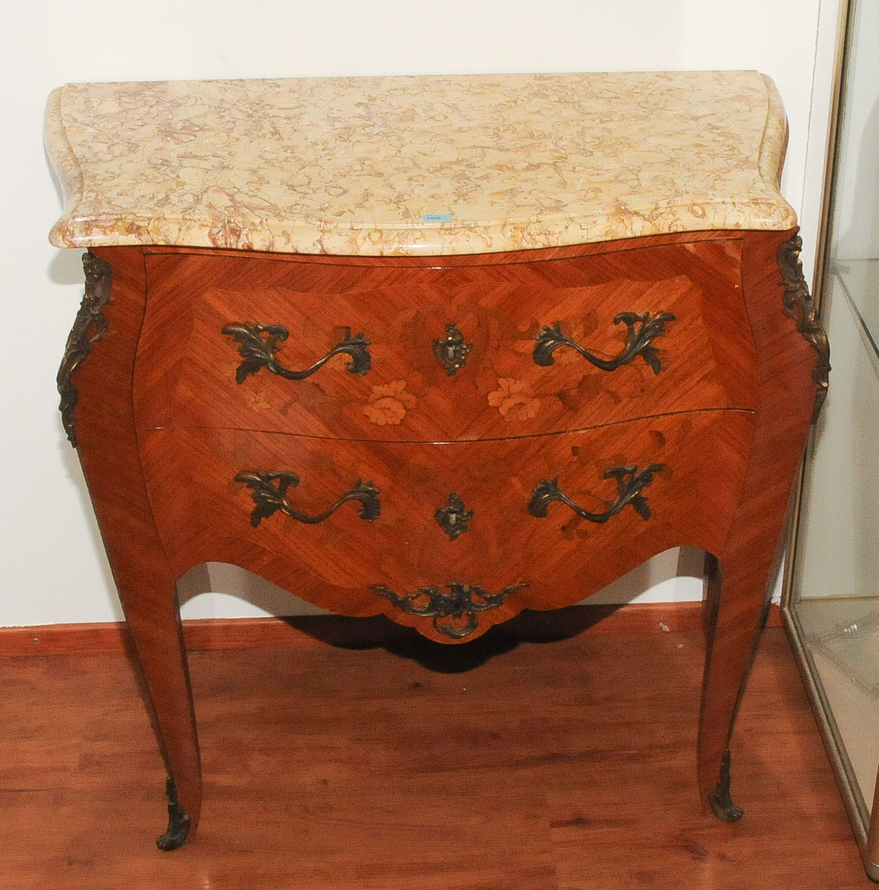 Louis XV-Stil, 20. Jh. Rosenholz, Ahorn, Marmor. Zweischübiger Korpus auf geschweiften Beinen. Dreiseitig gefeldert furniert mit floralem Dekor intarsiert. Marmor Beige-Braun gemustert. Gebrauchsspuren. 80x42x78 cm.